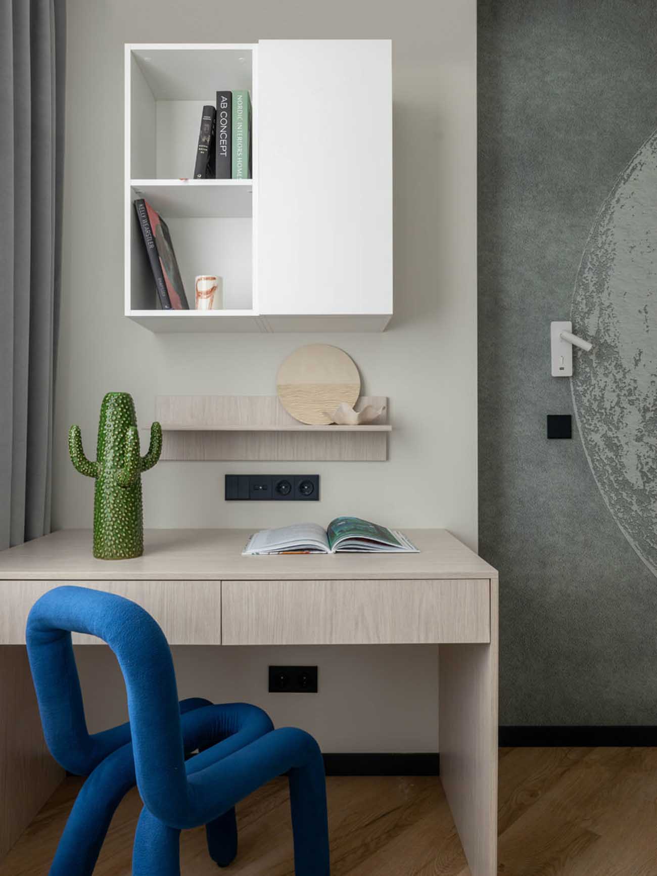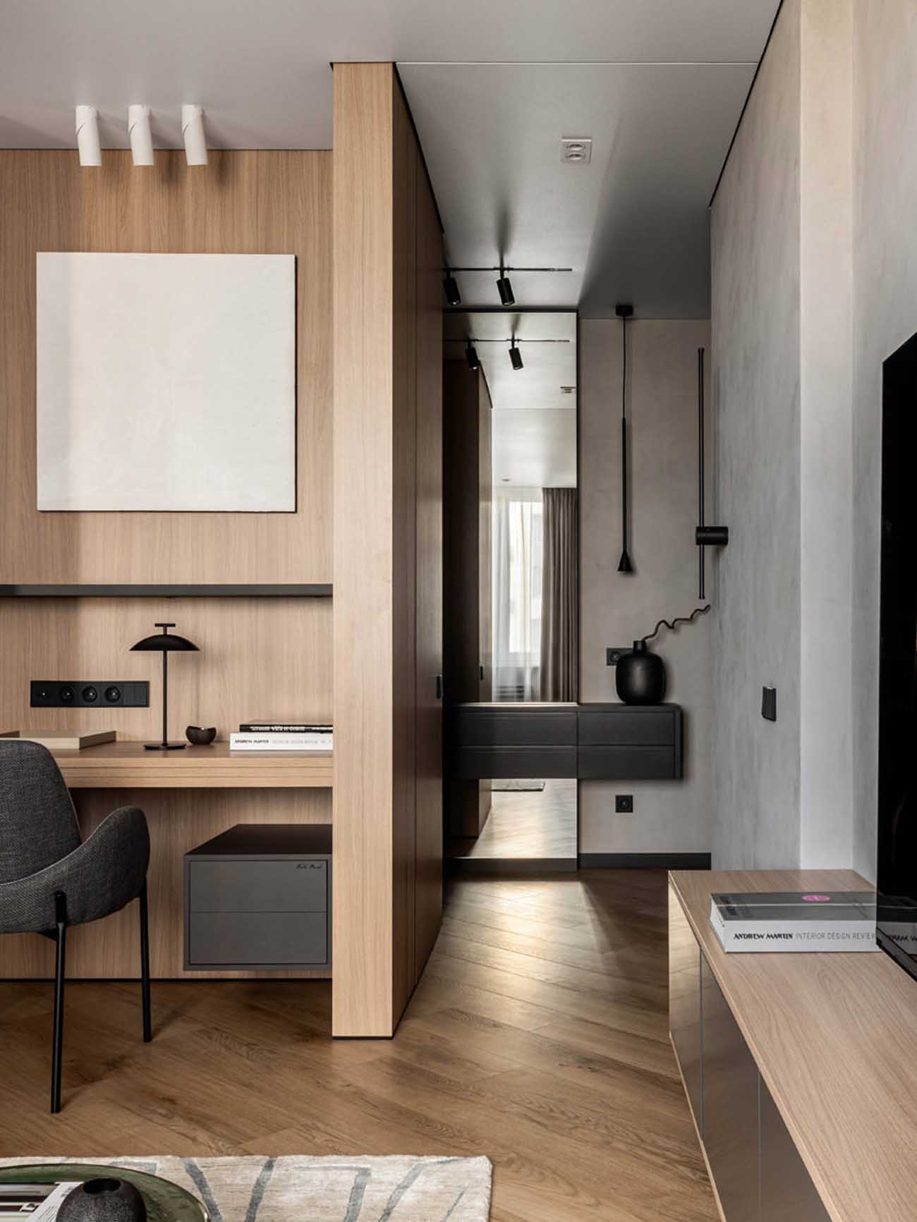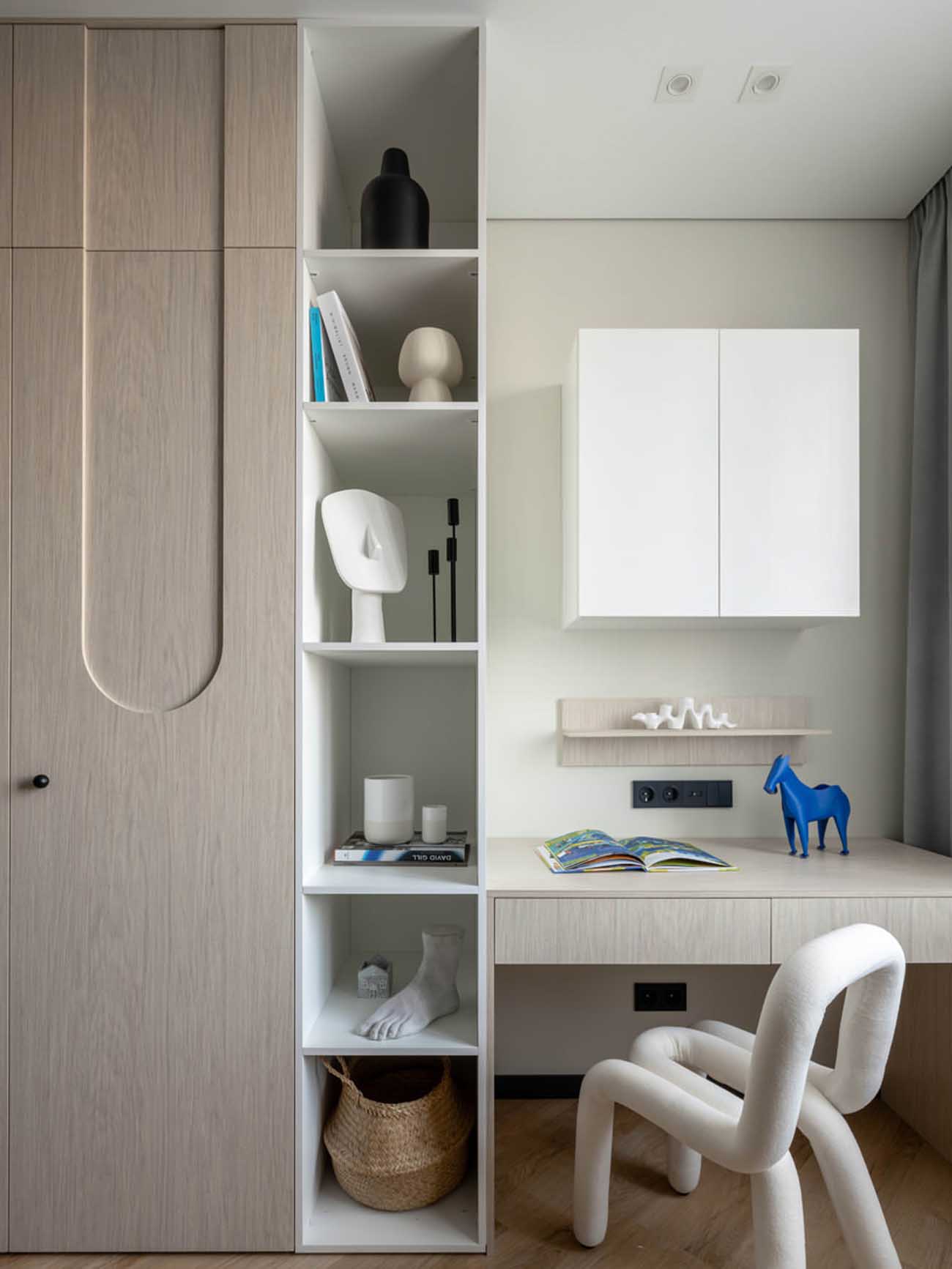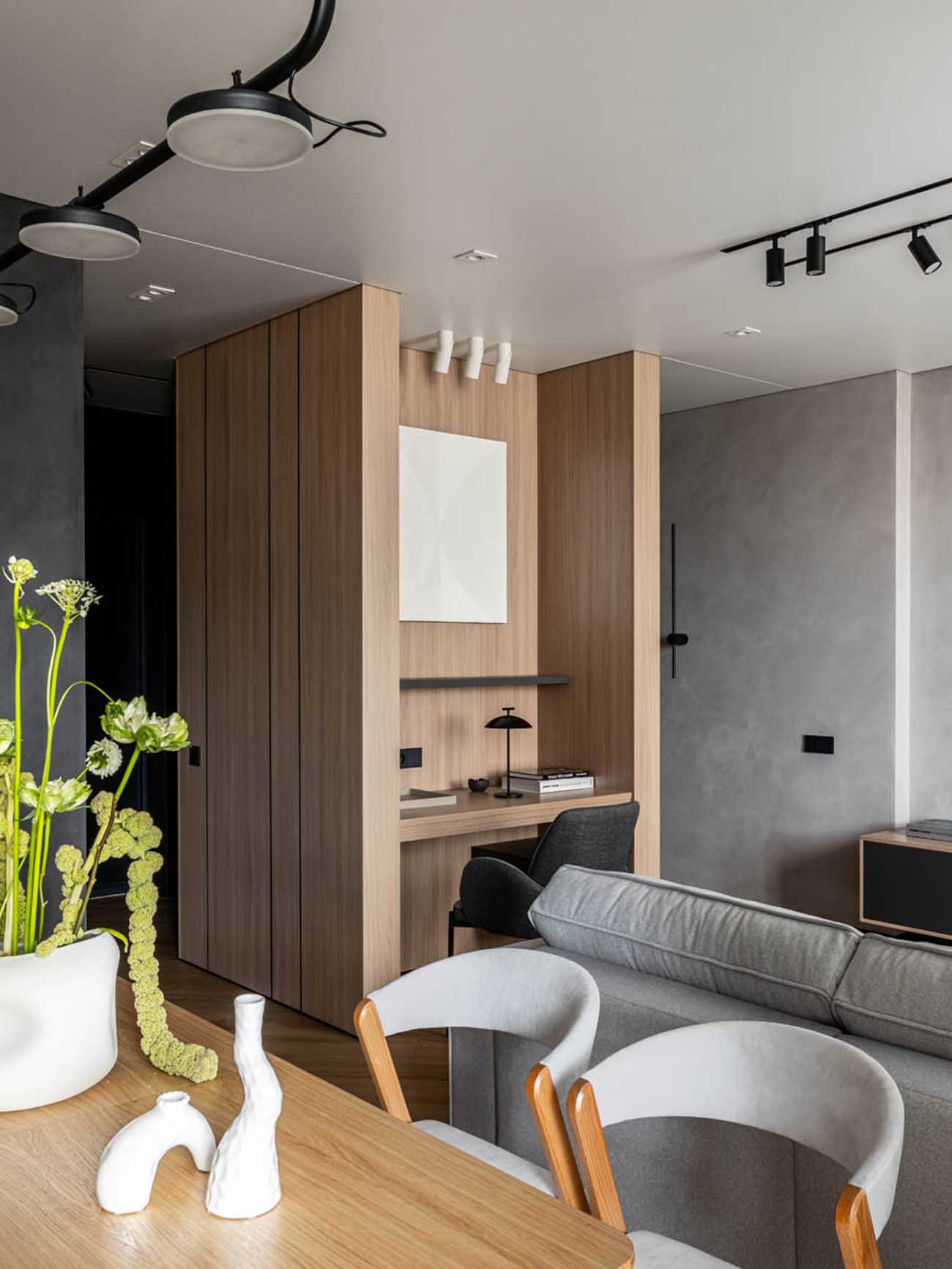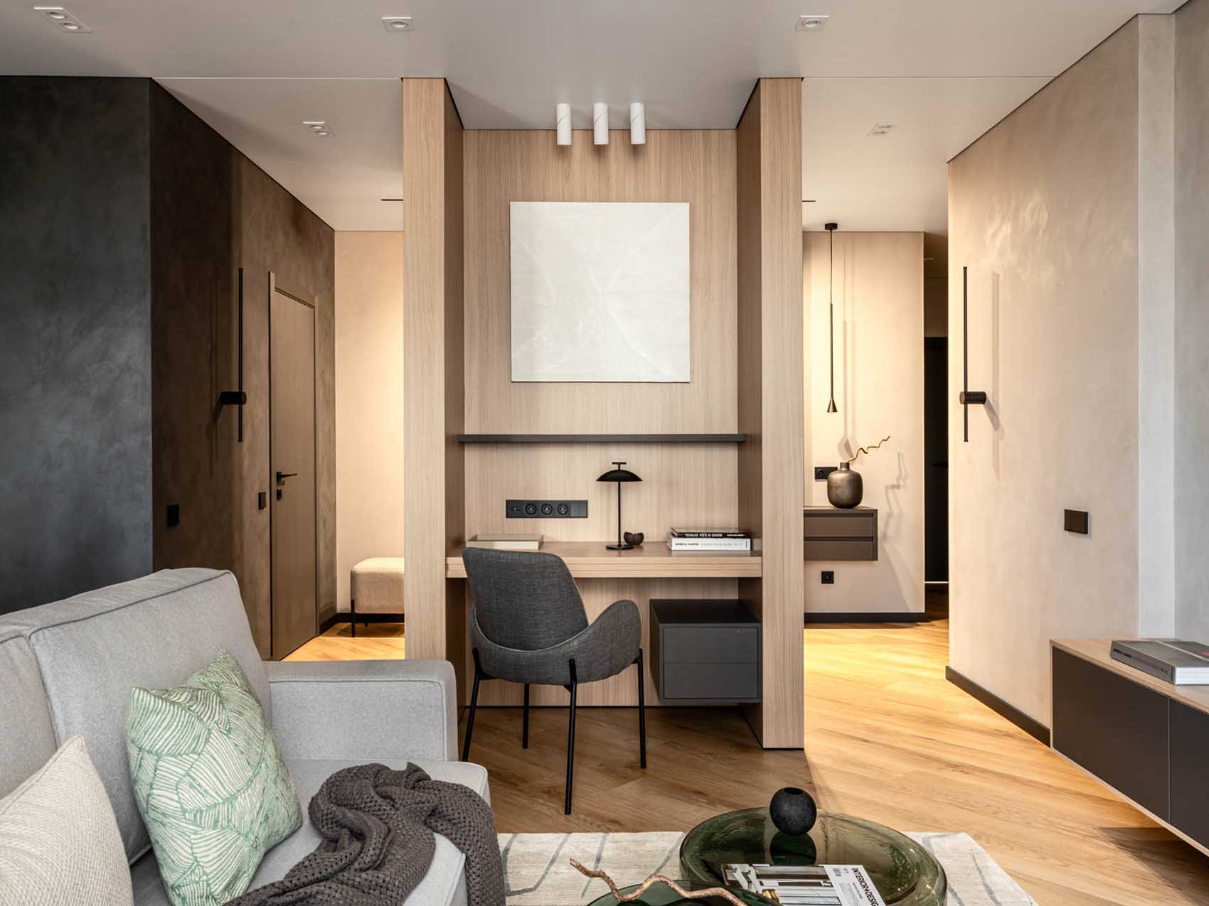 A tervező egyfajta „beugró” fülkeként alakította ki az édesapa otthoni irodáját, amely így szerves része a tárolórendszernek, mégis intimitást biztosít. Ez a kialakítás lehetővé teszi a zavartalan munkavégzést anélkül, hogy a lakás többi részében zajló életet – például a kisgyermekek pihenését – megzavarná. A fával burkolt fülke rejtett világítása és ergonomikus kialakítása a funkciót és a designt ötvözi.