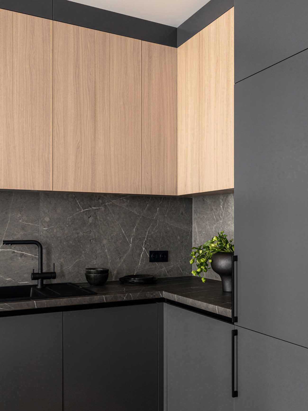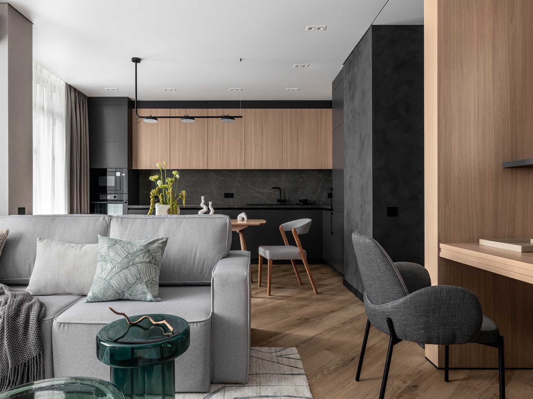 A konyhabútor sötét, kőhatású alsó elemei és a felső szekrények fa frontjai vizuálisan tagolják a teret, miközben a pult fölötti hátfal finom erezete eleganciát kölcsönöz a helyiségnek. A nappali zónájában a puha, világosszürke kárpitozású kanapé és a zöld üvegből készült lerakóasztalok oldják a szigorú vonalakat. A tér egységét a parketta meleg tónusa fogja össze, amelyen a természetes fény lágyan törik meg.