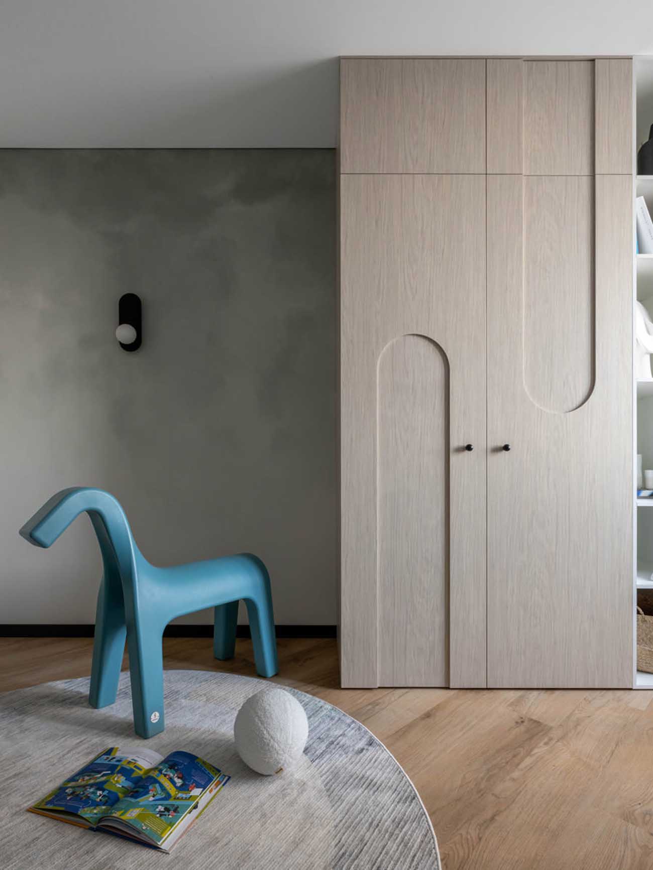 A gyerekszoba kialakításánál a fő szempont az időtállóság és a semlegesség volt. Mivel a tervezéskor a második gyermek neme még nem volt ismert, a belsőépítész olyan alapot álmodott meg, amely egy ötéves kislány és egy újszülött számára is komfortos. A dekoráció itt finoman lép be a térbe: a falon lévő freskó motívumai visszaköszönnek a szőnyeg mintázatában, a meleg tapintású textíliák és a gondosan válogatott kiegészítők pedig barátságos, gyermeki, mégsem túlzóan színes közeget teremtenek.