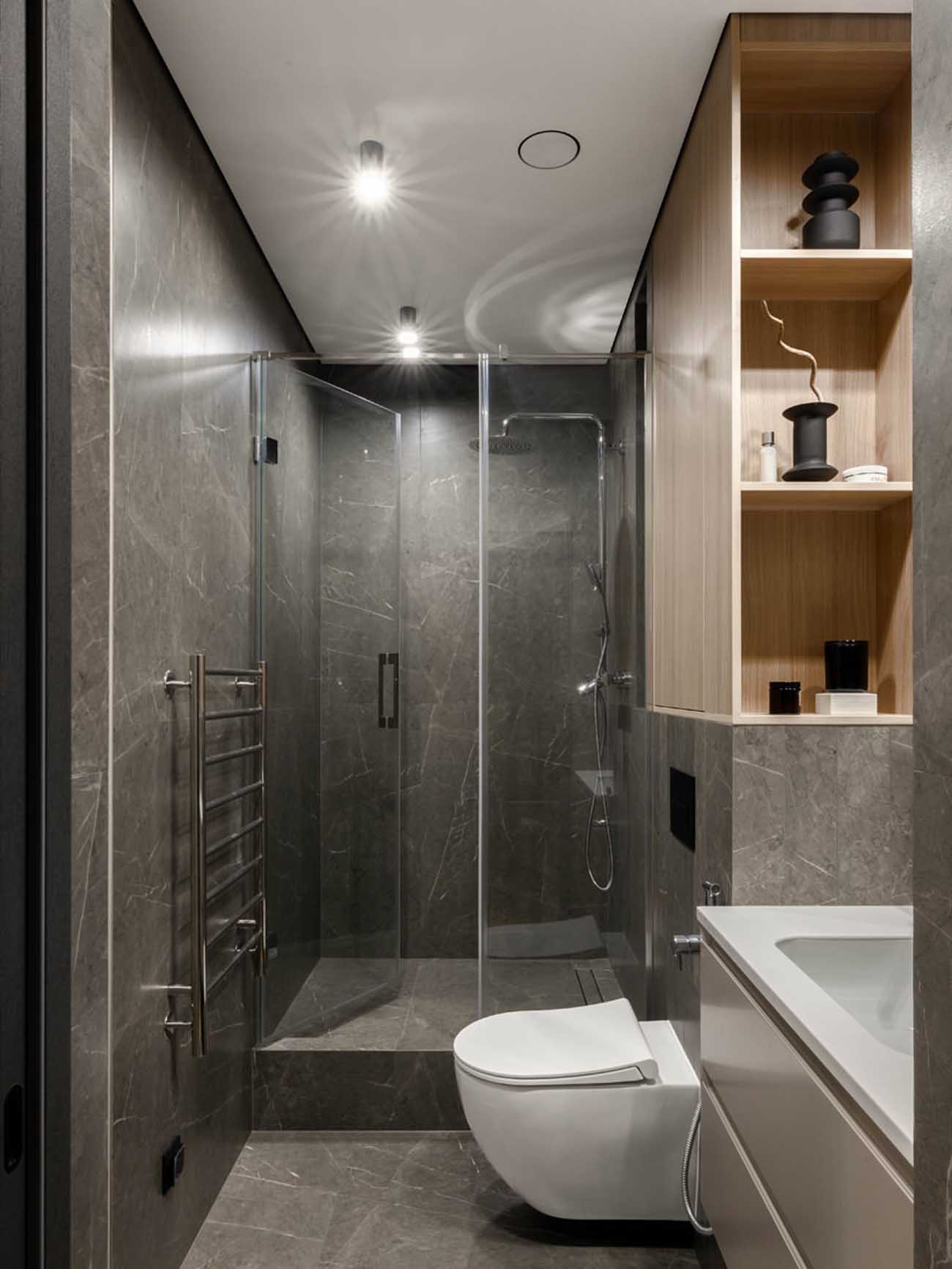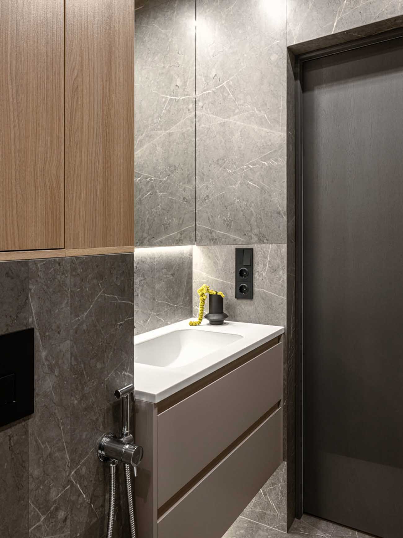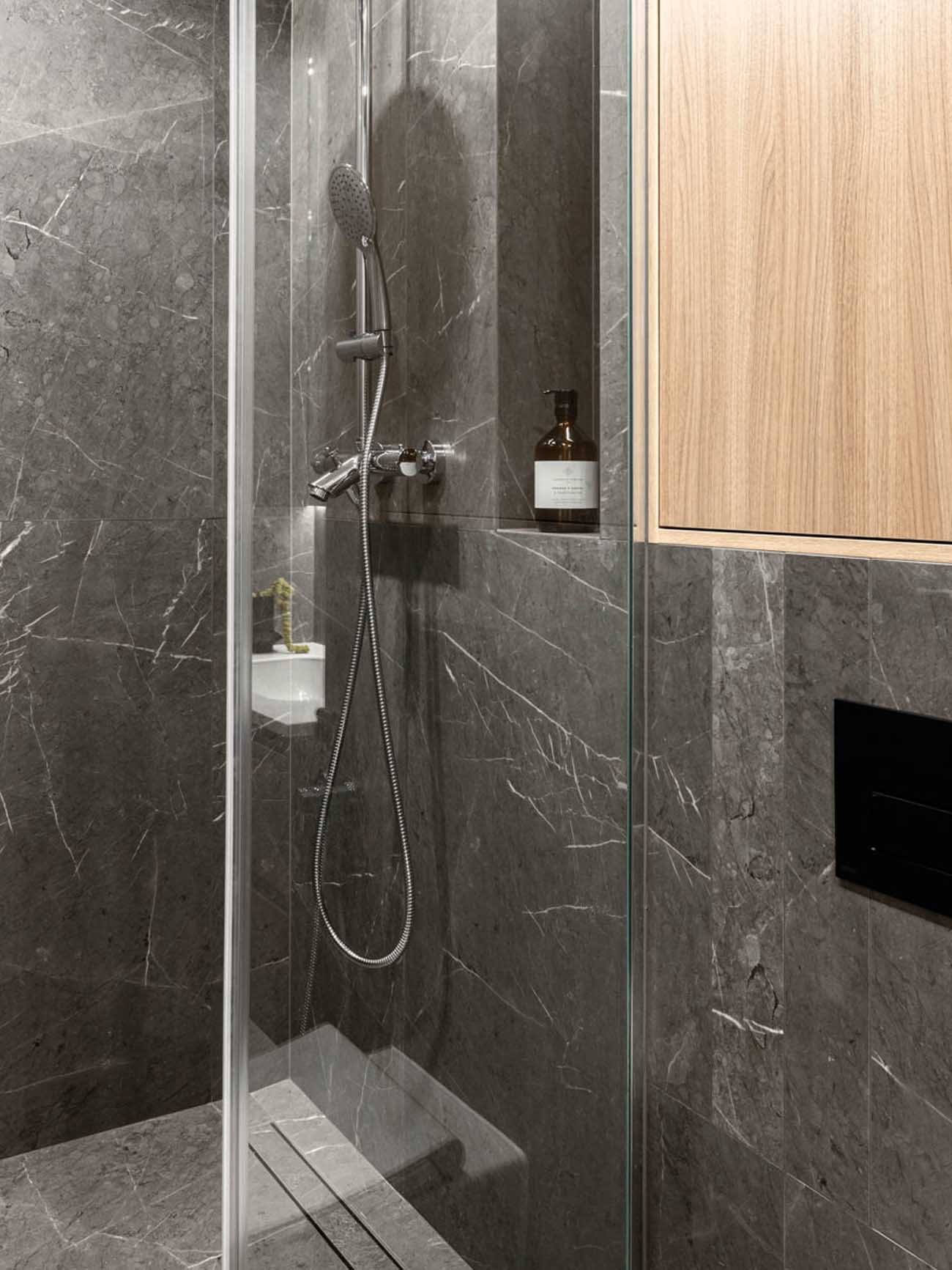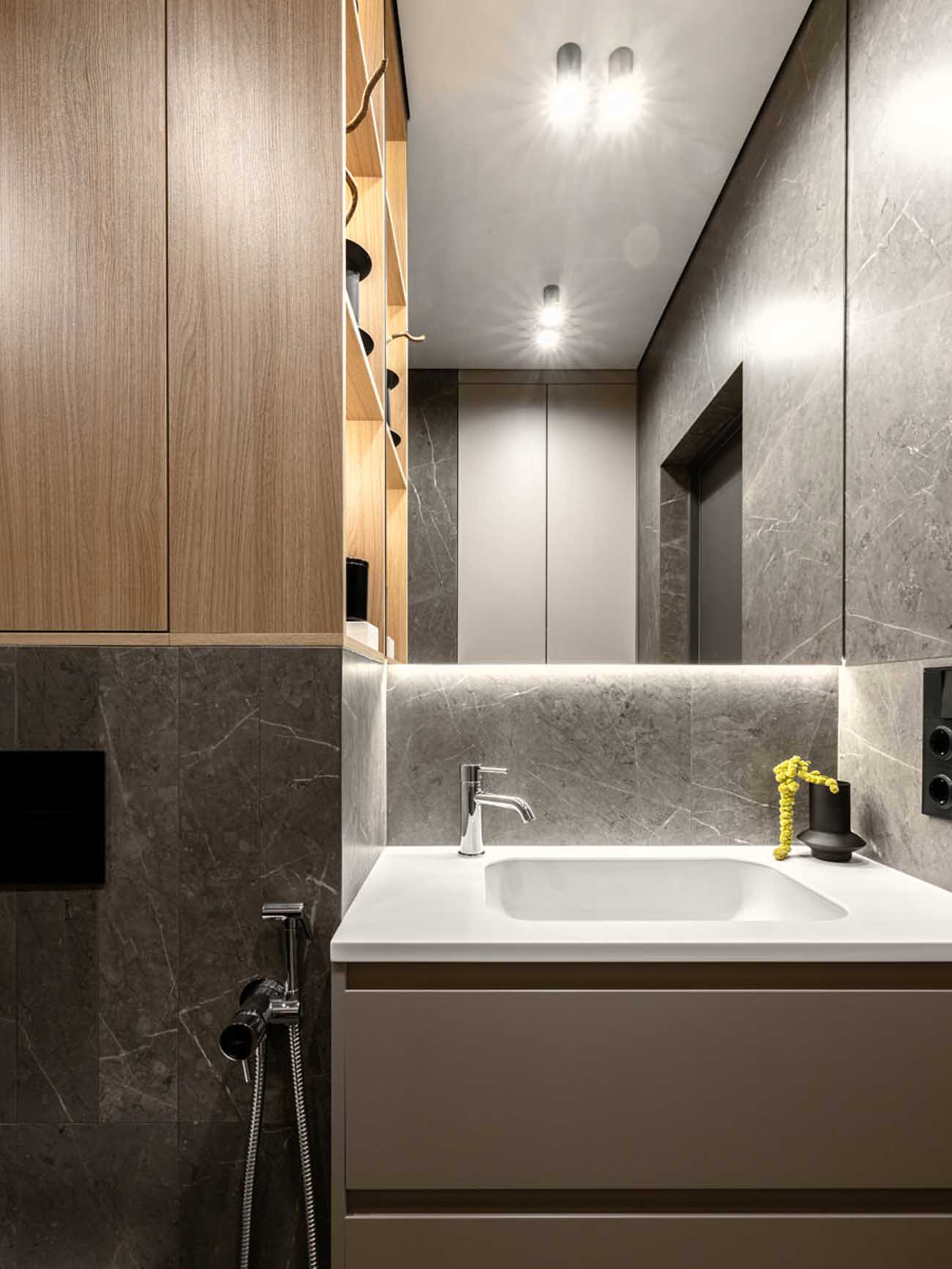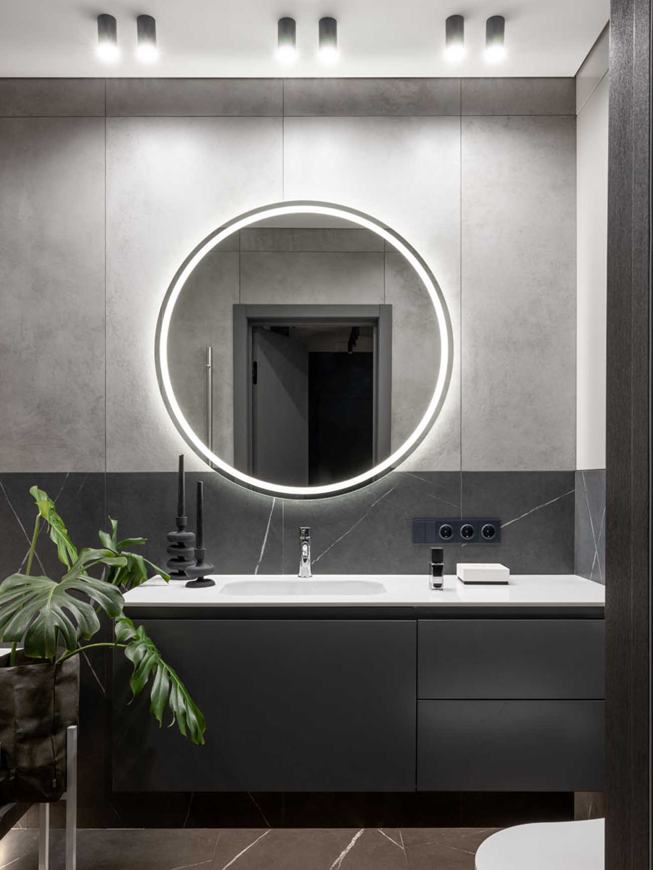A vizesblokkokban a drámaibb hatás érvényesül. A sötétszürke, márványhatású burkolatok és a betonhatású felületek modern, spa hangulatot árasztanak. A teret a nagy, kerek, háttérvilágítással ellátott tükör és a célzottan elhelyezett rejtett fényforrások lágyítják, kiemelve a szaniterek letisztult formáit és a fa elemek melegségét.