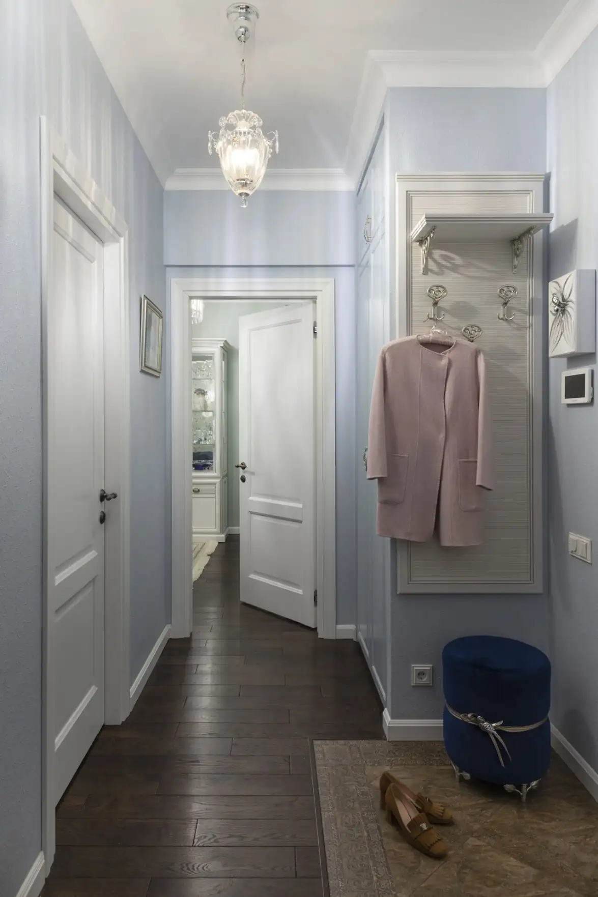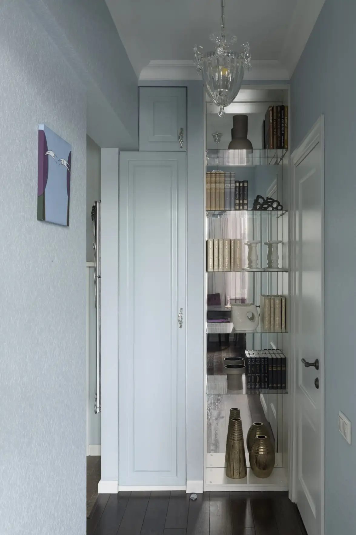 Az előszobában a praktikum és a térérzet növelése volt a fő szempont. A bejárati ajtó környékén, a nagyobb igénybevétel miatt könnyen tisztítható, strapabíró kerámia padlóburkolatot fektettek le. A tárolást egy ruhásszekrény, valamint egy kompakt, háztartási eszközöknek fenntartott szekrény oldja meg. Egy falfülkében tükrös hátfalú polcrendszert alakítottak ki, amely amellett, hogy növeli a térben a fény mennyiségét, a tér folytatásának illúzióját is megteremti. A minőség jegyében a lakás összes beépített bútorát asztalos készítette egyedi méretre.