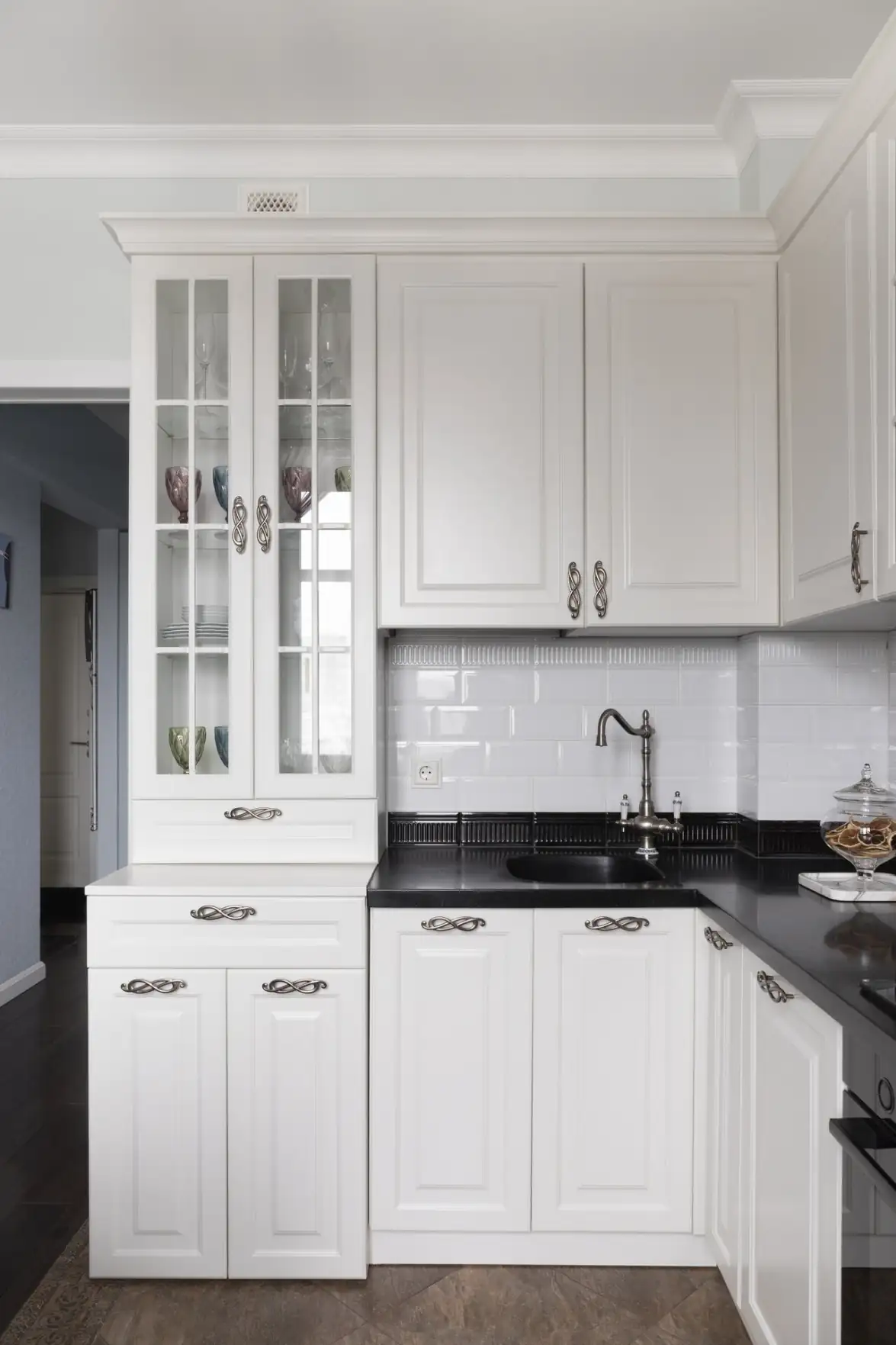 Az új alaprajz nemcsak funkcionálisabbá tette a lakást, hanem lehetővé tette számos beépített szekrény észrevétlen integrálását az előszobában, a nappaliban és a hálóban, miközben elegánsan elrejtették a tartószerkezetek kiugró részeit is. A tér grafikus karakterét és eleganciáját az egész lakáson végigvonuló kontraszt adja: a sötét tónusú, nemes megjelenésű, rétegelt fapadló látványosan emeli ki a hófehér ajtókat és a magas szegélyléceket.