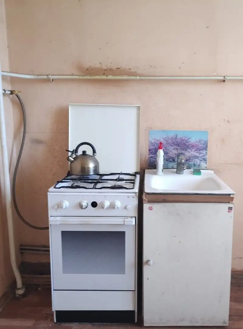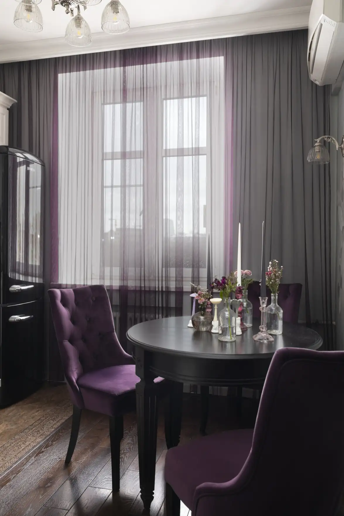 A konyhában a munkaterület mentén a padlót itt is praktikus kerámialapok védik. A teljesen beépített, modern konyhasor rejti a főzőlapot, a sütőt és a mosogatógépet. A munkafelület egy praktikus, monolitikus hatású akrilkő pult, integrált mosogatóval. A tányérok és poharak tárolására egy különálló tálalószekrény is helyet kapott. A helyiség stílusának alapját egy lenyűgöző virágos tapéta adja, amely előtt drámai fókuszpontként jelennek meg a lila étkezőszékek, míg a retró stílusú, fekete, szabadon álló hűtőszekrény markáns stíluselemként teszi teljessé a vizuális élményt.