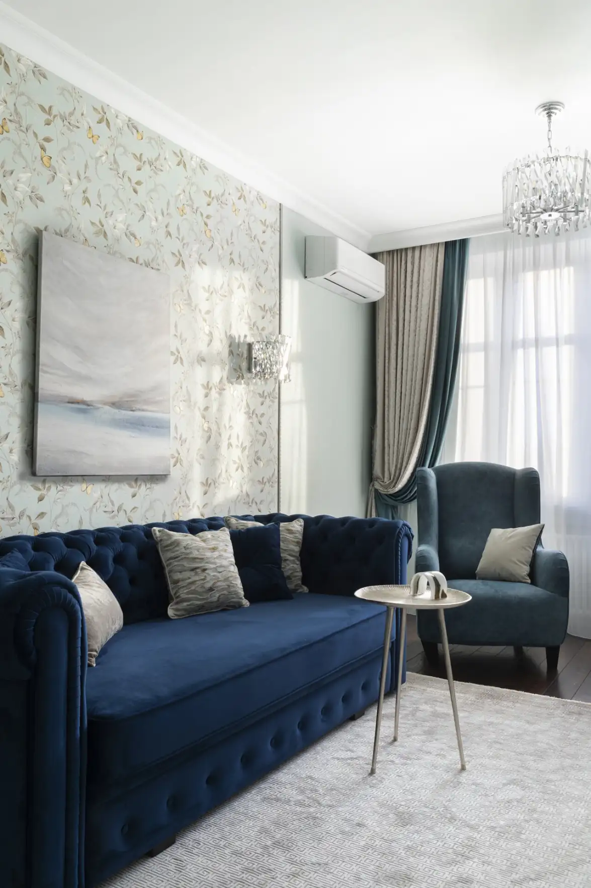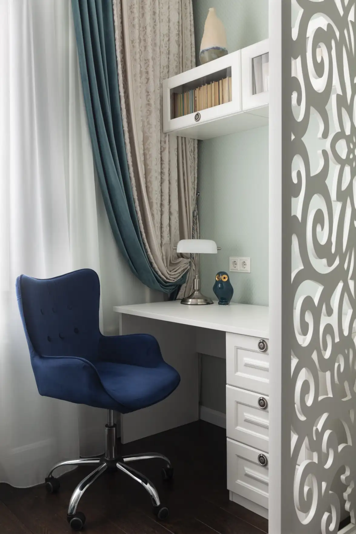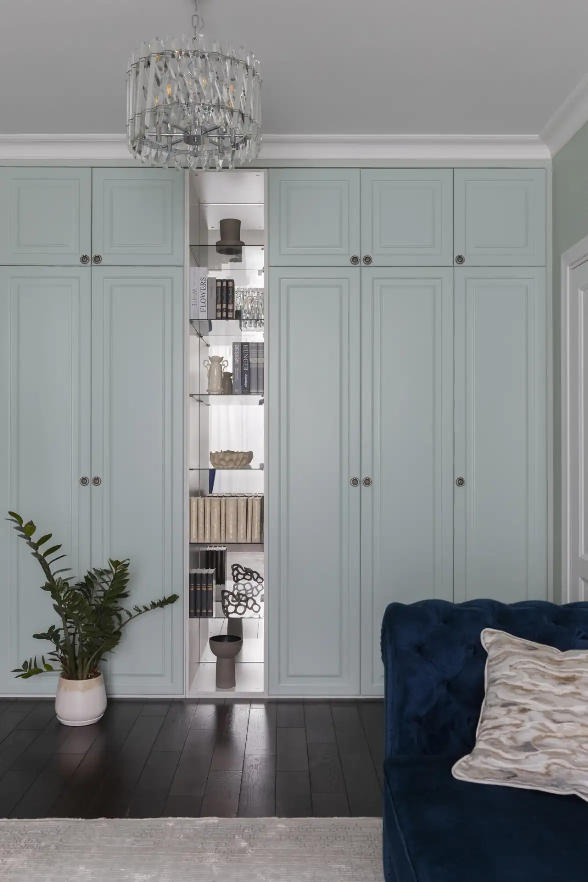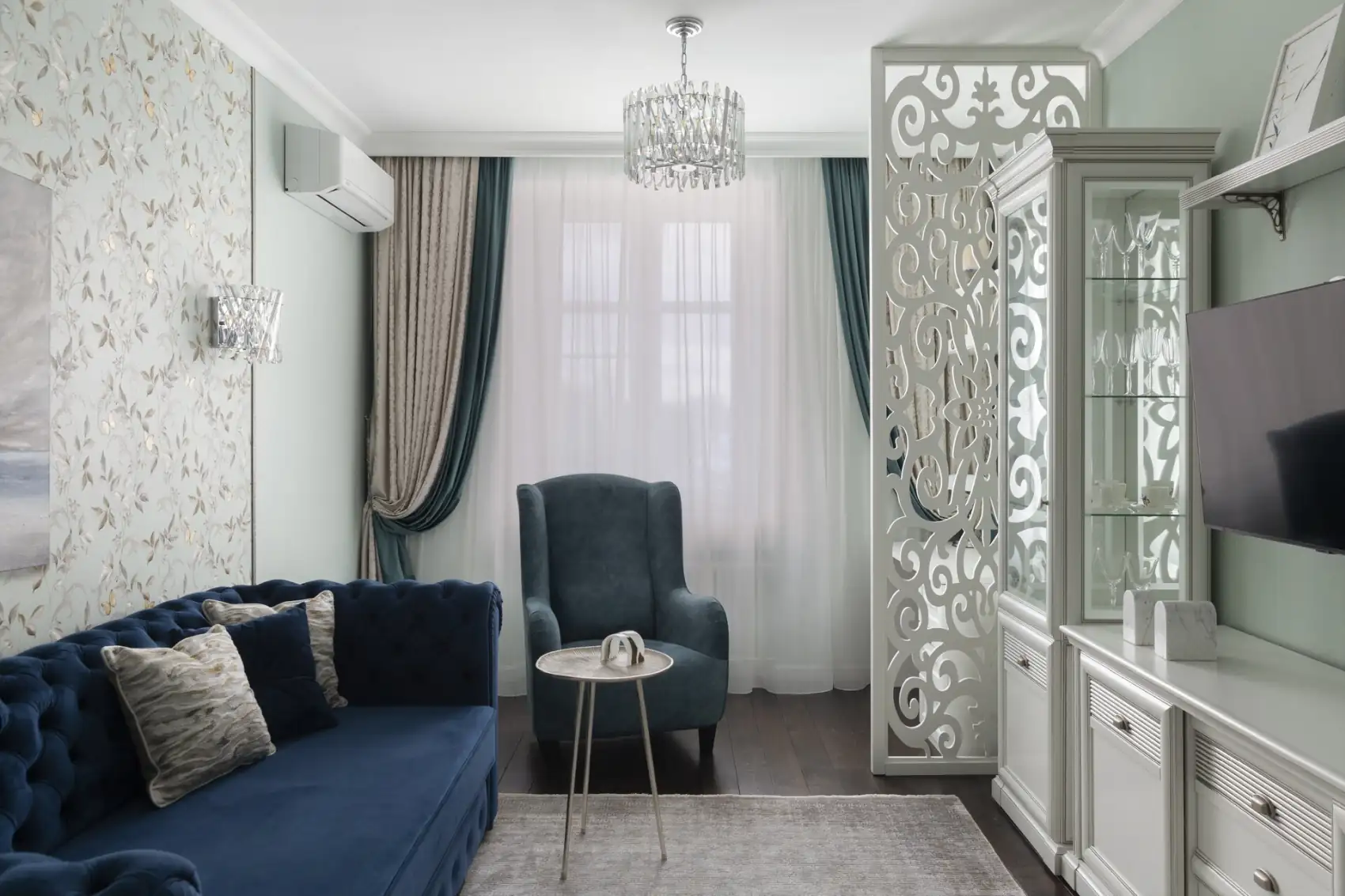 A nappali eredeti, hosszúkás „cső” formáját az építészeti hibák vizuális korrigálásával oldották fel: a szoba hosszából mély beépített szekrényekkel csíptek le egy részt, így az arányok harmonikussá váltak. A masszív szekrényblokkot egy nyitott, tükrös hátfalú polcrendszer töri meg, amely vizuális könnyedséget és extra fényt visz a térbe. A megmaradt, immár ideális arányú teret két zónára osztották: egy kényelmes pihenősarokra és egy elszeparált otthoni munkaállomásra. A dekorációban itt az elegáns kék-zöld palettát növényi motívumos tapéta egészíti ki.