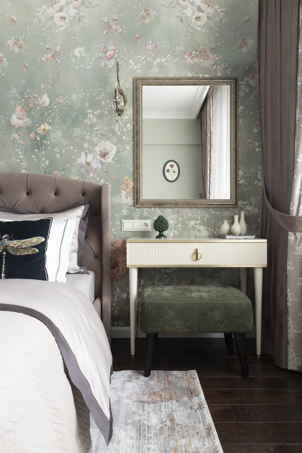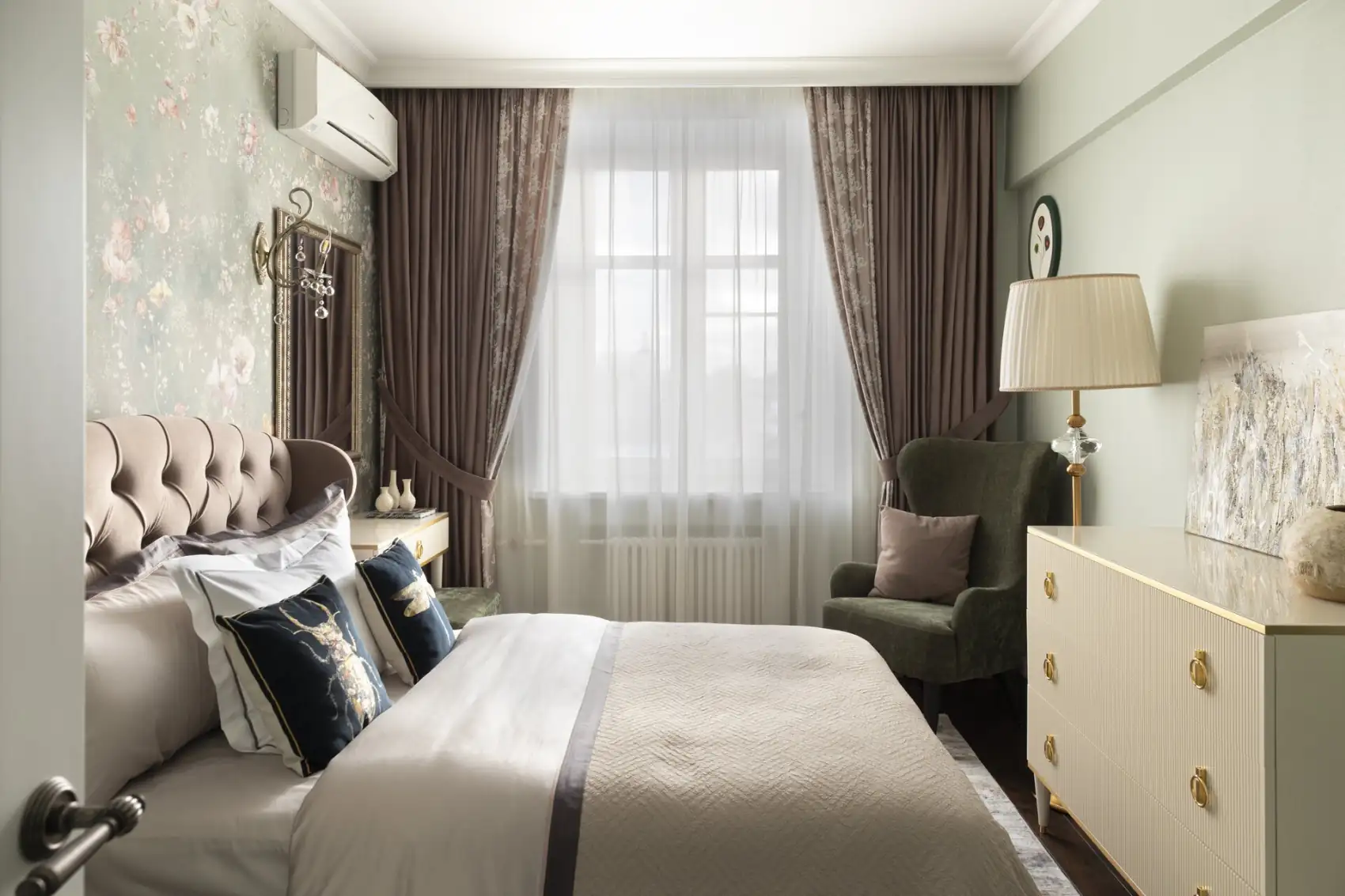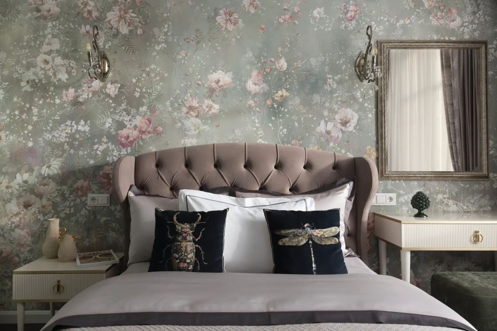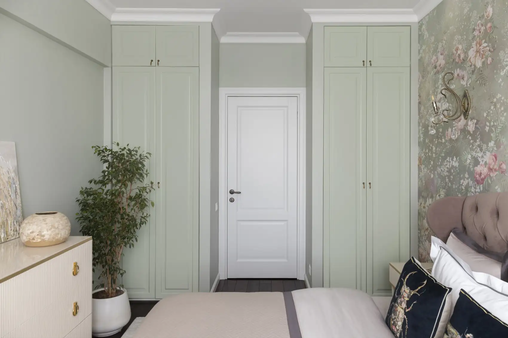 A hálószobában szintén megjelenik a természet iránti rajongás egy gyönyörű virágmintás tapéta formájában. Az átalakítás során az ajtó két oldalán szimmetrikusan elhelyezett beépített szekrények gondoskodnak a ruhatár elrejtéséről, megtartva a szoba letisztult, pihentető atmoszféráját, amelyet a gazdag textúrájú, puha textilek tesznek még otthonosabbá.
