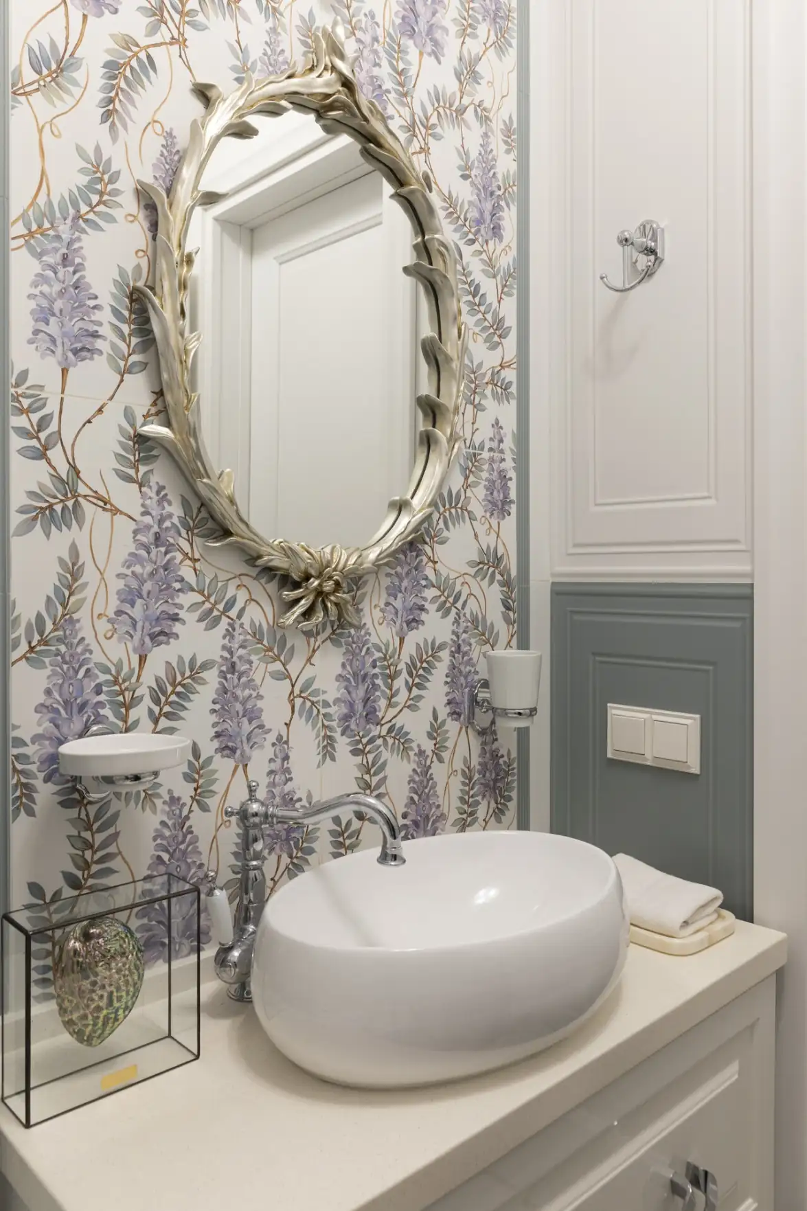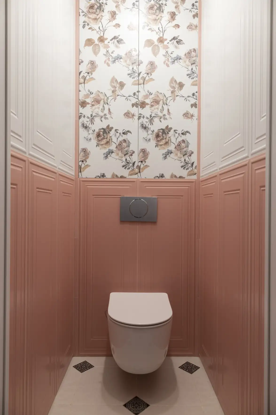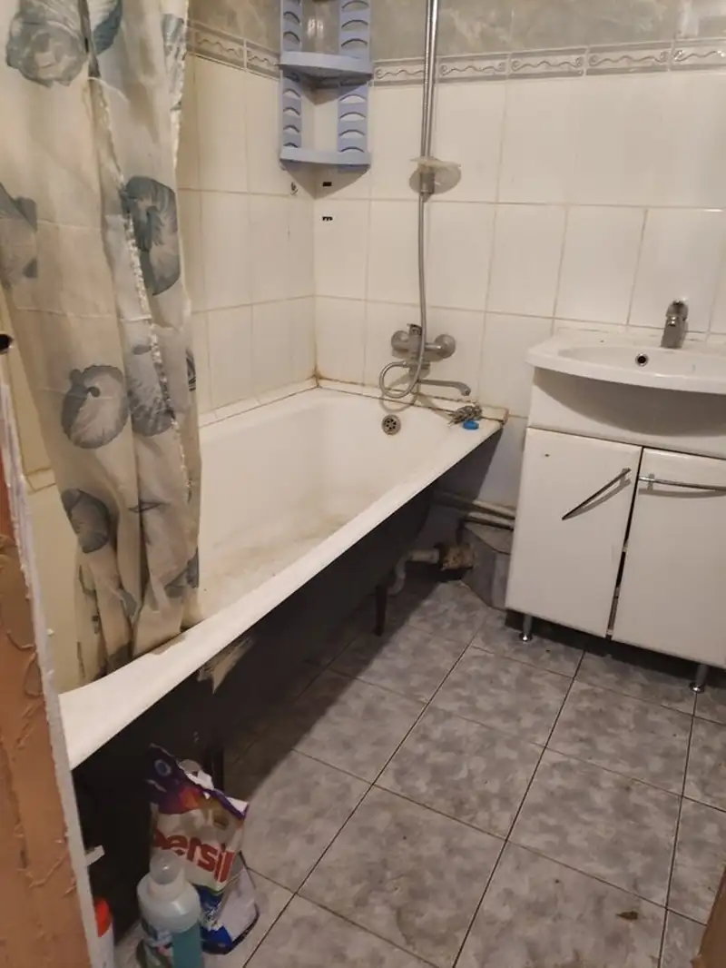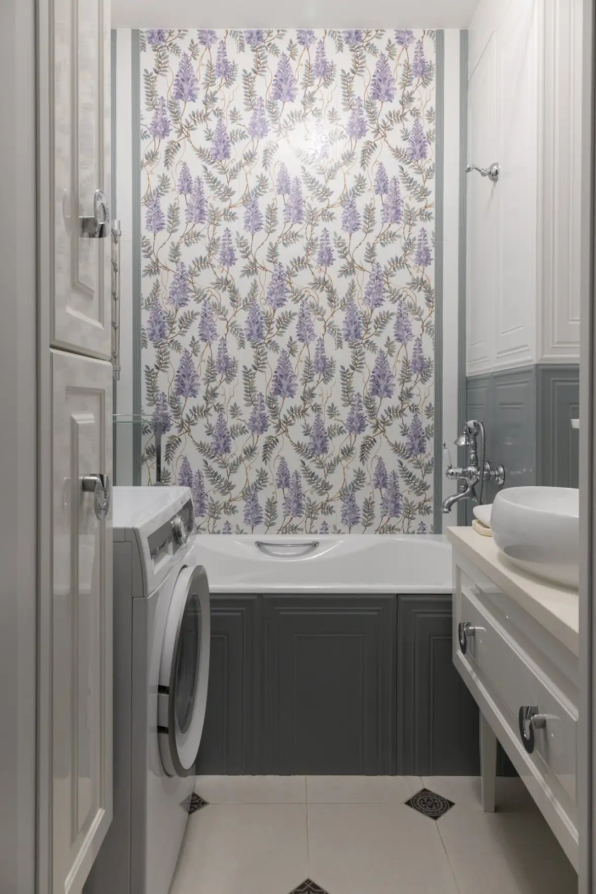 Az eredeti tervek szerint a fürdőszobát és a toalettet egybenyitották volna. A bontás során azonban kiderült, hogy az alaprajzi dokumentációval ellentétben a két helyiség között egy szellőzőakna húzódik, így az egyesítés meghiúsult. A gyors újratervezésnek és az ajtónyílás áthelyezésének köszönhetően azonban a különálló fürdőszoba hasznos alapterületét jelentősen sikerült megnövelni. A térszervezés rendkívül racionális lett: az ajtóval szemben kapott helyet a kád, jobbra egy egyedi méretre gyártott mosdószekrény, balra pedig egy magas szekrény és a mosógép, amelyek az eredeti elrendezésben el sem fértek volna. A helyiség intim, finom hangulatát a visszafogott, virágmintás kerámiaburkolat adja meg.