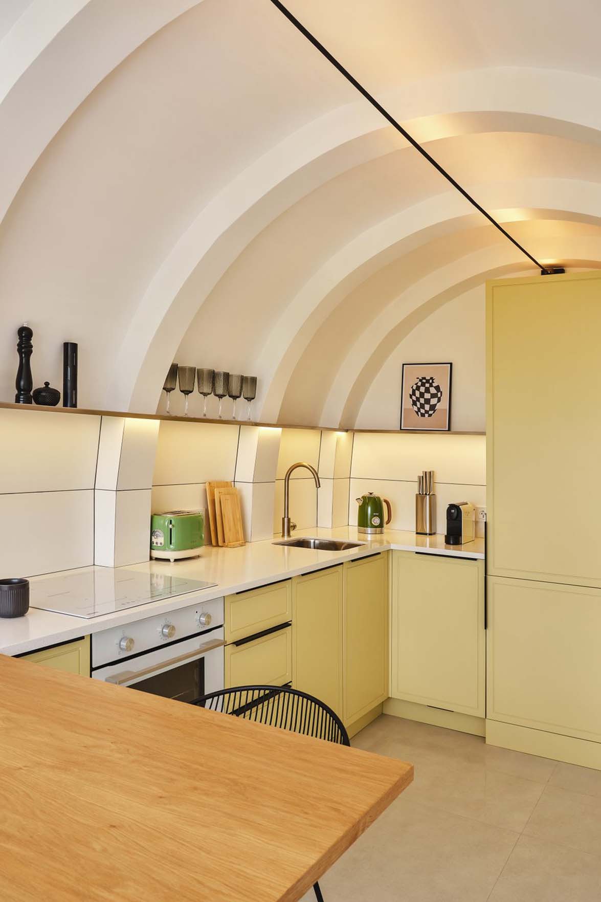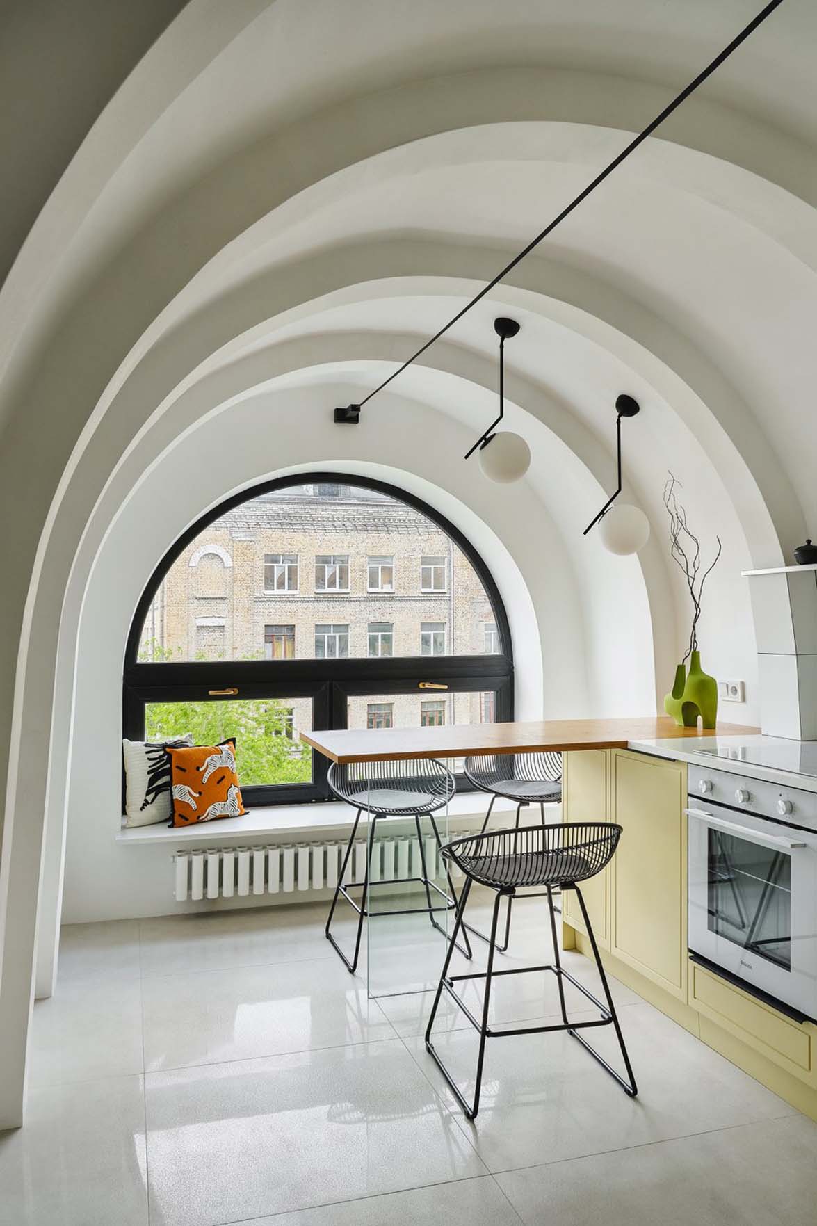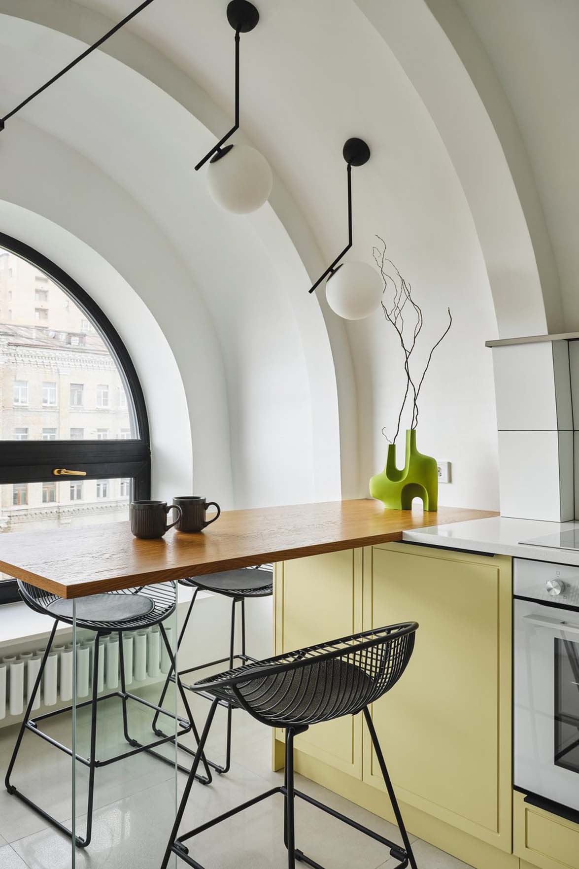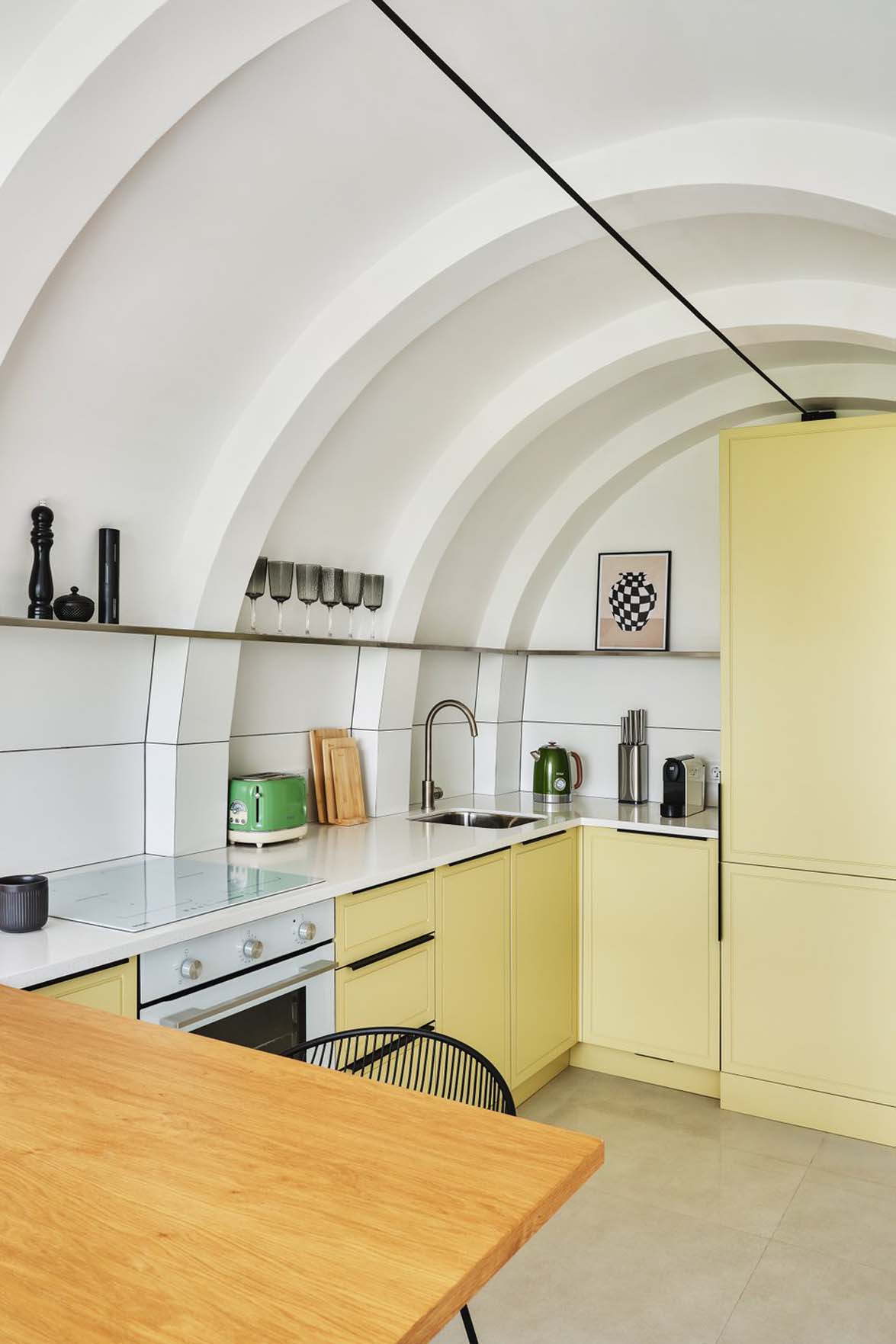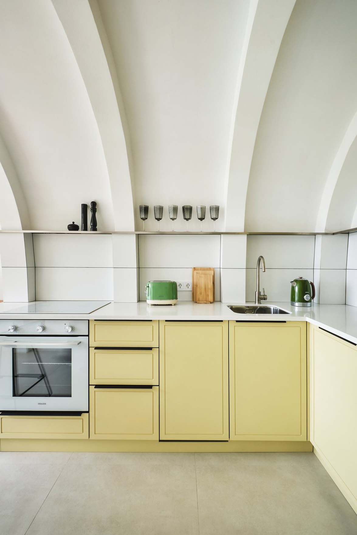 A helyiség tagolt alaprajza miatt a falak és a mennyezet fehér színt kapott – ez vizuálisan elmossa a síkok közötti határokat és a tágasság érzetét kelti. Az egyedileg gyártott konyhabútor MDF-frontjai meleg sárga árnyalatú festést kaptak. A felső szekrények helyett rozsdamentes acél polc került beépítésre, rejtett LED-világítással.