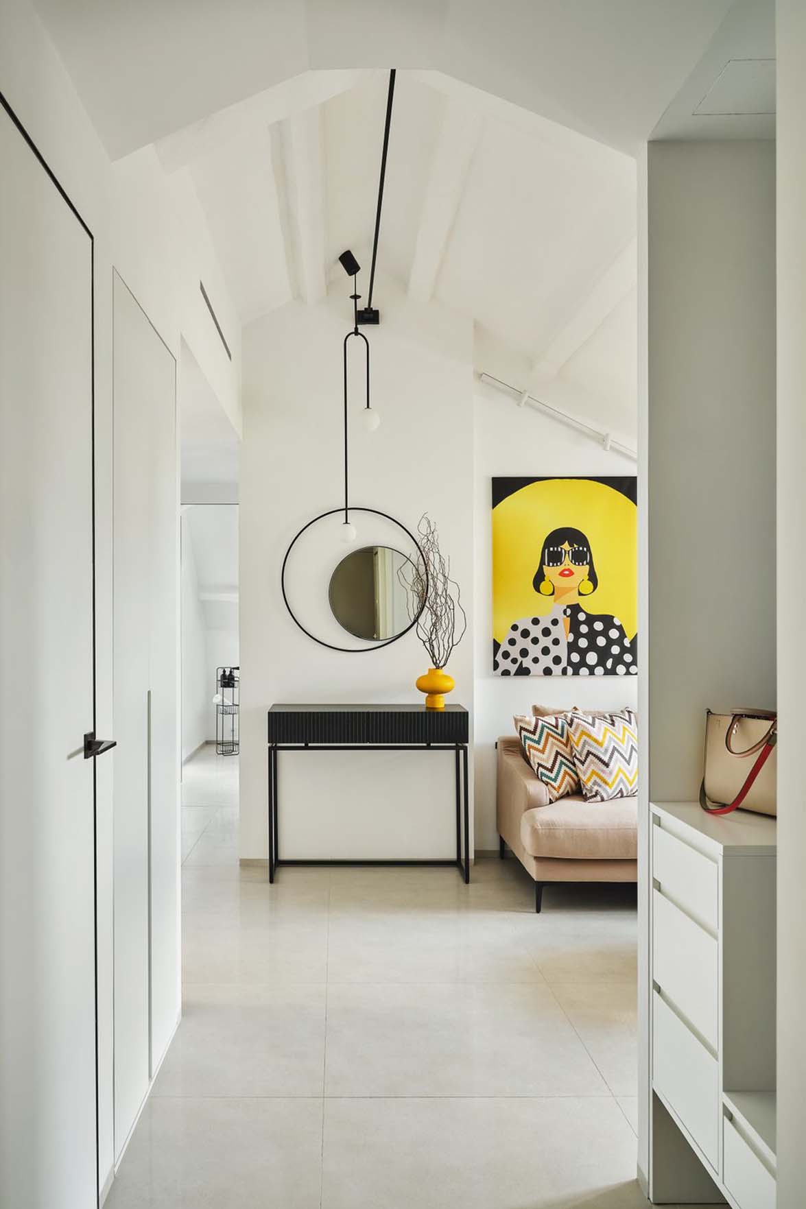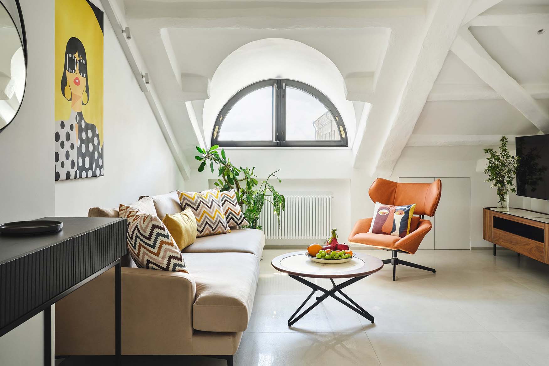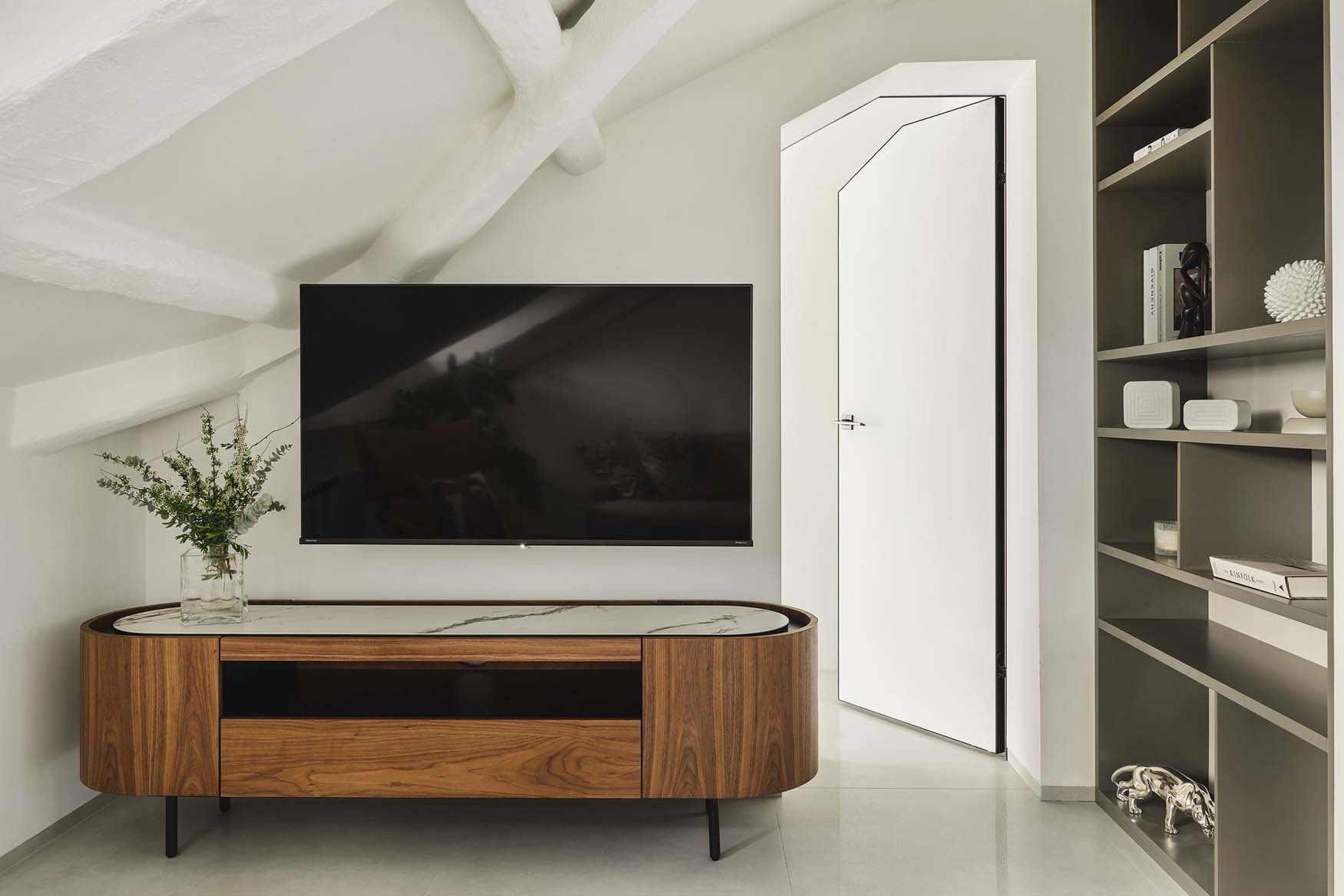 A lakberendező elmondása szerint a nehezen berendezhető terek indítják be a fantáziáját igazán – erre szükség is volt ebben a tetőtérben kialakított lakásban, ahol a bonyolult alaprajz és a ferde falsíkok is kihívást jelentettek. „Hogyan lehet világos, de úgy, hogy a fény ne süssön a szemedbe a ferde mennyezet miatt? Hogyan lehet a légcsatornás klímaberendezést úgy kiépíteni, hogy a belmagasság a lehető legkevésbé csökkenjen?” – a tervezőnek sok részletet kellett átgondolni.