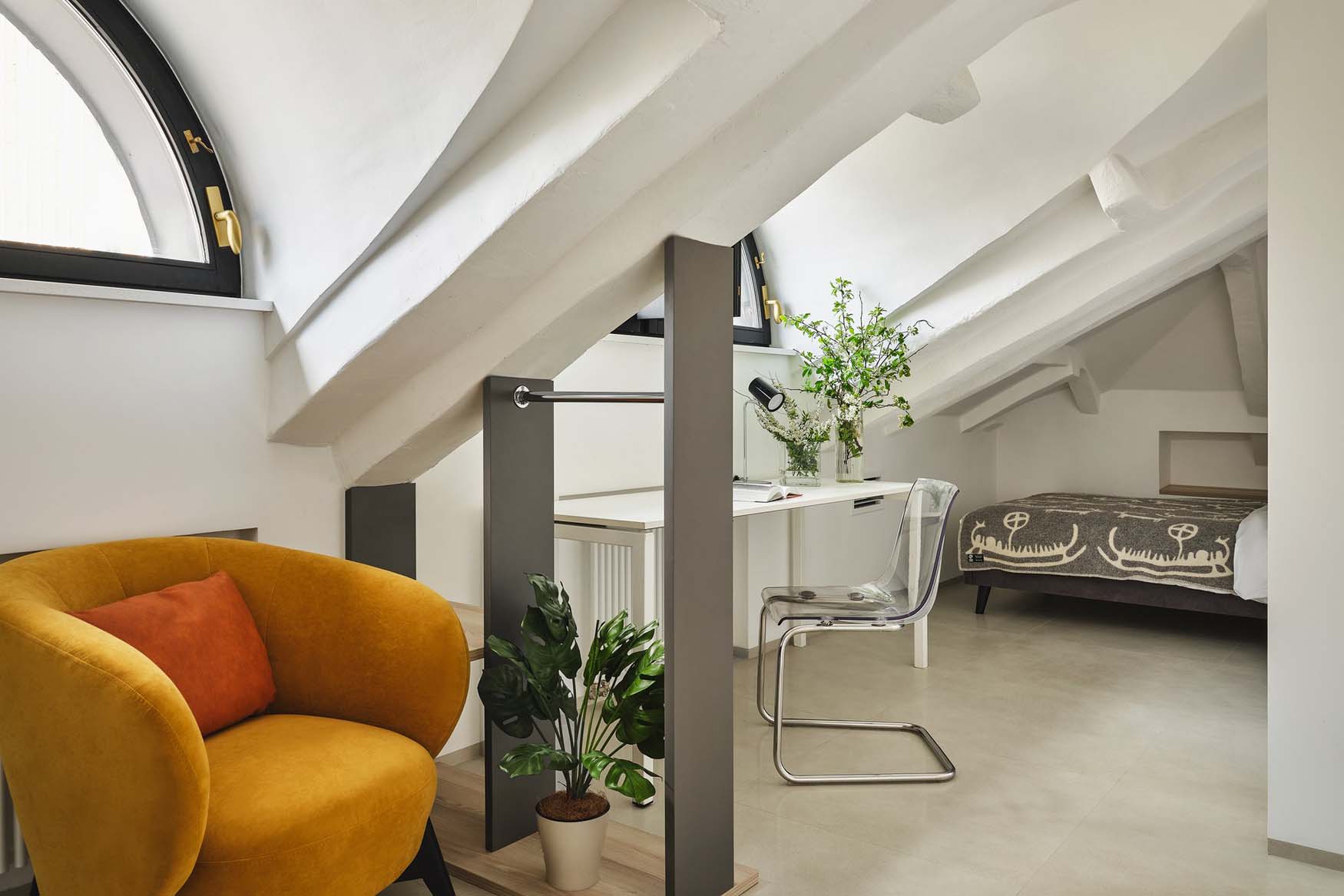 A munkapult magasságában futó, tölgyfa furnérral borított asztal az üveglábnak köszönhetően szinte lebeg a térben. Az asztal alatt további tárolóhelyeket alakítottak ki. Az ablakpárkányból egyfajta lounge-sarok lett, ahol egy csésze kávé mellett élvezhető az íves ablakból nyíló panoráma a városra és a közeli templomokra.