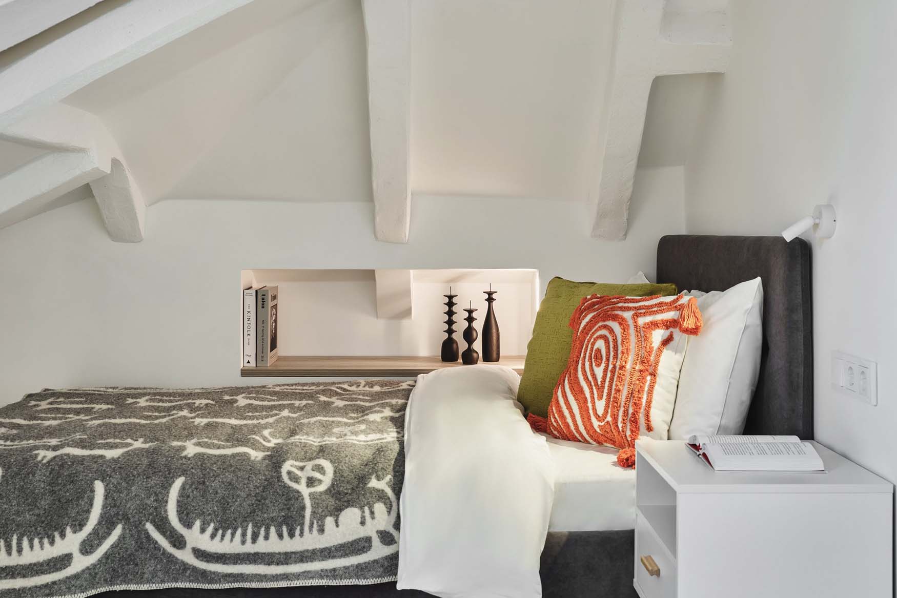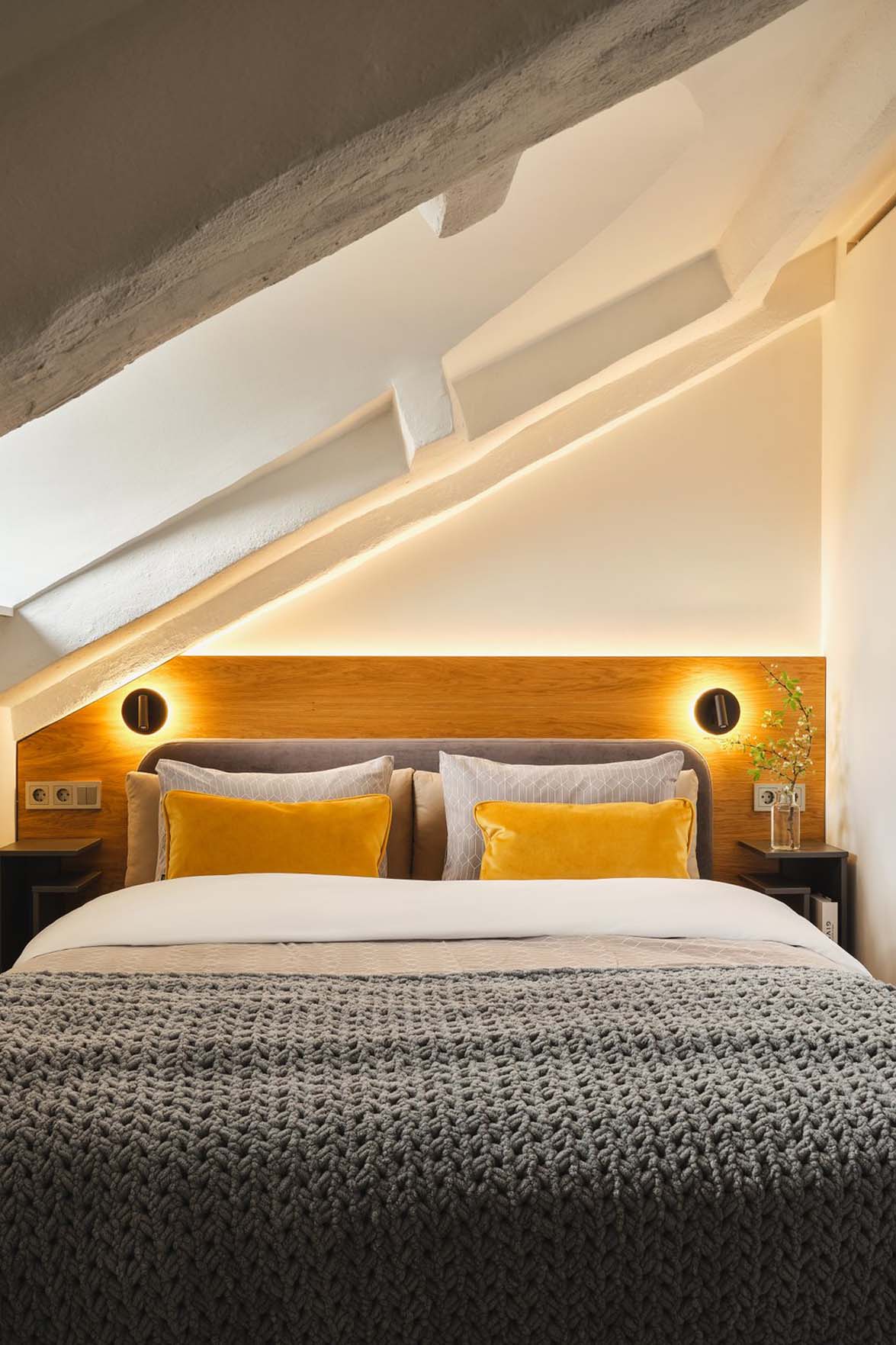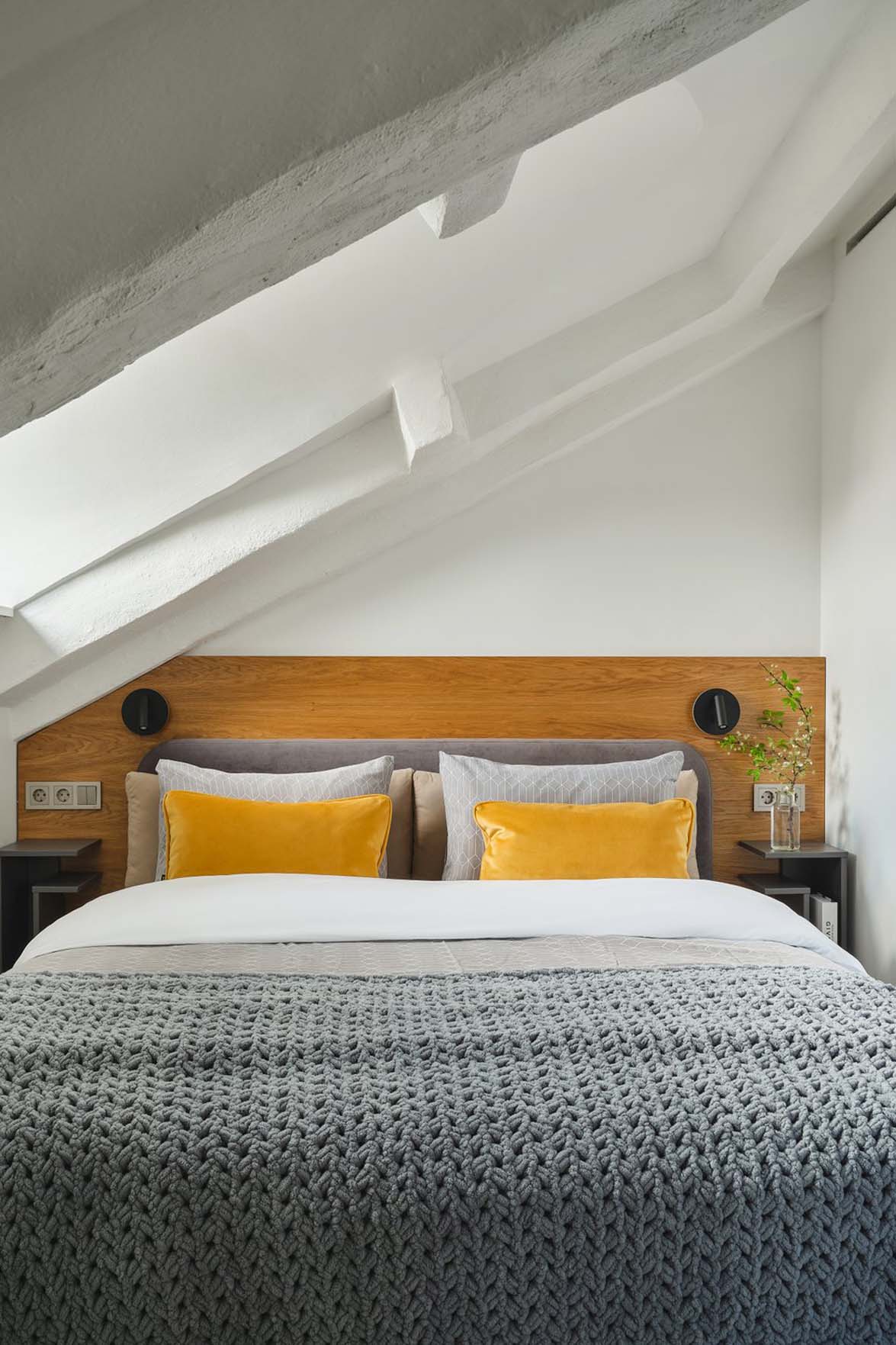 A szűkös tér ellenére kulcsfontosságú volt, hogy a hálószobában az ágy mindkét oldalról megközelíthatő maradjon. Az ágy fejtámlája mögötti falat rejtett hangulatvilágítással ellátott fa panel díszíti.