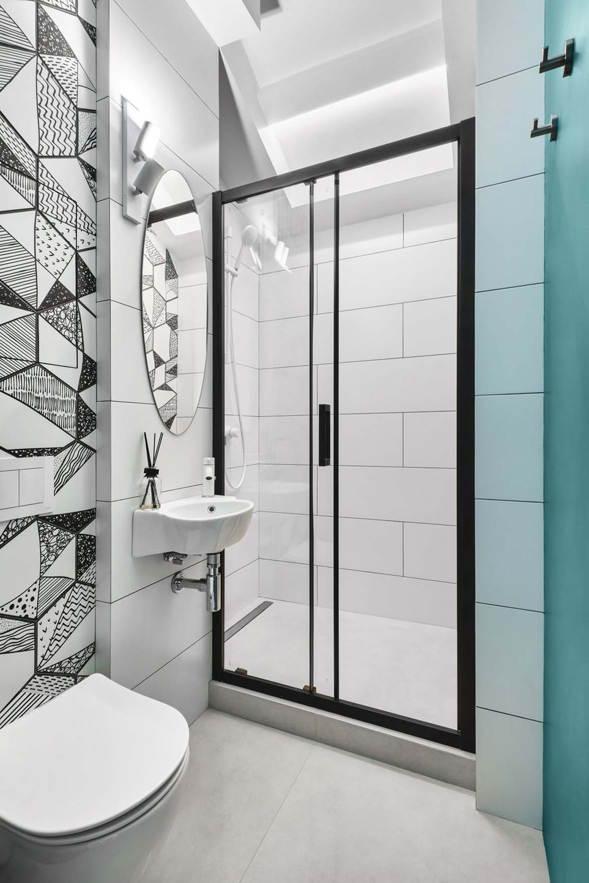Költséghatékony megoldás: a fürdőszoba burkolatát egy kedvezőbb árú kollekcióból választották. A lapokat különböző szélességű csíkokra vágták, és kontrasztos, grafitszürke fugával emelték ki a különleges mintázatot.