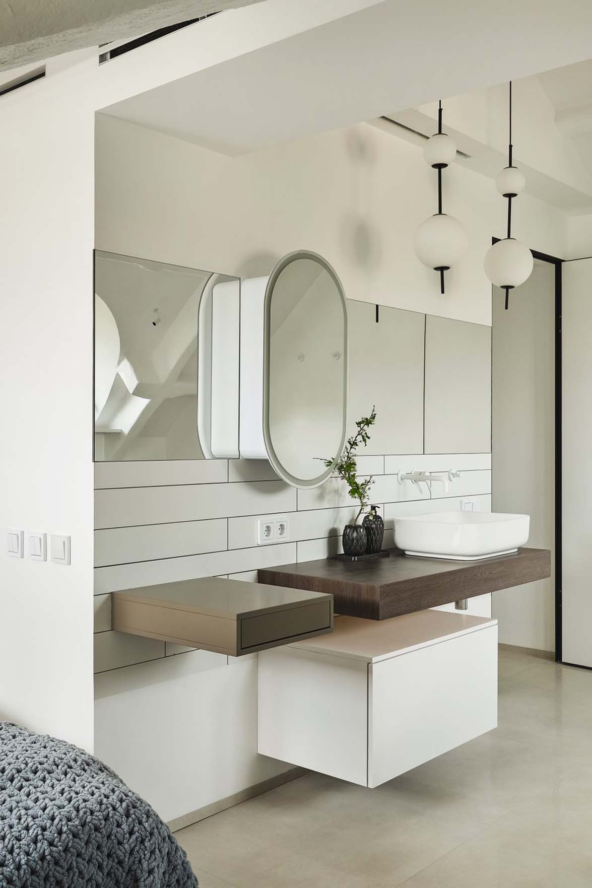 A fürdőszobai mosdószekrényt készen vásárolták, de annak folytatása – a bal oldali lebegő tárolóelem – már egyedi asztalosmunka. A két bútordarab közötti távolságot pontosan úgy mérték ki, hogy a tulajdonosok, ha szeretnék, később egy üvegfallal teljesen leválaszthatják a fürdőzónát.