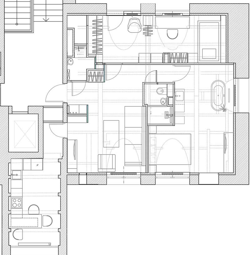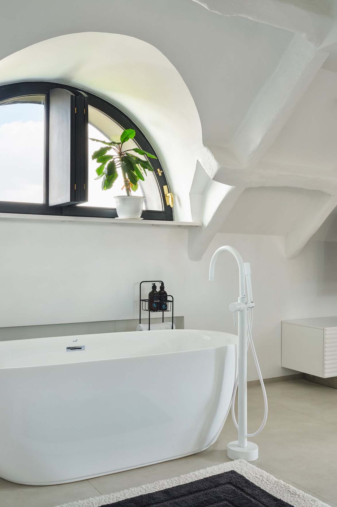 „Az átalakítás műszakilag is kihívást jelentett” – meséli a tervező. „A vizesblokkoknak az épületben függőlegesen, az első emelettől a legfelső szintig egy vonalban kell végigfutniuk. A tetőtérben a helyszűke miatt praktikusabb lett volna a fürdőszobát a dolgozó-gardrób helyére telepíteni, ám az így pont az alsóbb szintek hálószobái fölé került volna, ami műszakilag elfogadhatatlan. Ekkor jött az ötlet, hogy – exkluzív hotelekben látott megoldások mintájára – a fürdőt közvetlenül a hálótérben alakítsuk ki. A tervezés során mindent úgy alakítottunk ki, hogy igény esetén a háló- és a fürdőzóna egy üvegfallal elválasztható legyen, hiszen mindkét funkcionális egység saját ablakkal rendelkezik.”