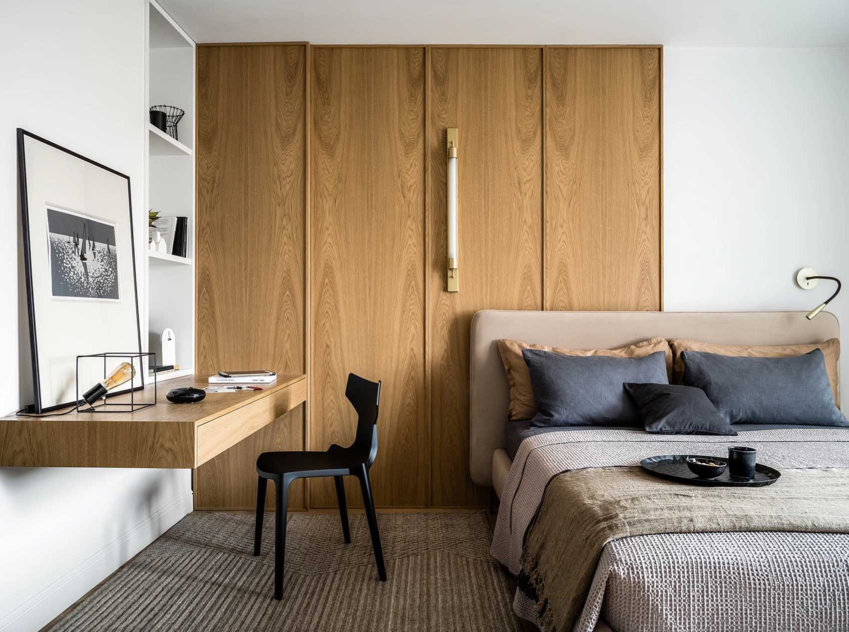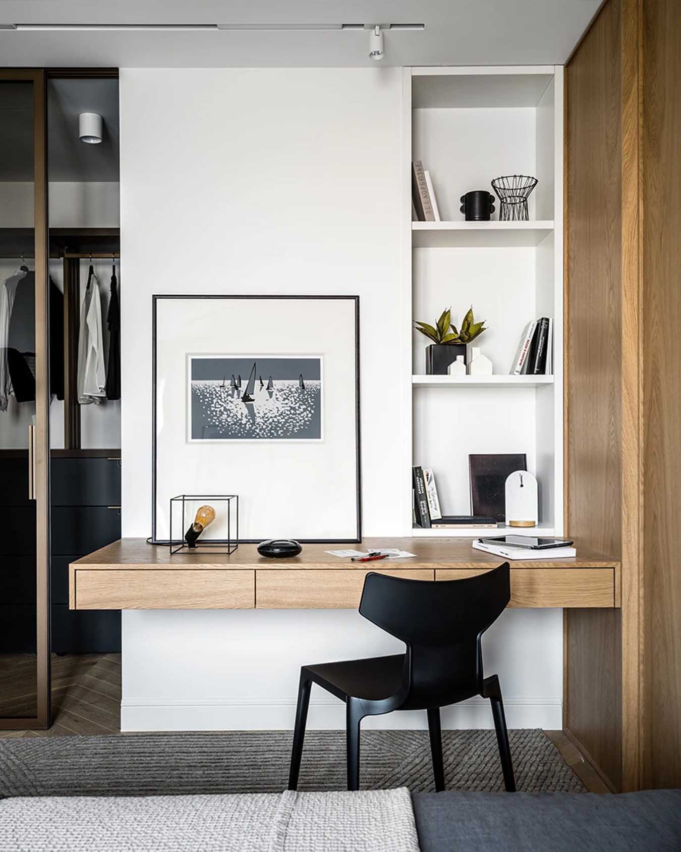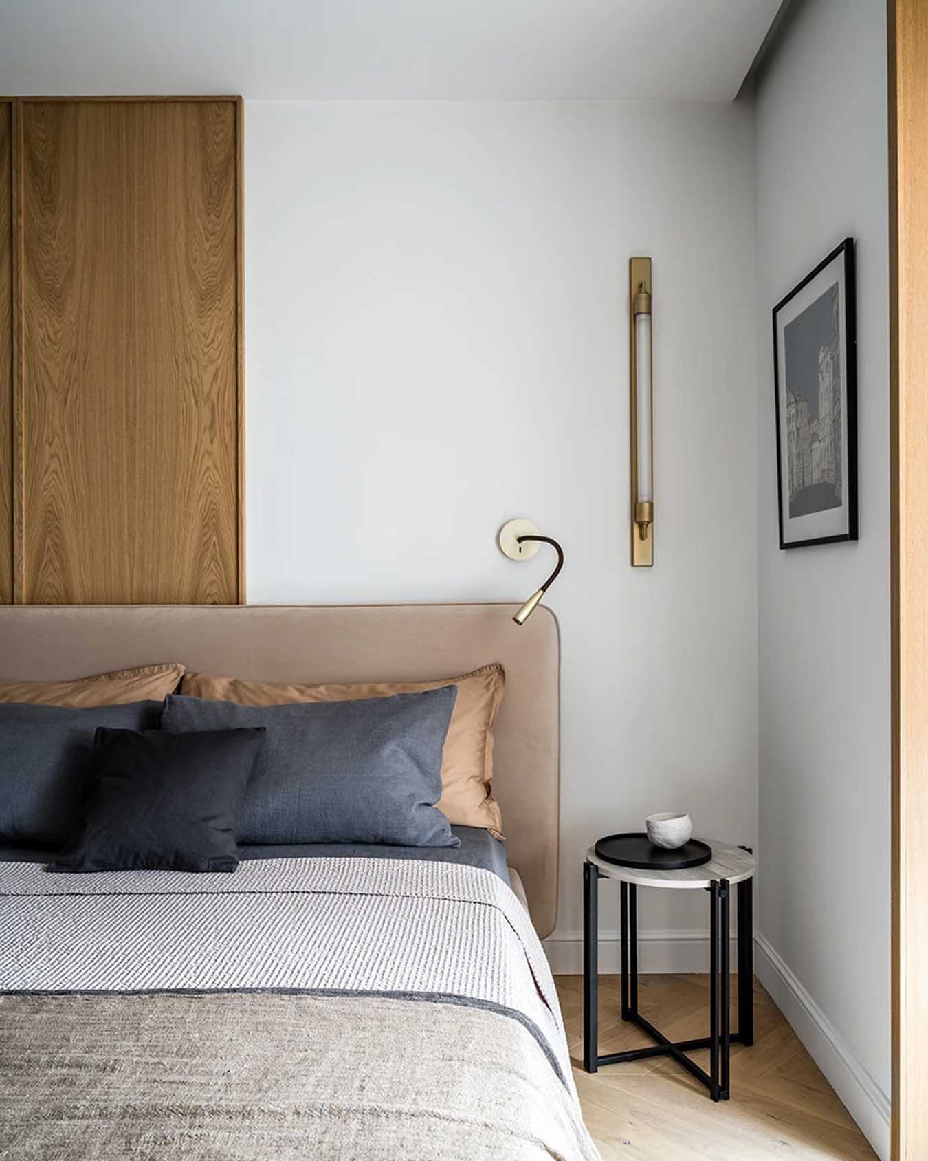 A gardróbbal bővített hálószoba és a nappali között ajtó helyett csak átjárót hagytak, ugyanúgy, mint az előszoba és a nappali-konyha között. A tér színvilágát már az első személyes találkozó után meghatározták. Világos volt, hogy az enteriőrnek férfias, ugyanakkor barátságos hangulatúnak kell lennie – a természetes fa színeit enyhén kékes árnyalatú fehér falakkal, meleg szürke kvarcittal, valamint a textíliákban és a festményeken megjelenő kék és zöld jegyekkel kombinálták.