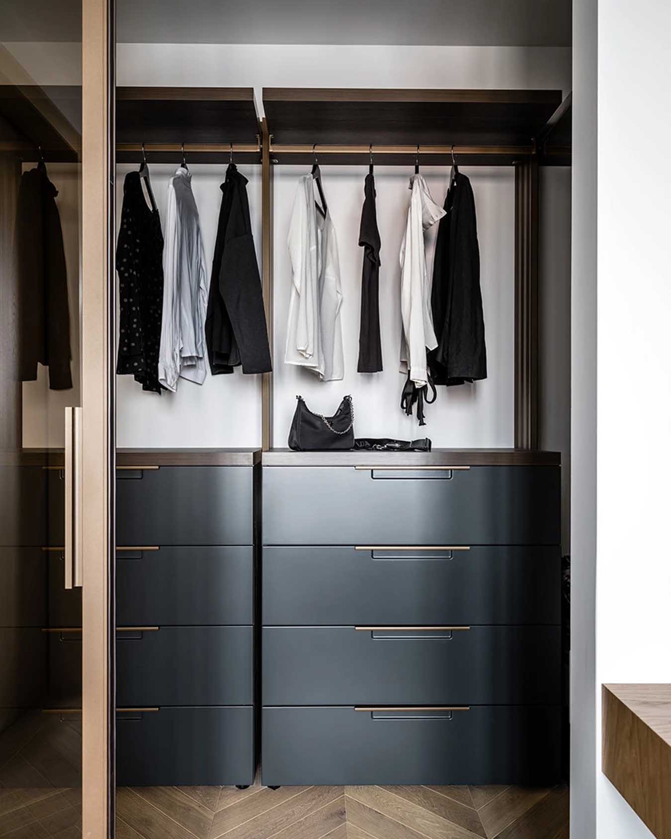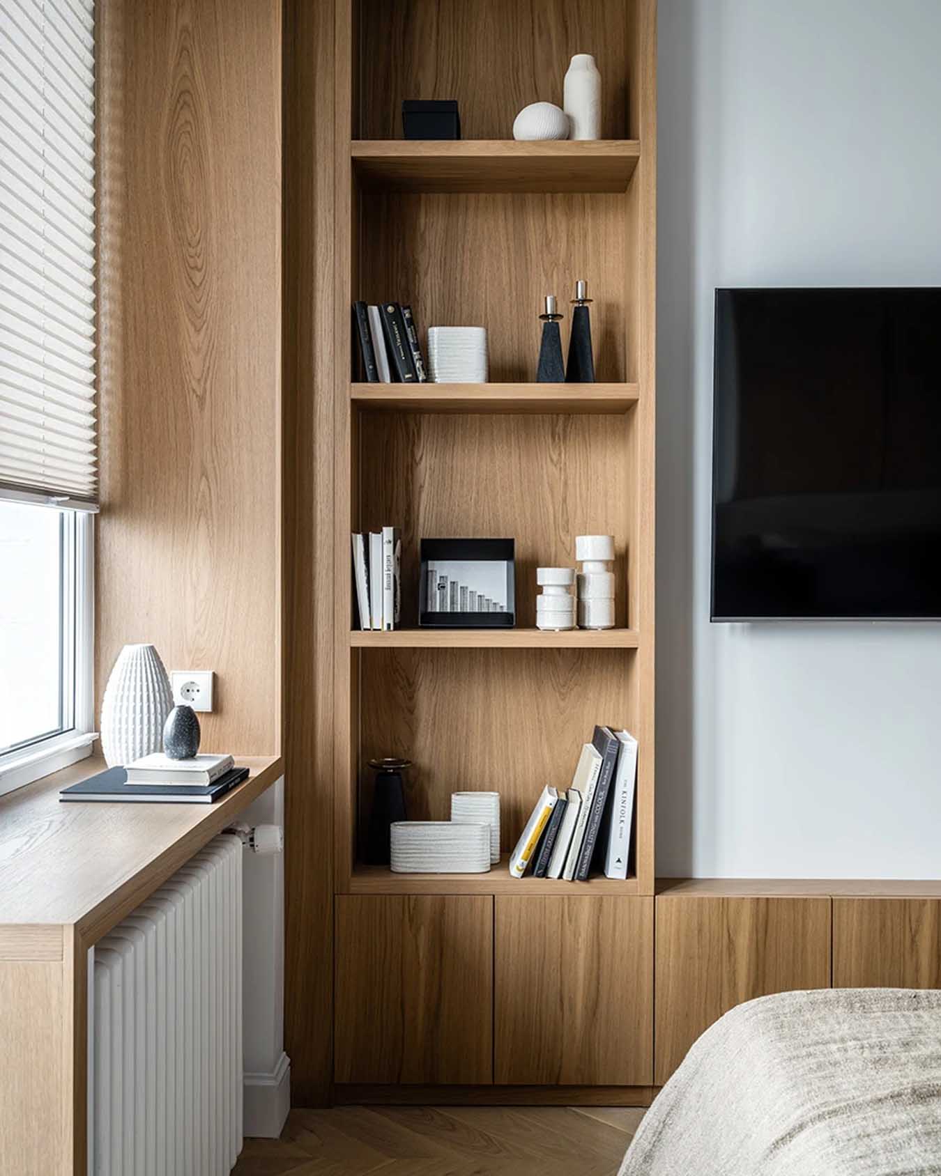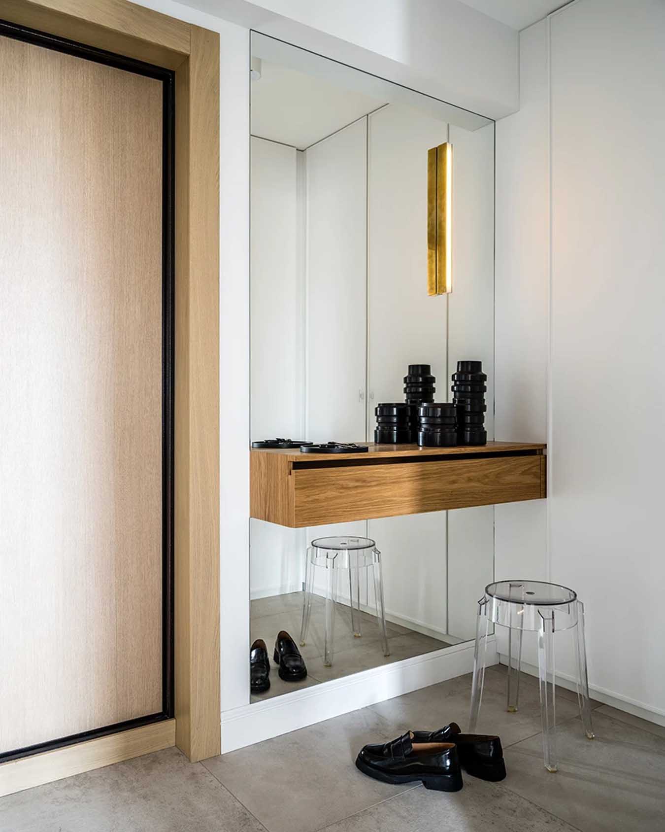 A gardróbbal bővített hálószoba és a nappali között ajtó helyett csak átjárót hagytak, ugyanúgy, mint az előszoba és a nappali-konyha között. A tér színvilágát már az első személyes találkozó után meghatározták. Világos volt, hogy az enteriőrnek férfias, ugyanakkor barátságos hangulatúnak kell lennie – a természetes fa színeit enyhén kékes árnyalatú fehér falakkal, meleg szürke kvarcittal, valamint a textíliákban és a festményeken megjelenő kék és zöld jegyekkel kombinálták.