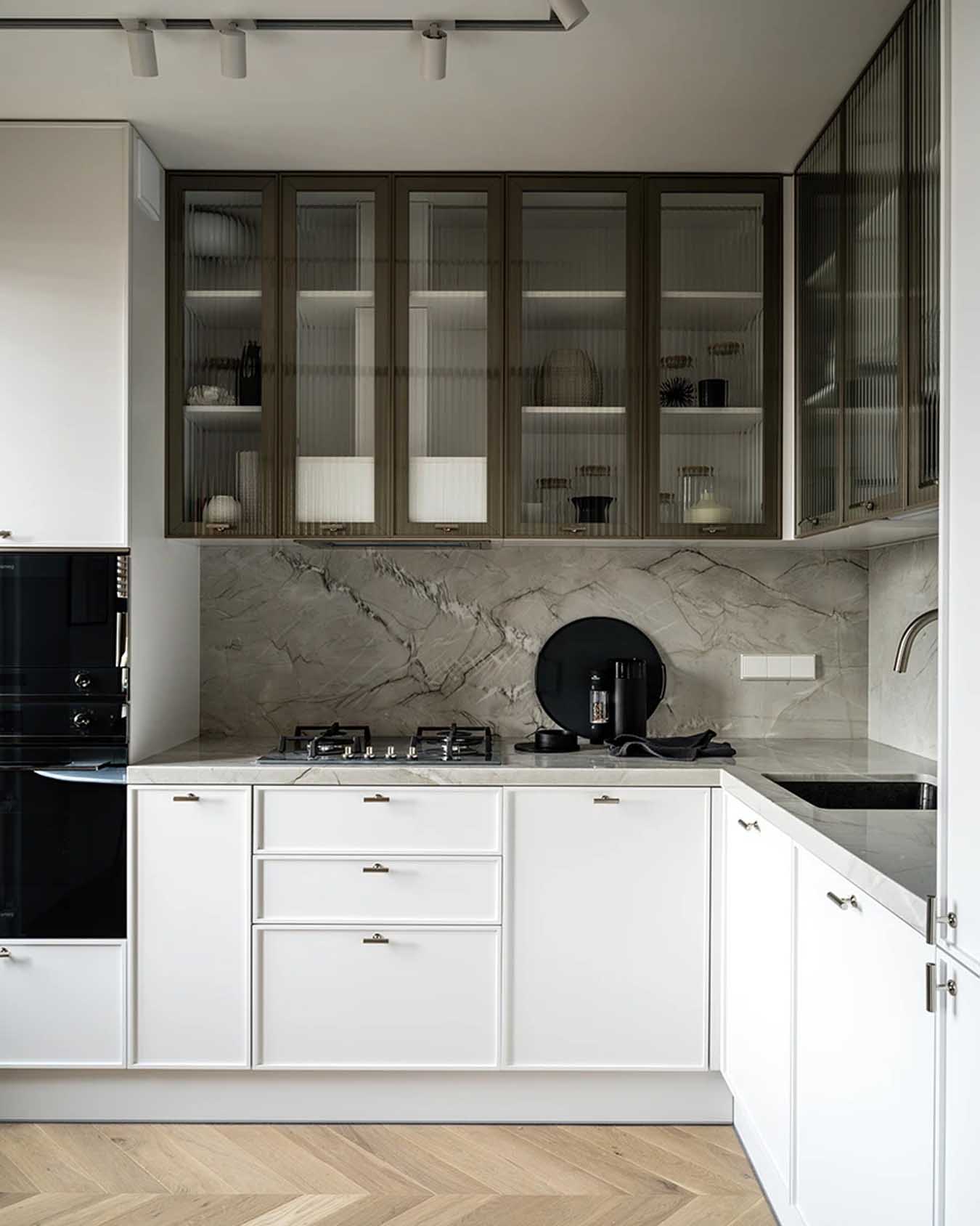 A konyhát és a nappalit egybenyitották, a gázról viszont nem akart lemondani a tulajdonos, ezért egy nagyméretű üveg térelválasztót terveztek a két zóna közé, amelynek köszönhetően sikerült egy tágas, rendkívül világos teret létrehozni.