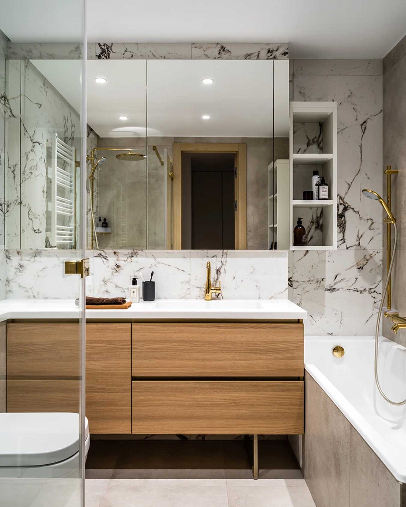 A burkolatok kiválasztásánál nagyon jó minőségű anyagokat használtak. A lakás fő ékköve a konyhai hátfalhoz és munkalaphoz használt kvarcit lett. „A fotók sajnos nem tudják visszaadni ennek a természetes kőnek a teljes mélységét és melegségét.” – mondja a tervező.
