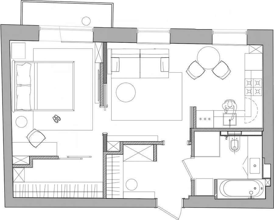 Az eredeti elosztás nem felelt meg a férfinak, mivel fontos szempont volt egy gardróbszoba és elegendő tárolóhely kialakítása, a nappalit és konyhát pedig szerette volna egy térré alakítani.