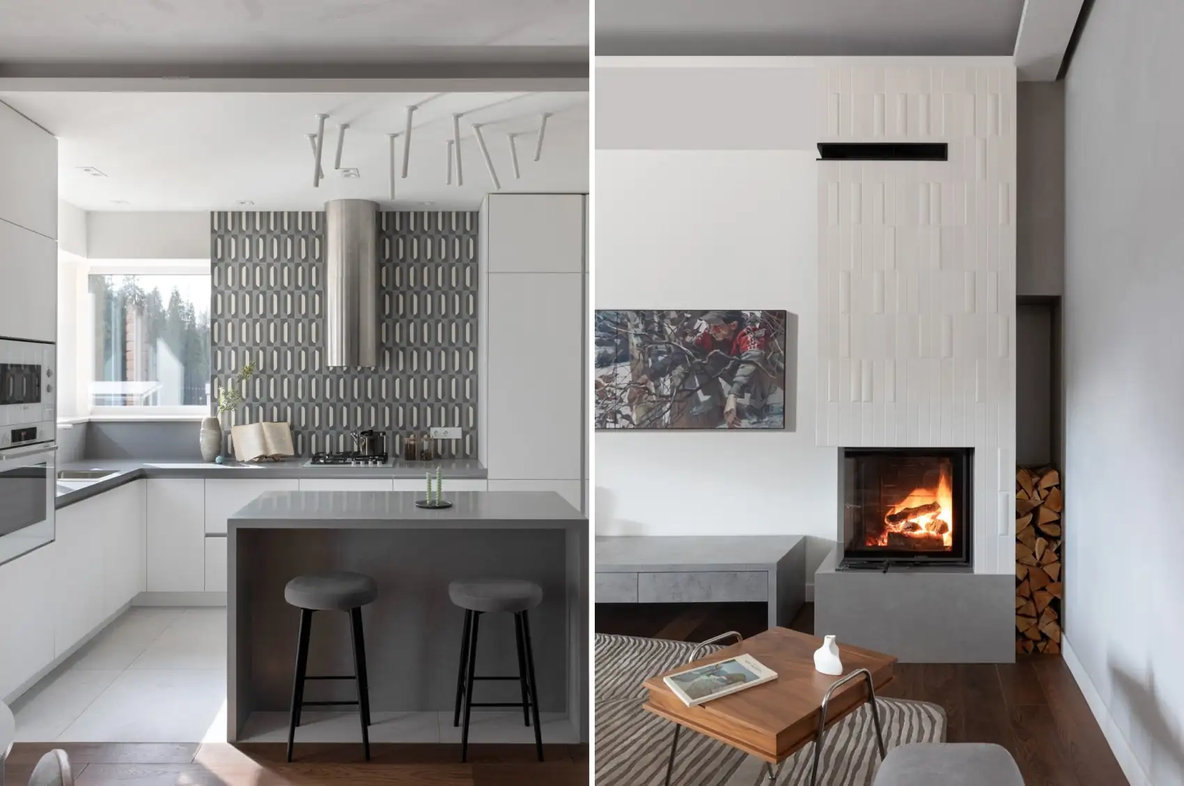A konyha-nappali együttes a ház legvilágosabb helyisége. A burkolatok között megjelenik a dekorvakolat, amely a falról a mennyezetre is felfut, segítve a nappali zónájának vizuális kijelölését. A konyhai hátfalon kézműves csempét használtak, amelynek mintázata a ház többi részének részleteire rímel. Itt jelennek meg az első színfoltok is: a szürkéskék és a smaragdkék. A konyha felszereltsége mindent tartalmaz, ami a főzéshez szükséges: egy nagy, ablak alatti mosogatóval ellátott munkafelületet és egy méretes reggelizőszigetet.