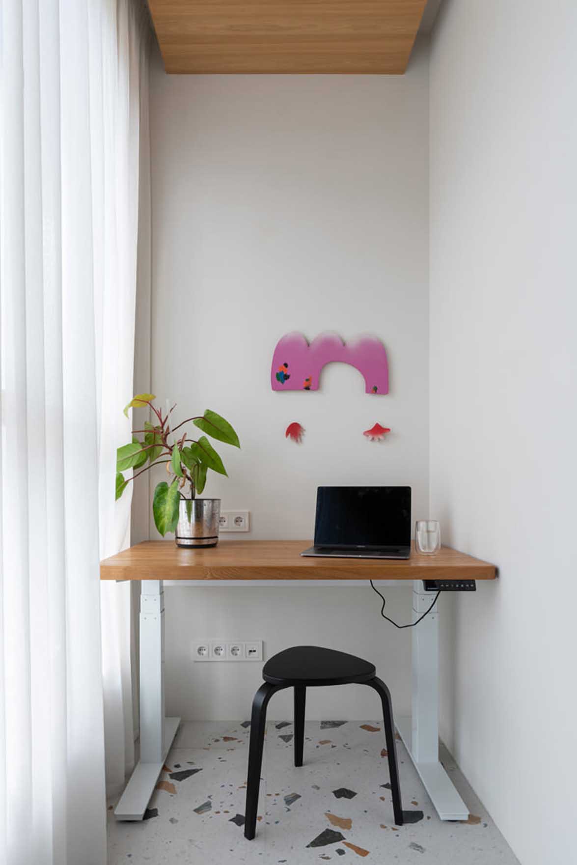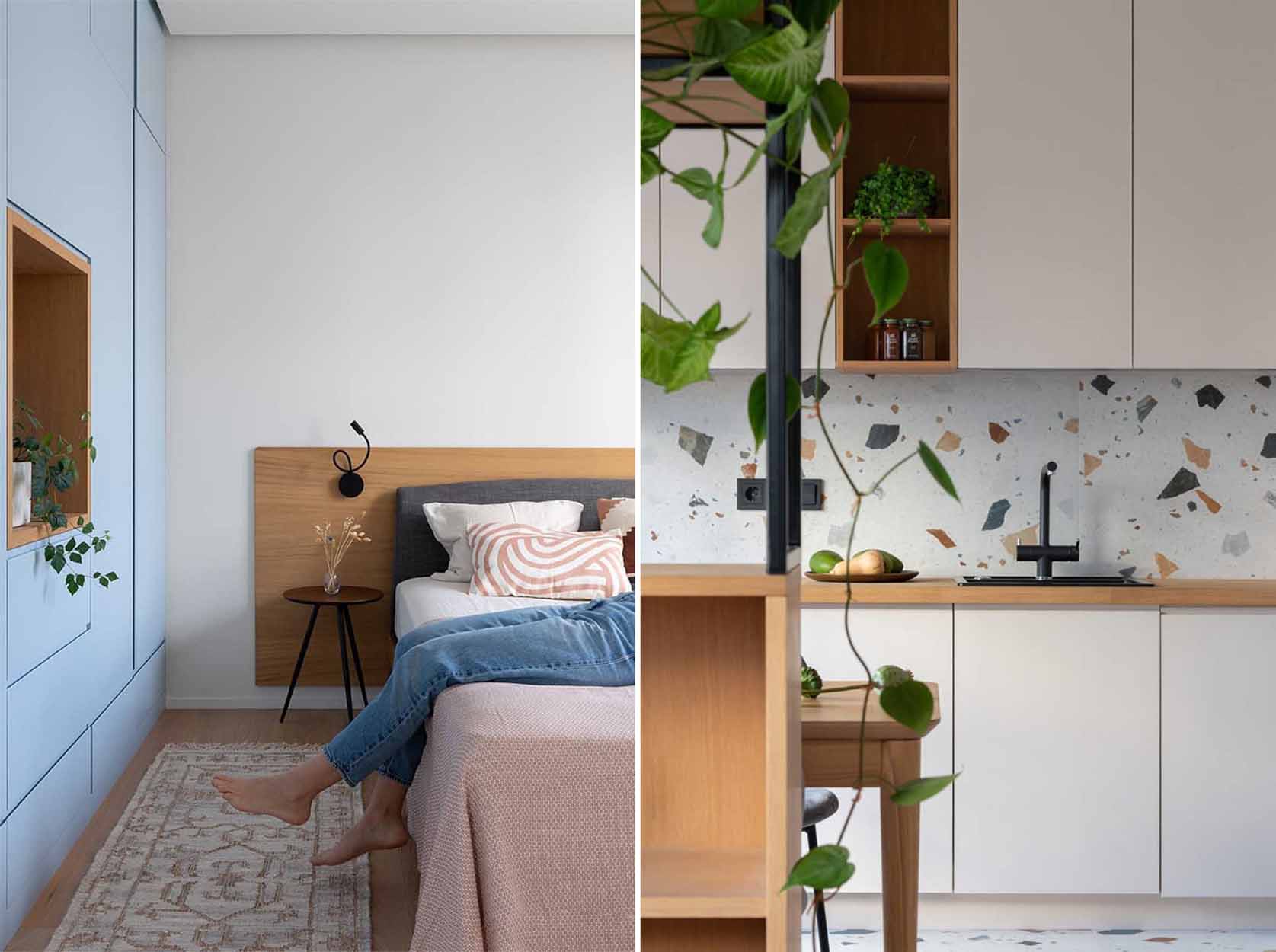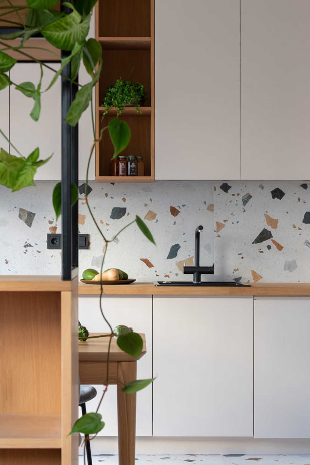 A letisztult formák, a természetes anyagok és a színhasználat ritkán találkoznak ilyen harmonikus egységben. Az enteriőr első pillantásra egyszerűnek tűnhet, a növényfal, a terrazzo minta és a pasztell színek váratlan felbukkanása hihetetlenül üdévé teszi az összhatást. Kiváló példa arra, hogyan érhető el eredeti és egyedi megjelenés viszonylag egyszerű és elérhető eszközökkel.