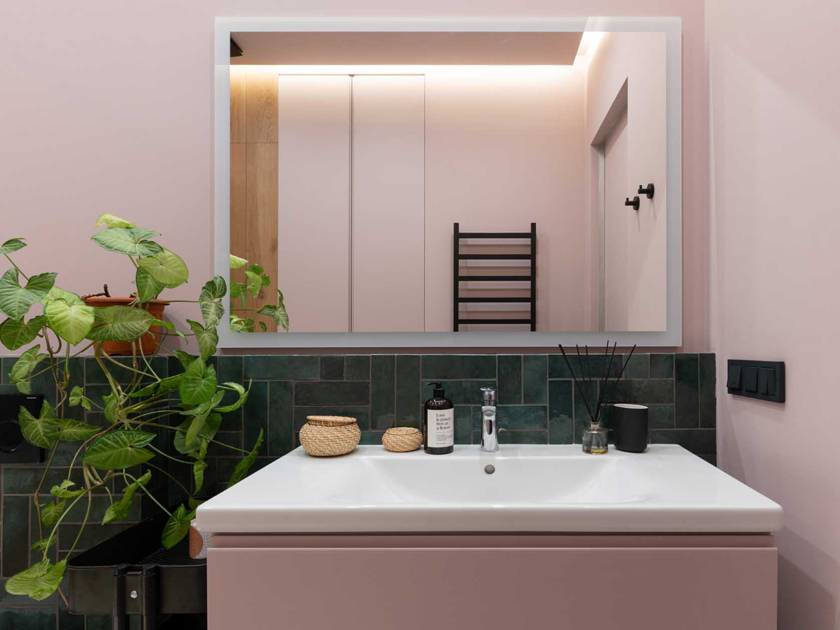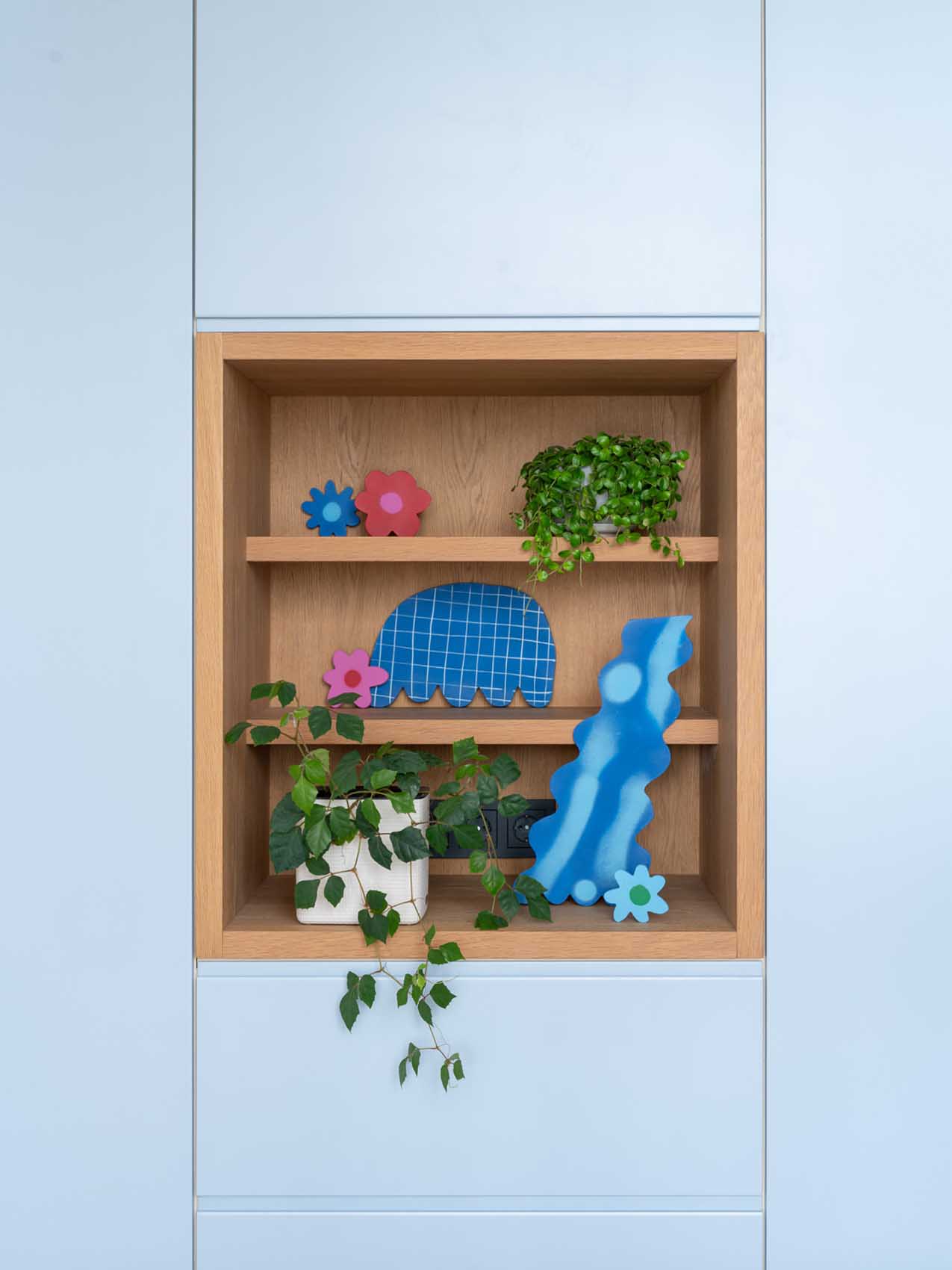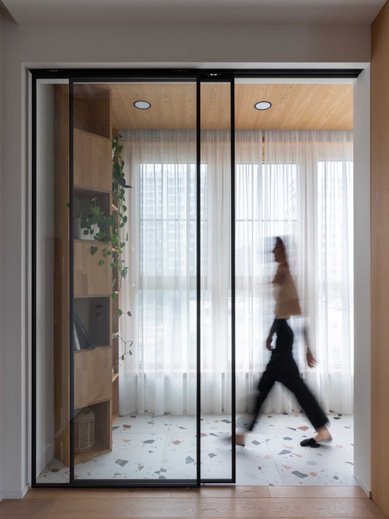 A letisztult formák, a természetes anyagok és a színhasználat ritkán találkoznak ilyen harmonikus egységben. Az enteriőr első pillantásra egyszerűnek tűnhet, a növényfal, a terrazzo minta és a pasztell színek váratlan felbukkanása hihetetlenül üdévé teszi az összhatást. Kiváló példa arra, hogyan érhető el eredeti és egyedi megjelenés viszonylag egyszerű és elérhető eszközökkel.