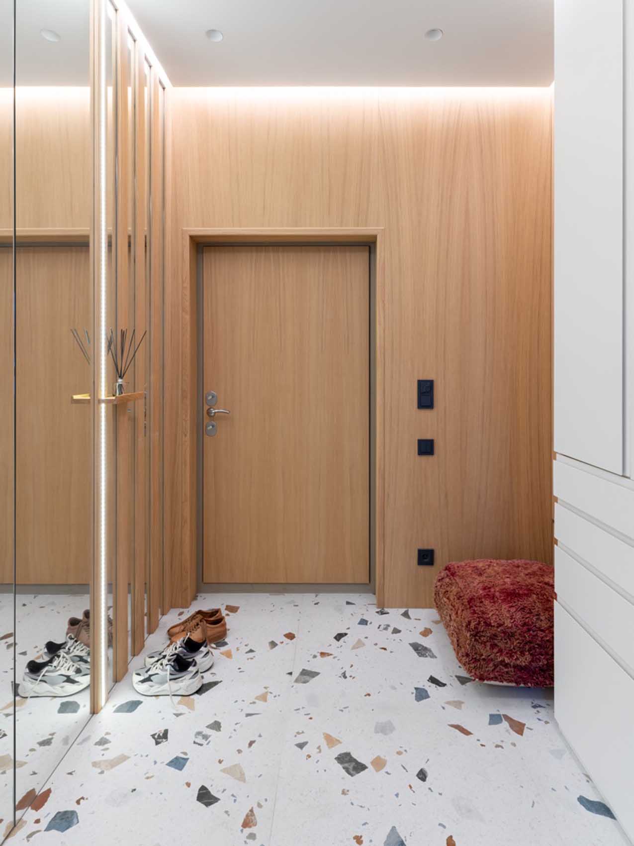 A tervezés során az egyik legnagyobb kihívást a bőséges tárolóhelyek kialakítása jelentette anélkül, hogy a lakás zsúfolttá válna. A tulajdonosok számos hobbinak hódolnak, így helyet kellett találni a szaunázáshoz szükséges kellékektől kezdve a jógafelszereléseken és könyveken át egészen egy komoly bakelitgyűjteményig és egy DJ-pultig. Fontos szempont volt, hogy a lakásban megmaradjon mindkét fürdőszoba, és egyik se váljon raktárrá. Ezt a problémát összesen hat, mesterien elrejtett beépített szekrénnyel oldották meg, amelyek vagy a fal színébe olvadnak, vagy – mint az előszobában – tükrös homlokzatukkal tágítják vizuálisan a teret.