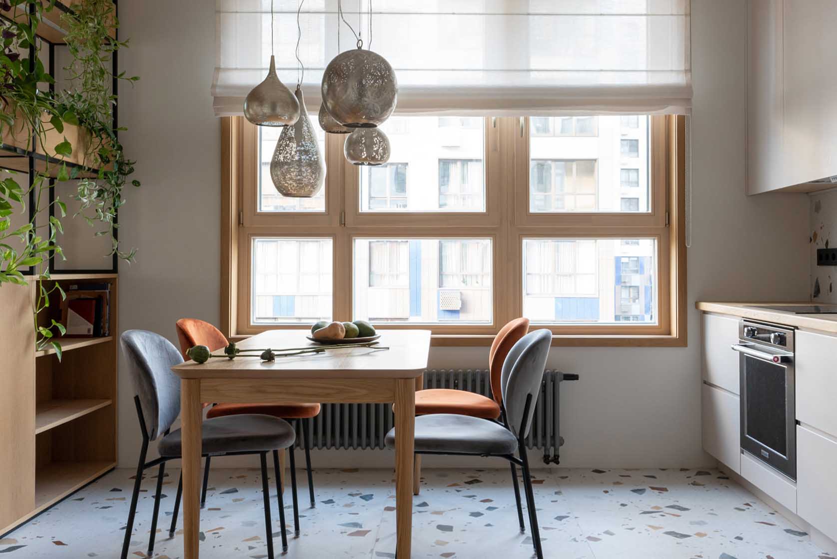 A konyha egyik legkarakteresebb eleme a padlón megjelenő, színes terrazzo burkolat. Ez a vidám minta határozza meg a lakás egészének színpalettáját: a benne rejlő árnyalatok köszönnek vissza a konyhabútoron, az étkezőszékeken és a nappali kanapéján is. A konyhaszekrények faltól falig és padlótól mennyezetig érnek, rejtett fogantyúkkal ellátva, így szinte észrevétlenül simulnak a térbe, miközben minden konyhai gépnek és eszköznek bőséges helyet biztosítanak.
