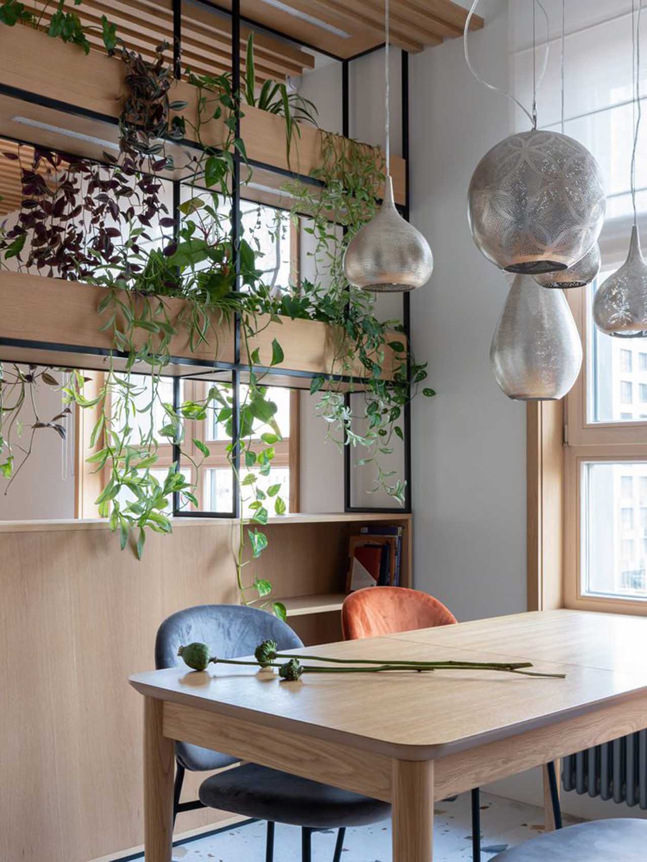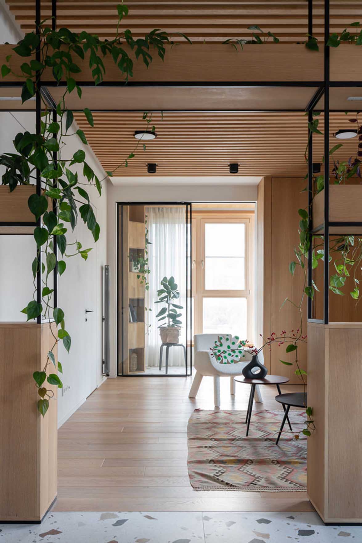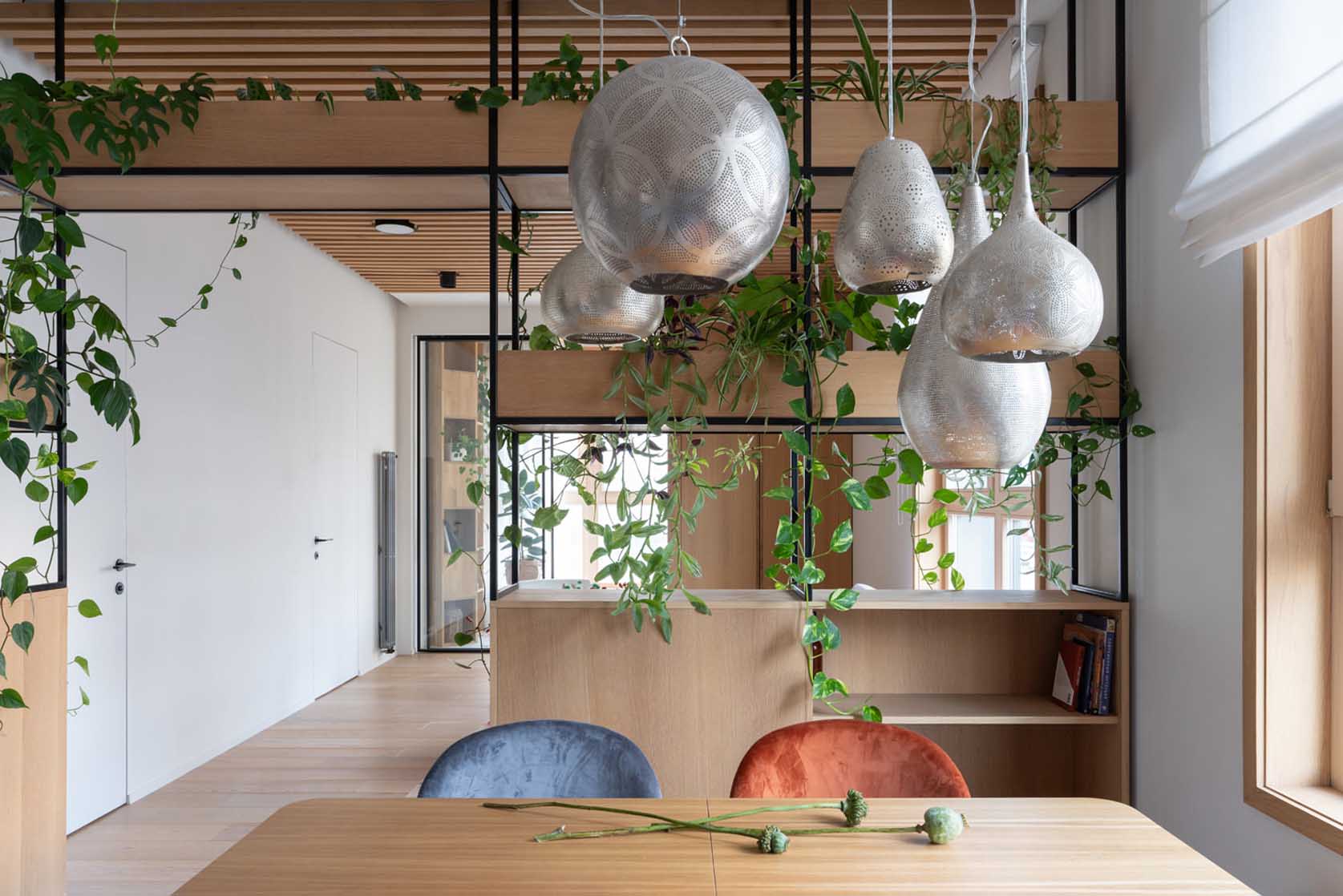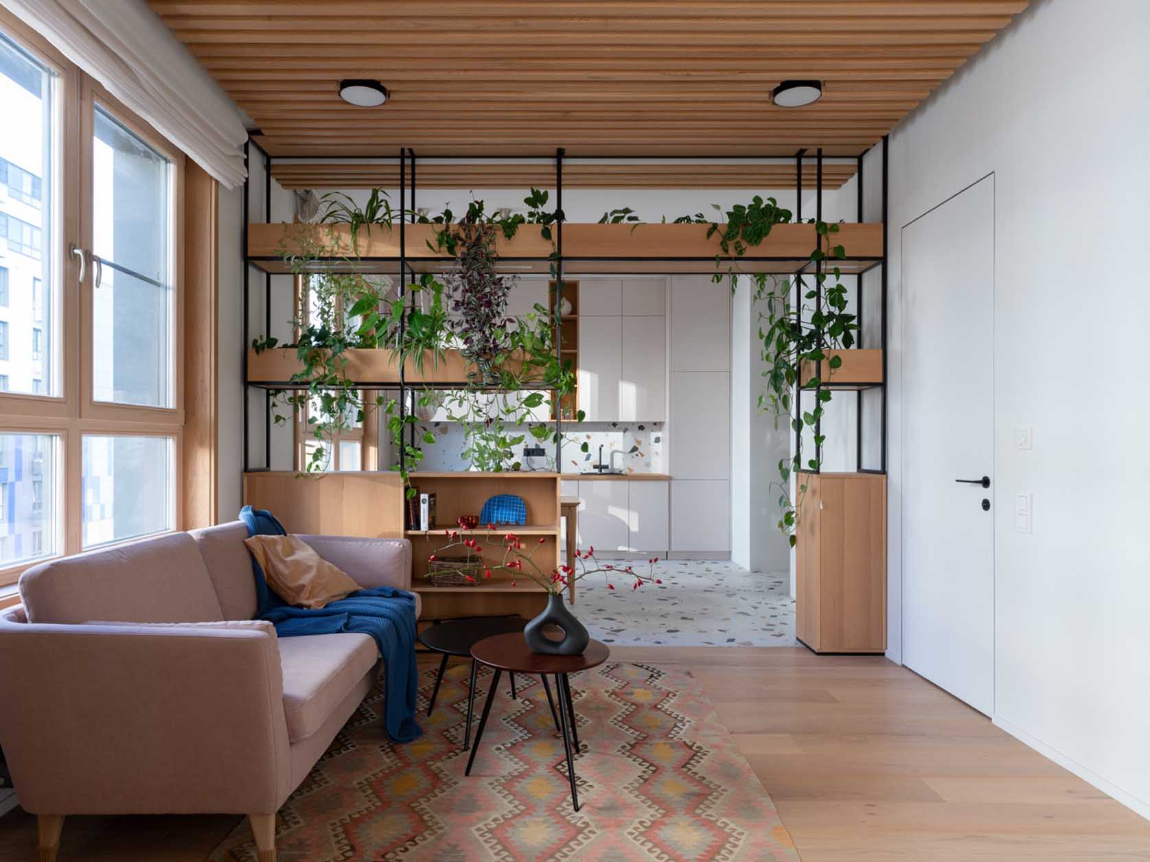 A konyhát és a nappalit egy különleges, egyedi tervezésű növényfal választja el, amely a lakás központi látványeleme. Ez a térelválasztó elegendő súlyt ad a zónázáshoz, de kialakítása révén nem zárja le a teret. A növényfalba speciális növényvilágítást is építettek, amely segíti a zöld flóra fejlődését és hangulatos fényforrásként is funkcionál. A nappaliban a természetes fa dominál. A tárolás itt is maximális: az erkély melletti padlótól mennyezetig érő szekrény rejti a jógaeszközöket, a könyveket és a DJ-pultot.