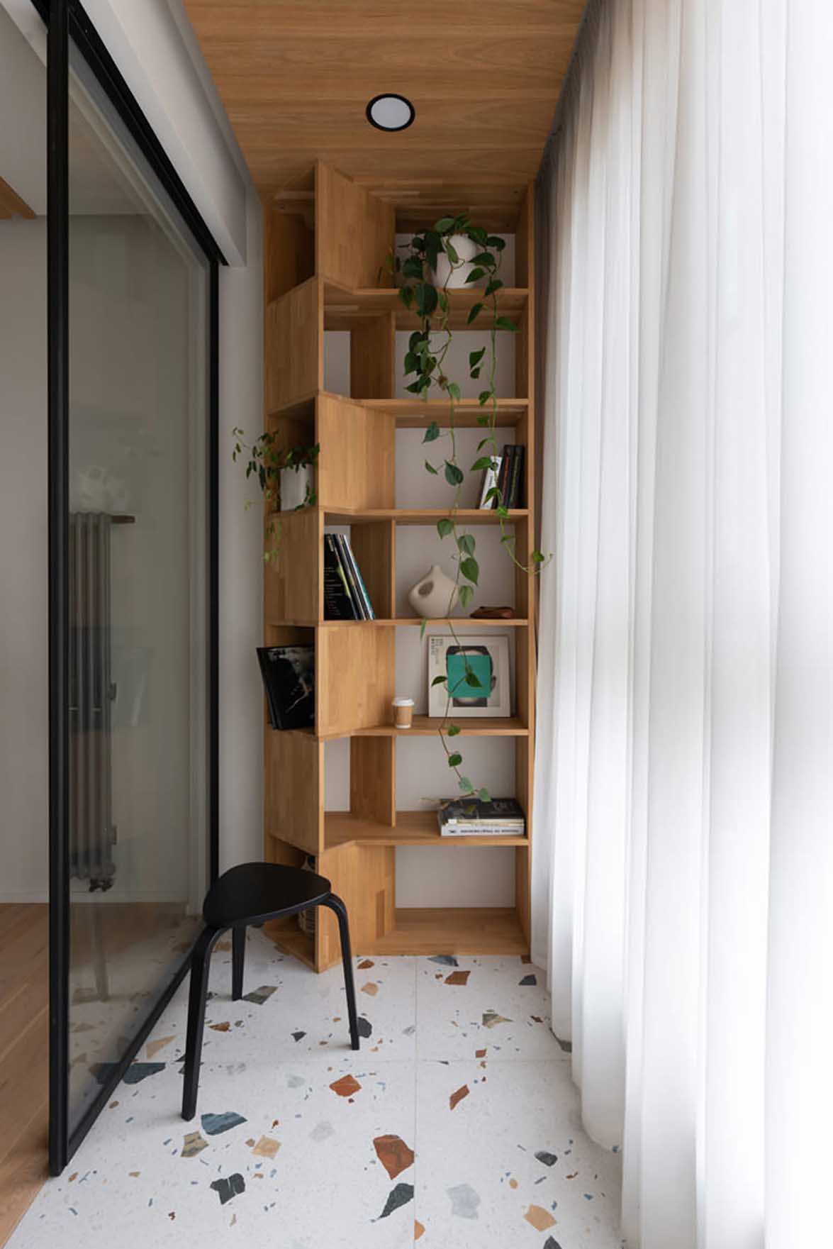 A nappalihoz kapcsolódó erkélyen egy egyedi tervezésű, nyitott polcrendszert helyeztek el. A tervezők figyeltek arra, hogy a lakás belsejéből jól látható polcélek esztétikusak legyenek: ide kerültek a legszebb dísztárgyak, szobrok és albumok, míg a másik oldalon egy dolgozósarok kapott helyet.