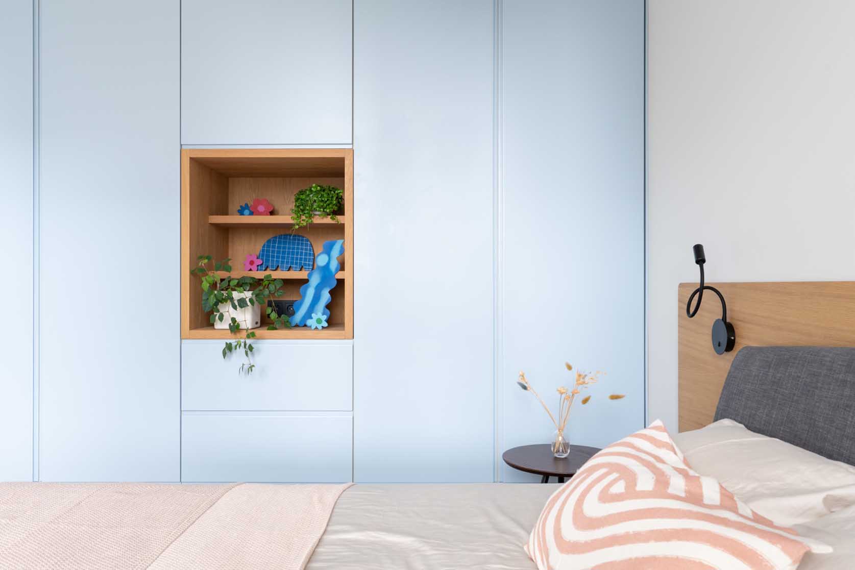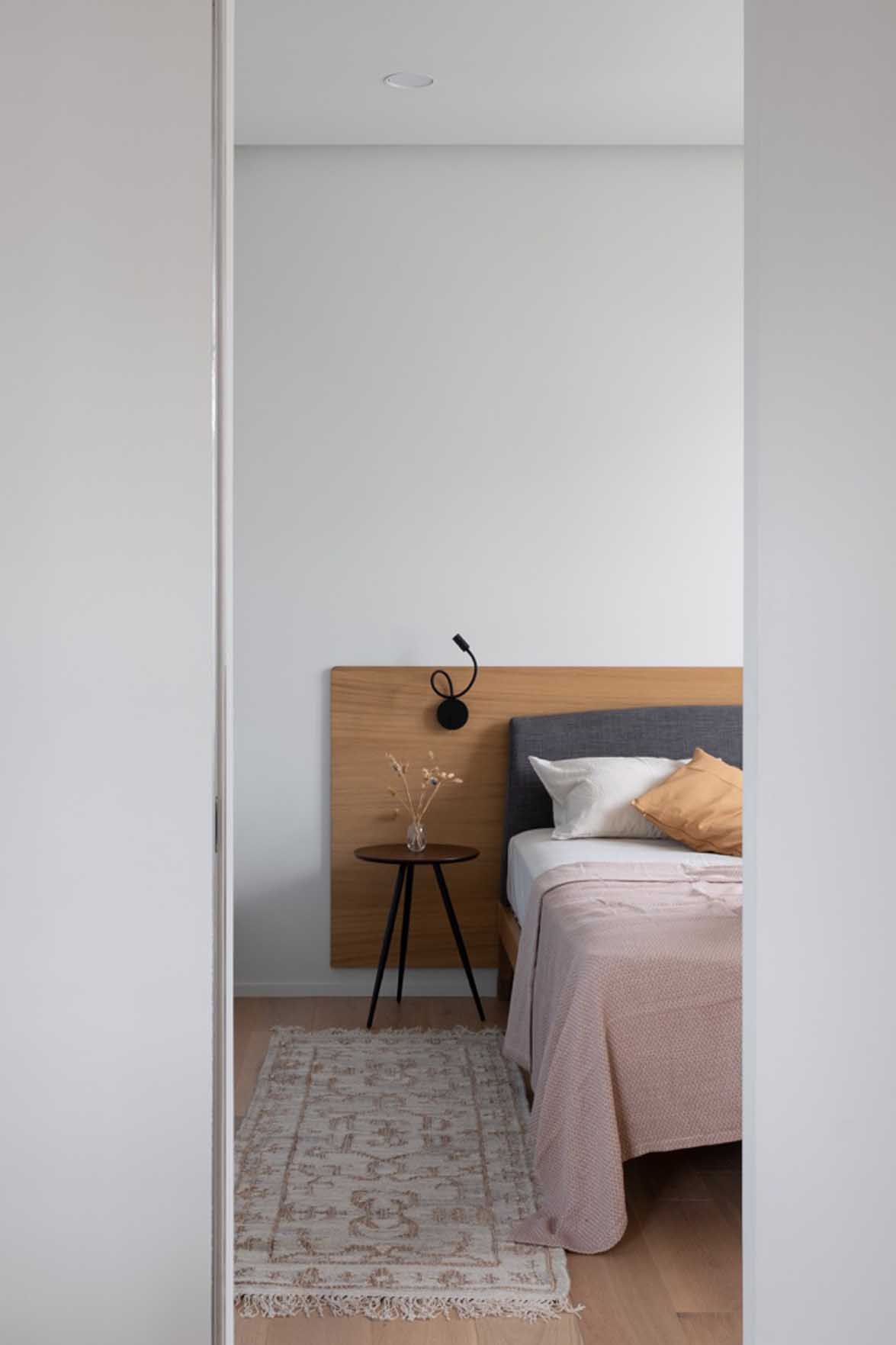 A hálószobában a letisztult formák segítik a pihenést. A tárolást itt egy nagyméretű, faltól falig érő, beépített szekrénysor biztosítja, amelynek vonalvezetése és rejtett fogantyúi miatt szinte észrevehetetlen marad, mégis elnyeli az összes ruhát és textíliát.