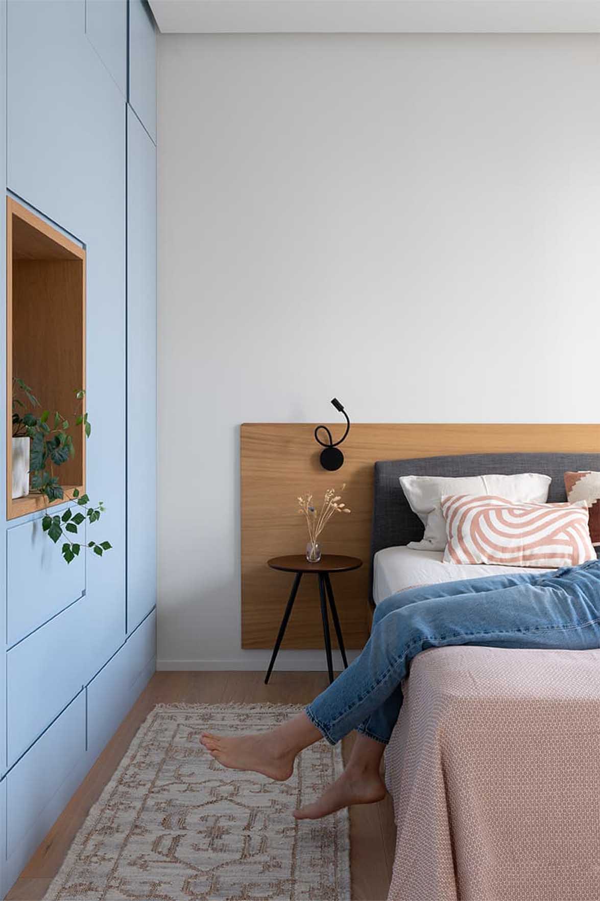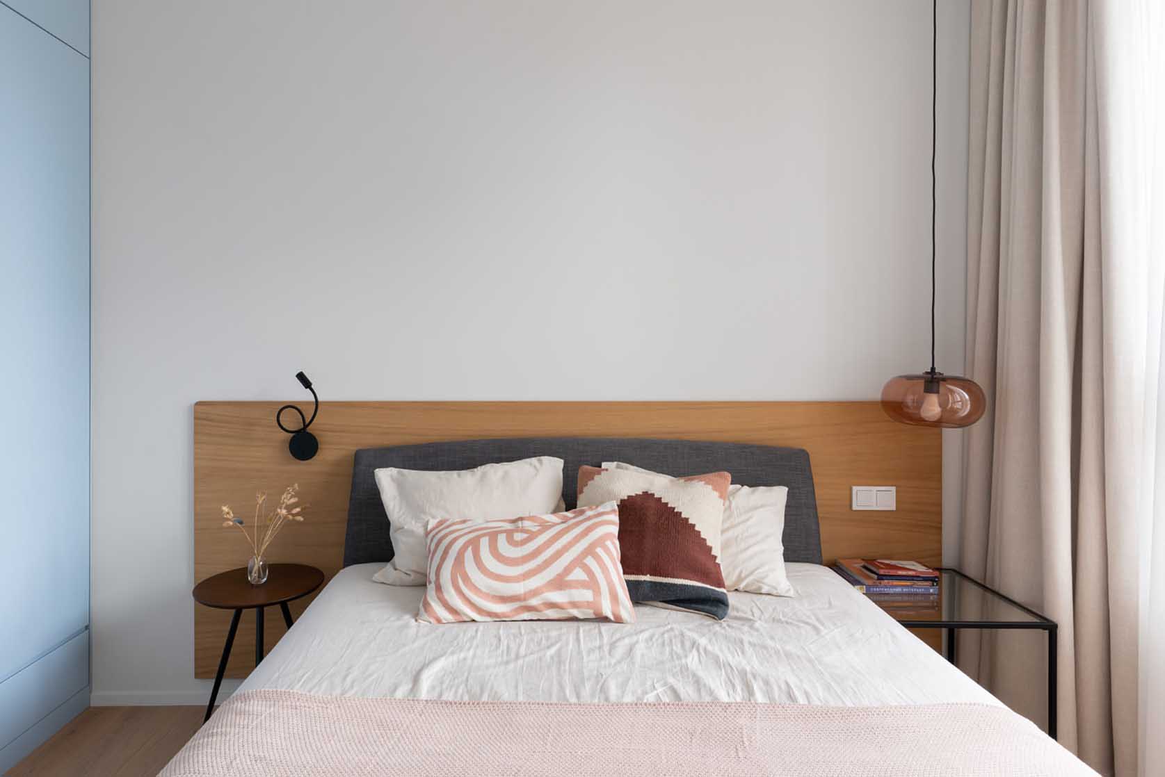 Ezt a 62 négyzetméteres lakást egy fiatal pár számára rendezte be a belsőépítész. Határozott elképzelésekkel érkeztek a tervezőhöz: egy visszafogott, tiszta teret szerettek volna, ahol a lehető legtöbb természetes anyag és pasztell szín jelenik meg. A végeredmény egy olyan enteriőr lett, amelyet tulajdonosai „meditatívnak” és „pihentetőnek” neveznek. Ez a kettősség – a vidám színek és a nyugodt hangulat – a szigorú formák, a tágas, levegős terek, a bőséges faanyag és az élő növények tudatos alkalmazásának köszönhető.