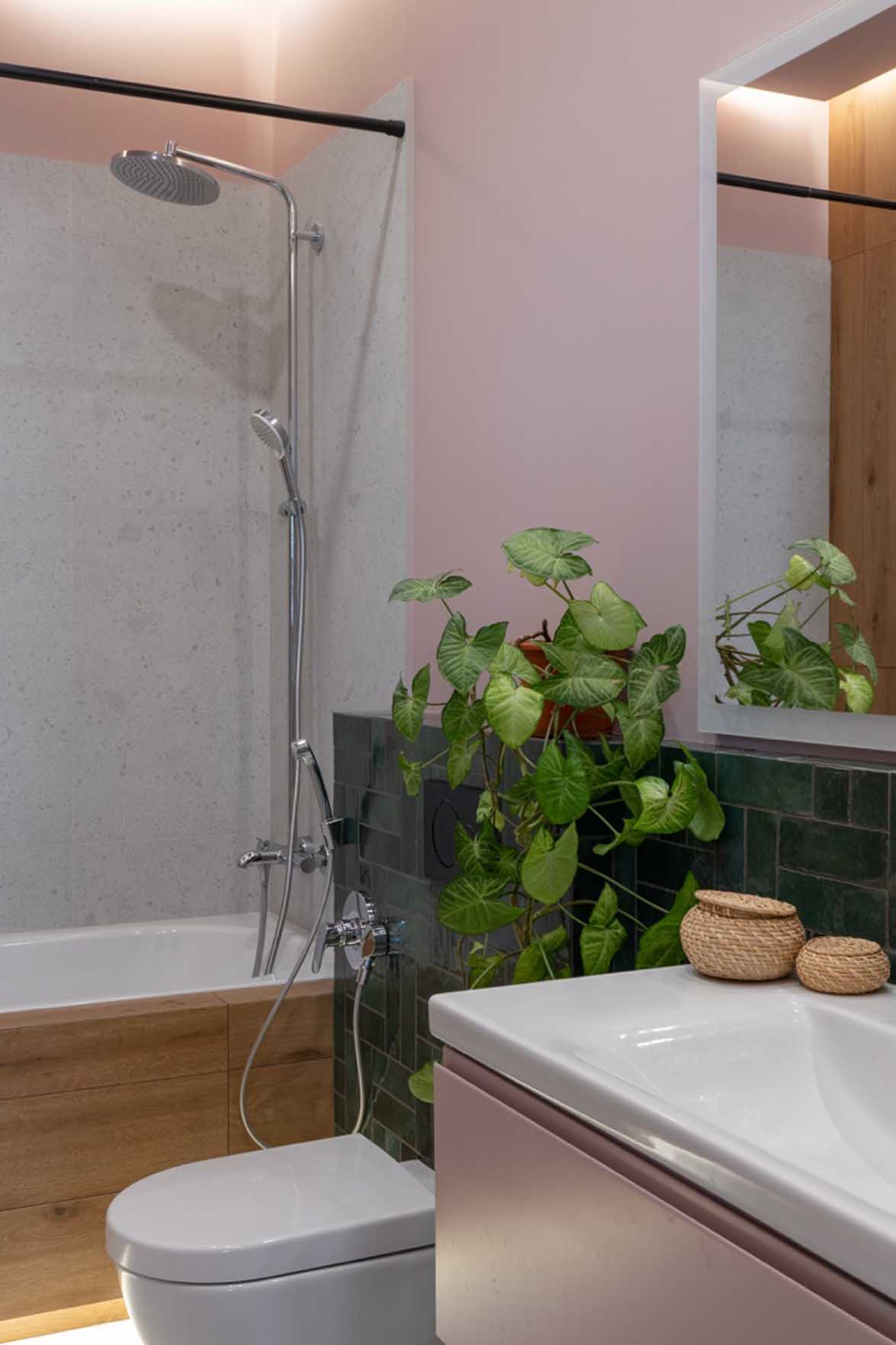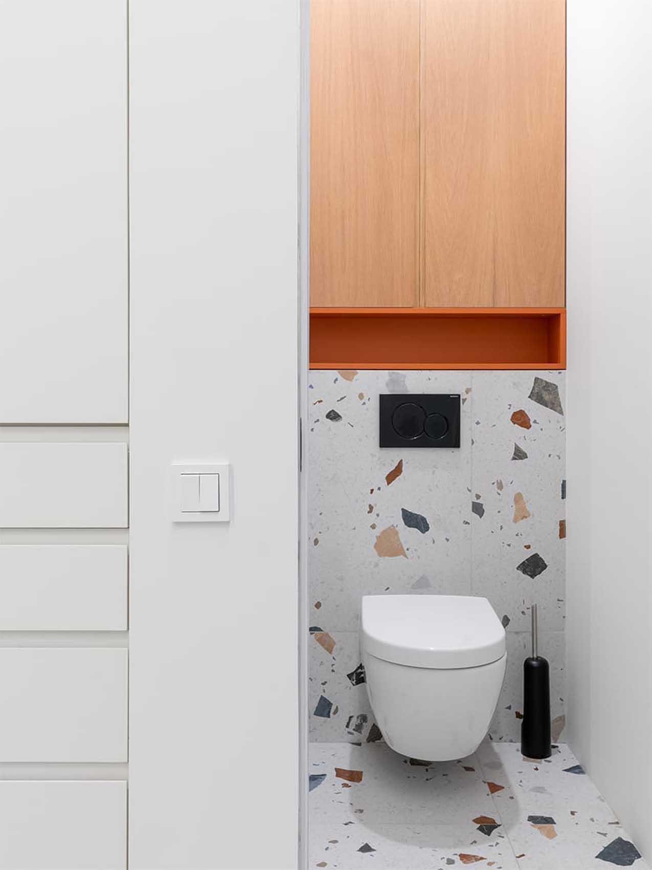 A lakásban külön vécét és fürdőszobát is kialakítottak, fokozva a reggeli készülődés kényelmét. A praktikum jegyében a fürdőszoba egyik falfülkéjében, beépített ajtók mögé rejtették a mosó- és szárítógépet, a vízmelegítőt, valamint az összes tisztító- és mosószert, így a látvány mindig rendezett és tiszta marad.