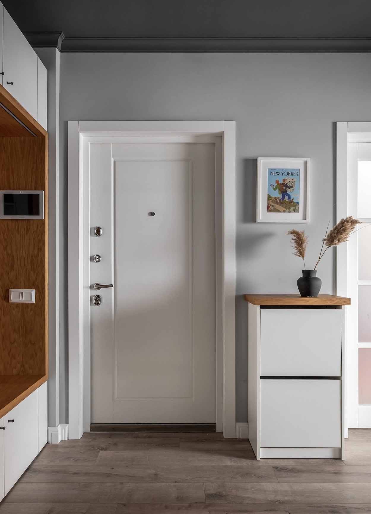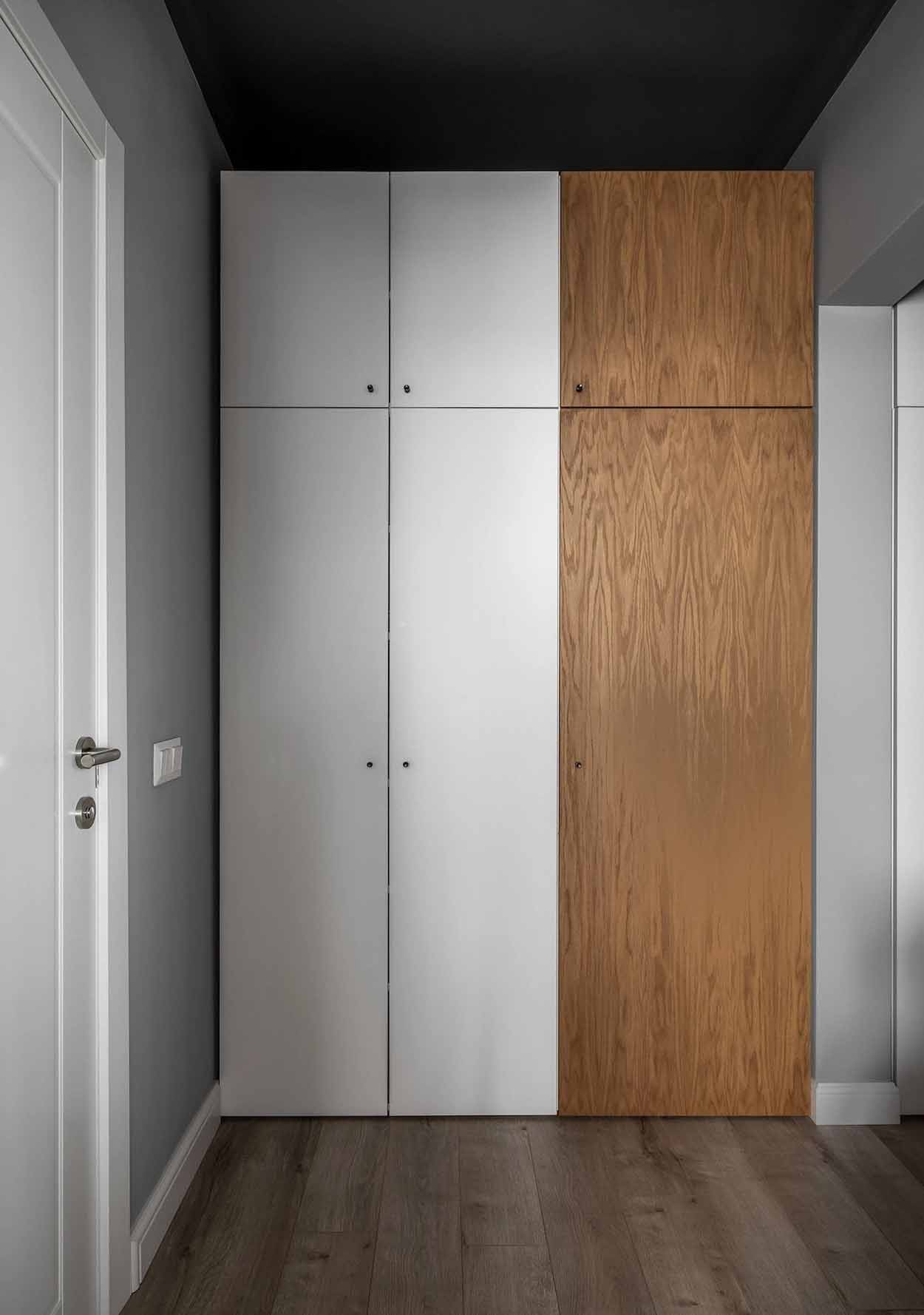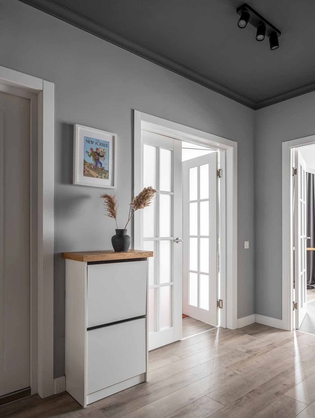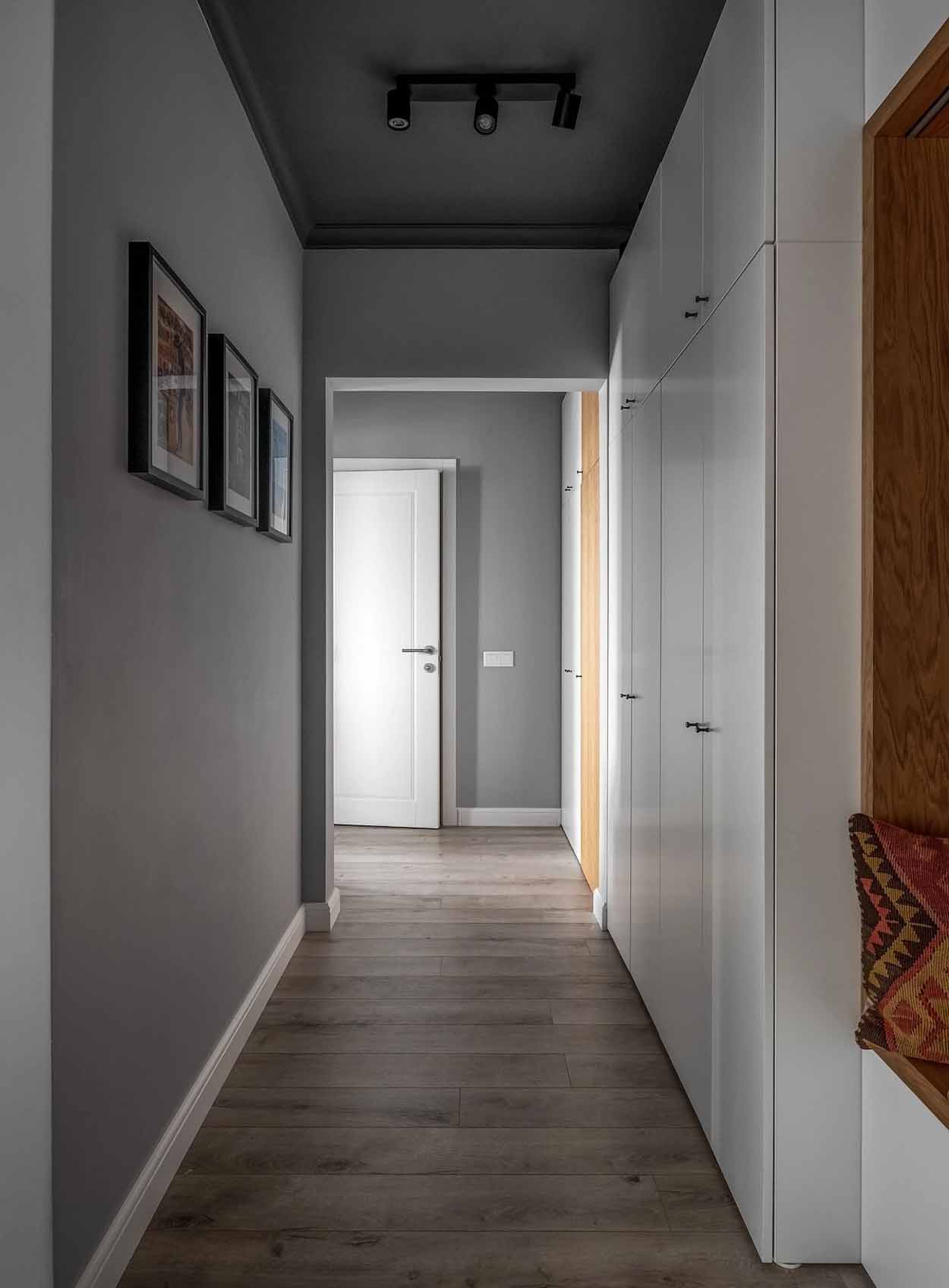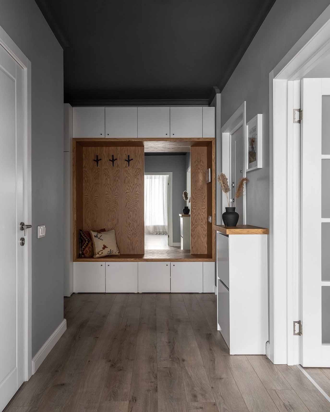 Az előtérben a mennyezetet drámai feketére festették, ami optikailag keretbe foglalja a teret. A tárolást nagyméretű, beépített szekrényrendszer biztosítja, amelyet fa frontokkal és egy egyedi fa fülkével tettek izgalmasabbá. Ez a megoldás nemcsak a praktikumot szolgálja, hanem melegségével ellensúlyozza a sötét mennyezetet. Egy nagyméretű tükör és egy funkcionális cipősszekrény teszi teljessé a zónát, ahol a világítást modern sínrendszeres spotlámpák biztosítják.