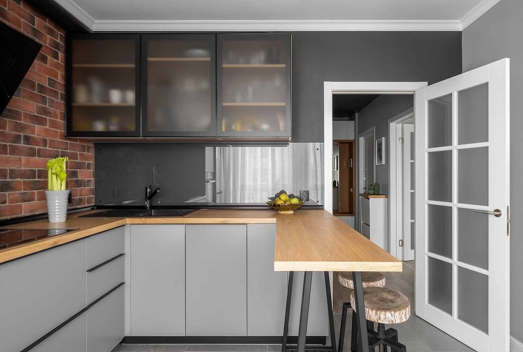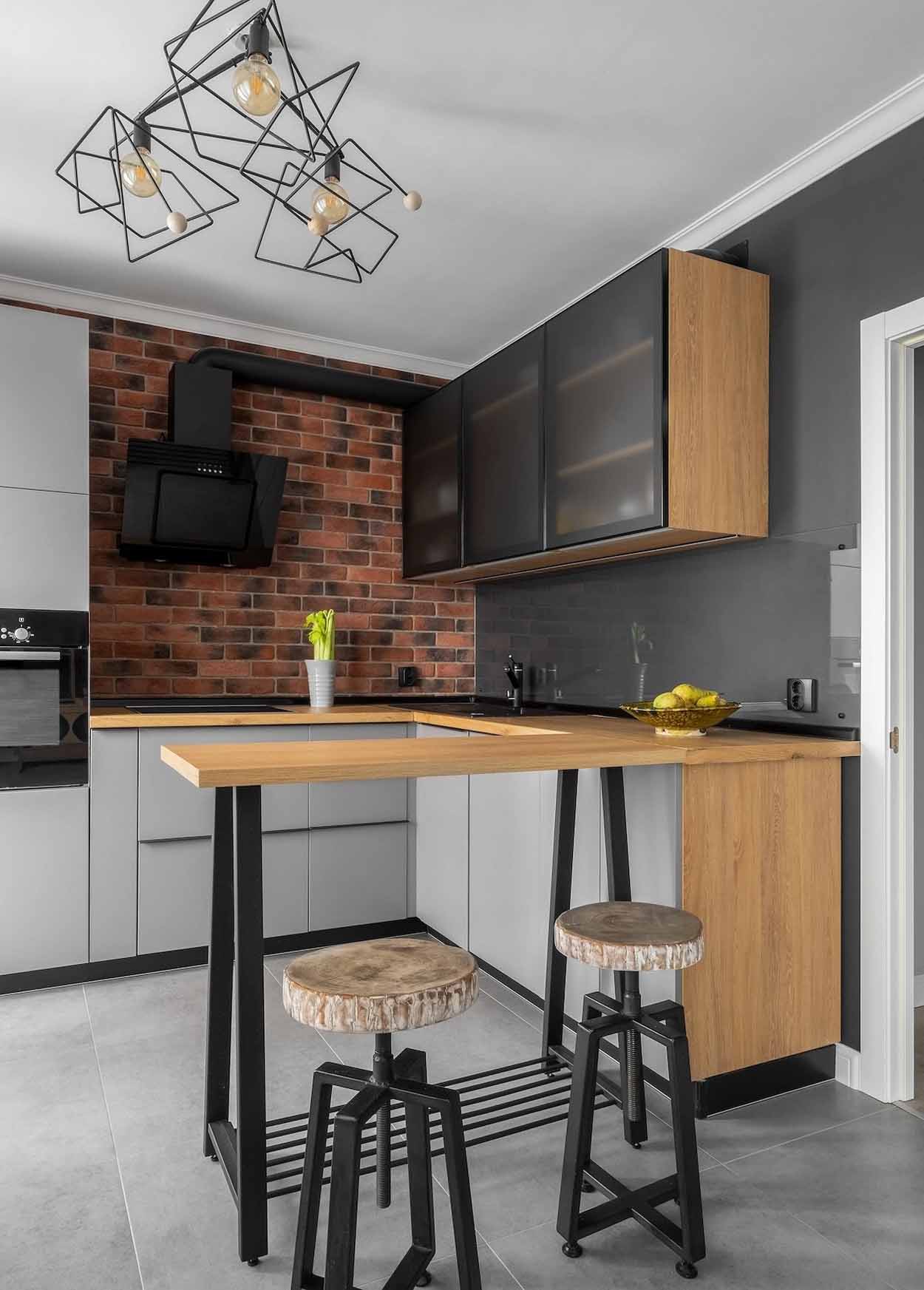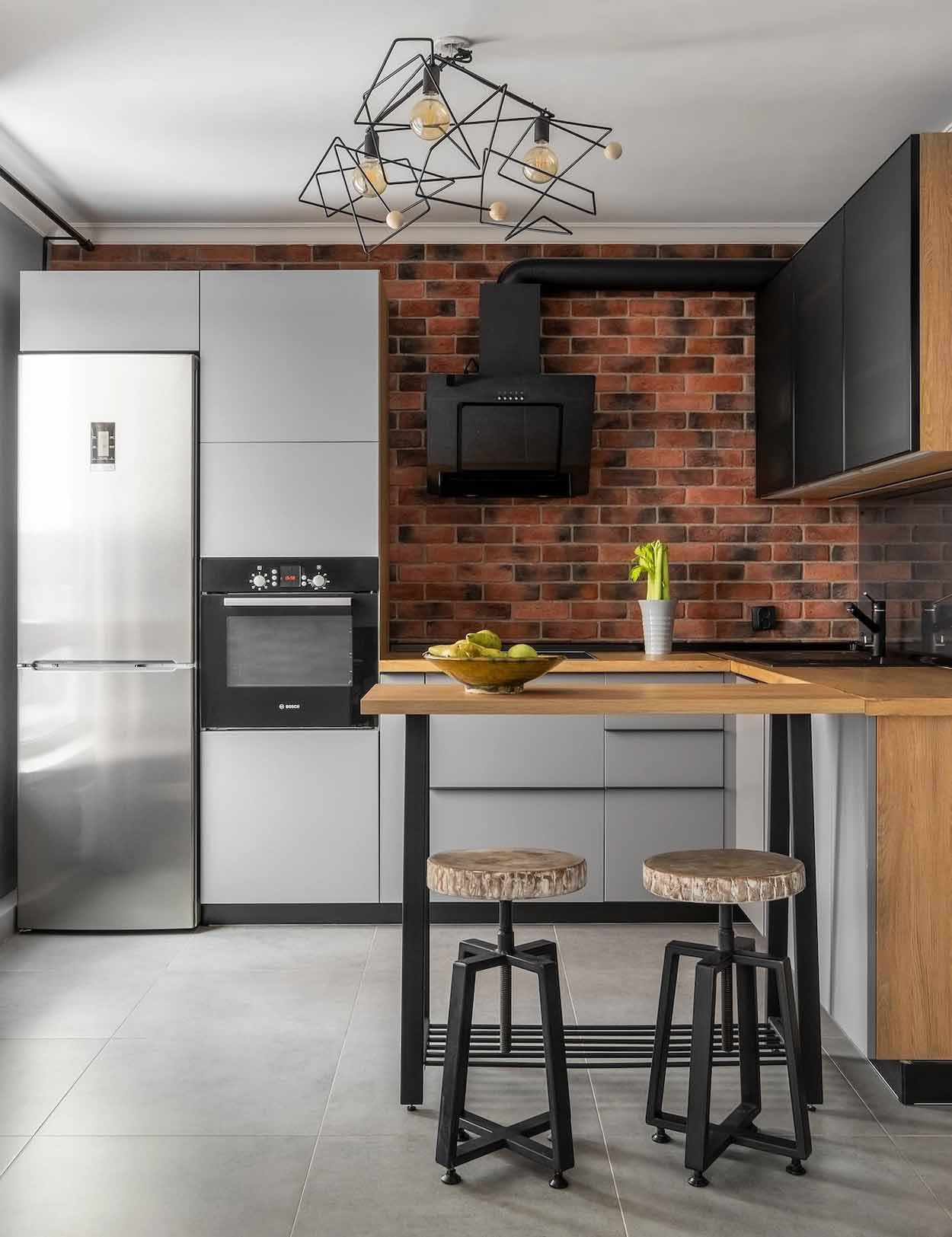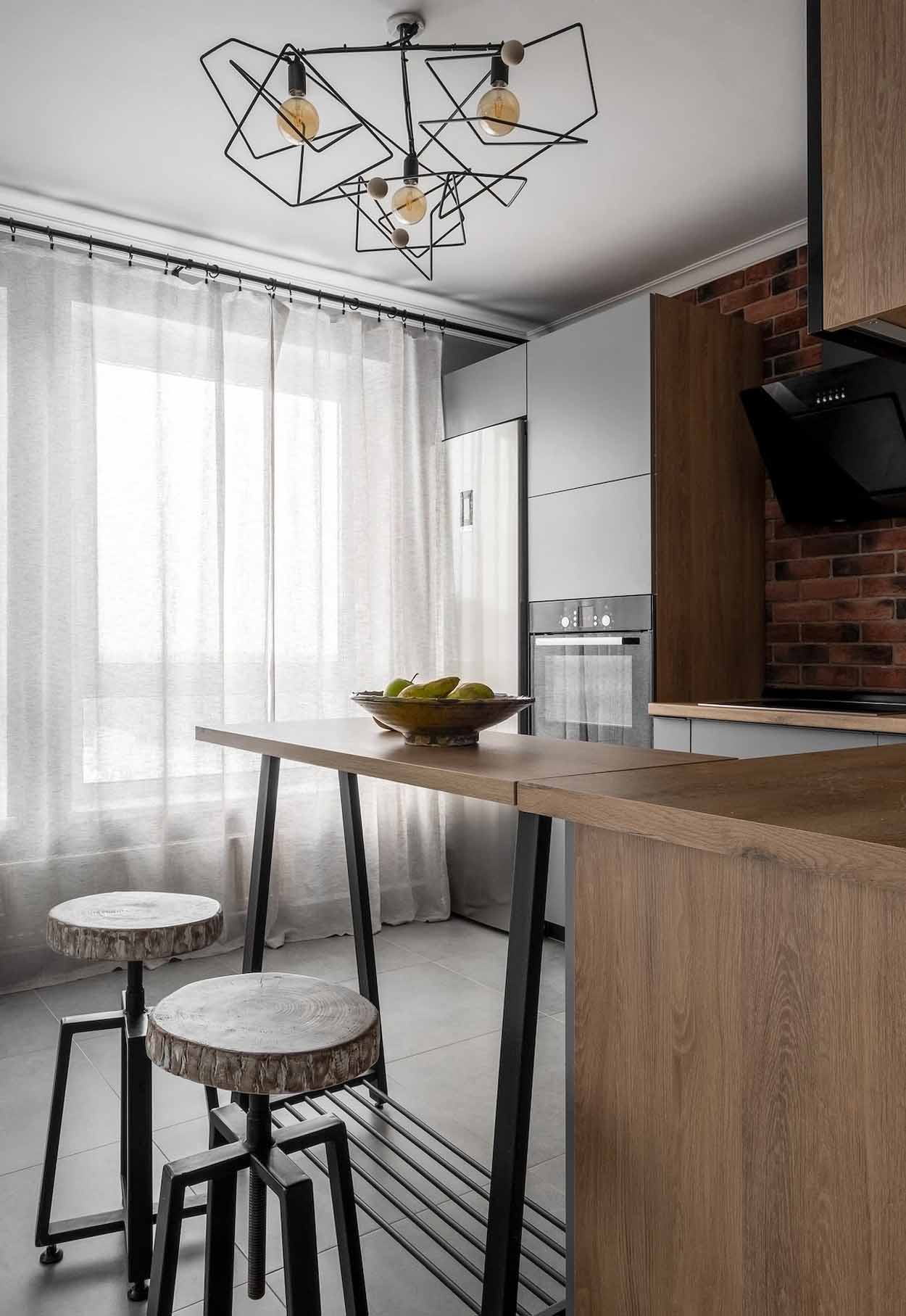 A konyha a loft stílus jegyeit hordozza: a munkapult feletti hátfalat rusztikus téglaburkolat fedi, amelyet edzett üveglappal védtek meg a szennyeződésektől. Az L-alakú elrendezésbe minden modern konyhatechnológiai eszközt integráltak. Az étkezőasztalt egy reggelizőpult helyettesíti, amelyhez egyedi, természetes fapallókból készült bárszékek tartoznak – utóbbiak a férj keze munkáját dicsérik, becsempészve a természetes fa érintését. A világításról itt függesztett lámpák és célzott fényforrások gondoskodnak, hangulatos és funkcionális környezetet teremtve.