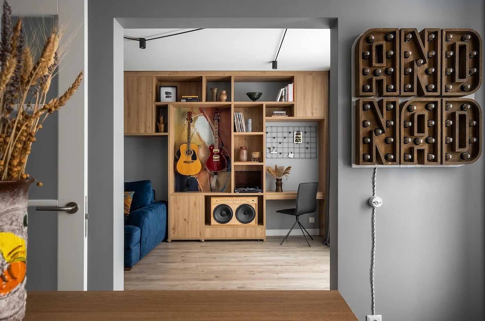 A projekt egy fiatal párnak készült, akik egy újszerű állapotú, de jellegtelen ingatlant szerettek volna élettel és funkcióval megtölteni. A férj zene iránti szenvedélye, a feleség jóga iránti elkötelezettsége, valamint a bőséges tárolóhelyek iránti igény határozta meg a tervezési folyamatot. A cél egy olyan vibráló, mégis élhető belső tér kialakítása volt, amely egyszerre tükrözi mindkét lakó egyéniségét anélkül, hogy a látvány zsúfolttá válna.