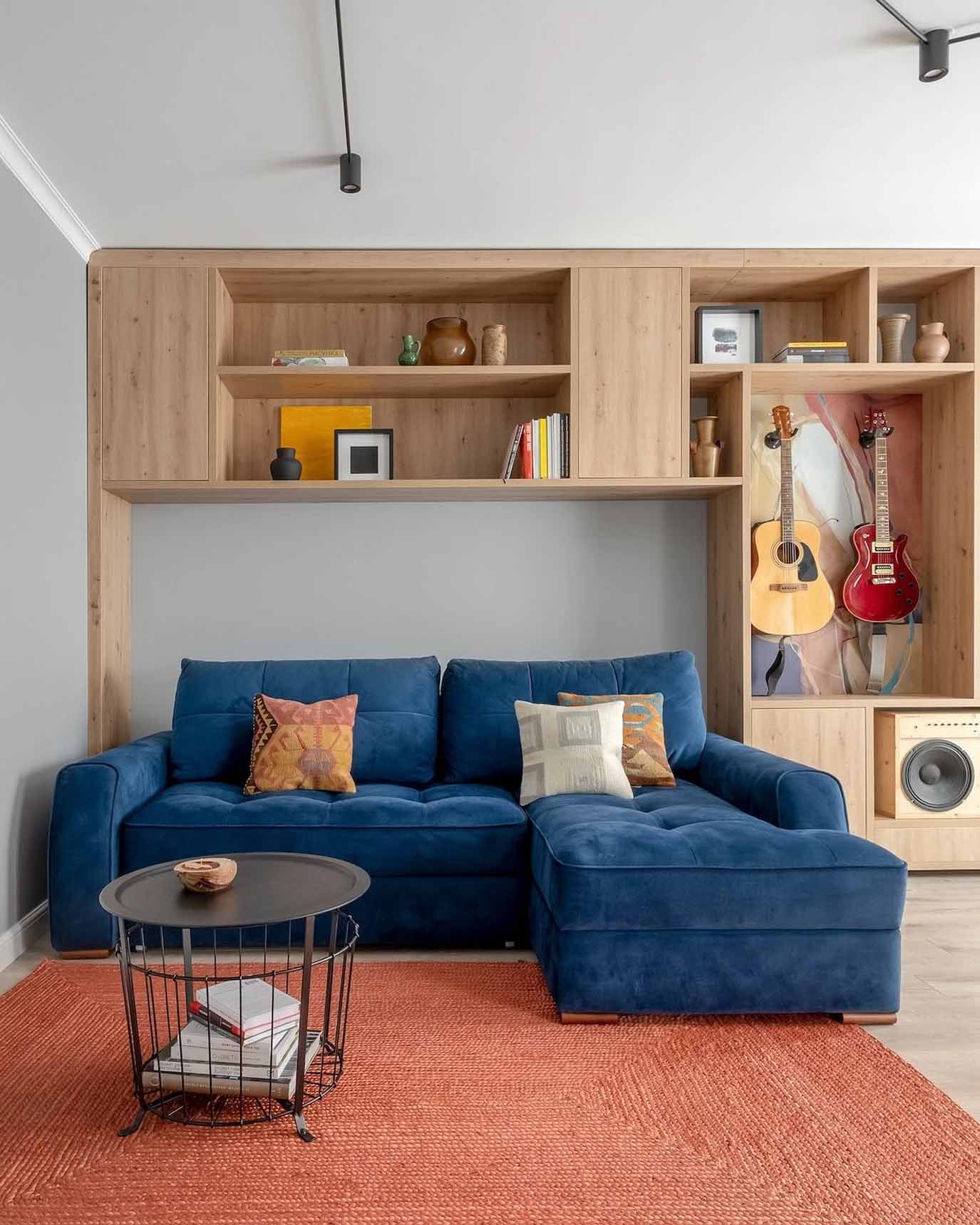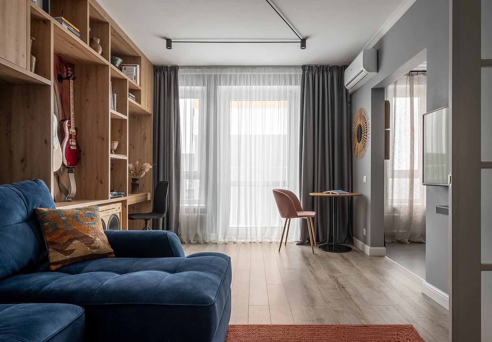 A kétszárnyú ajtón keresztül megközelíthető nappali a lakás központi közösségi tere, ahol a klasszikus és a vidéki stílus dominál. A világosszürke falakat elegáns fehér ajtók, magas lábazati szegélyek és mennyezeti stukkók díszítik. A szoba egyik teljes falfelületét egy egyedi gyártású tárolórendszer foglalja el, amely nyitott polcokat tartalmaz a hangszerek számára, valamint egy integrált dolgozósarkot is magában foglal. A tér közepén elegendő szabad hely maradt a jógázáshoz. A dekorációban megjelenő festmények, természetes anyagú szőnyegek és fonott részletek a vidéki stílus romantikáját és eredetiségét hangsúlyozzák.