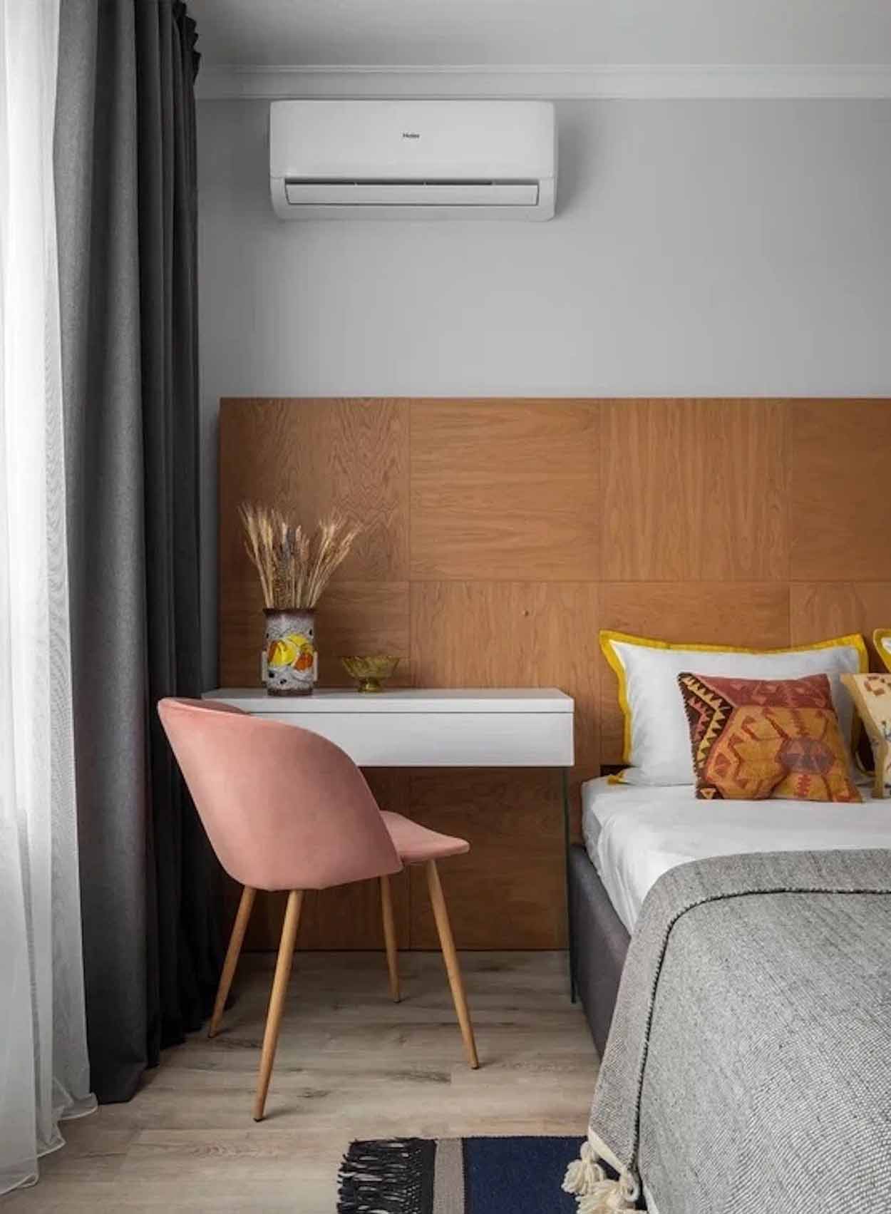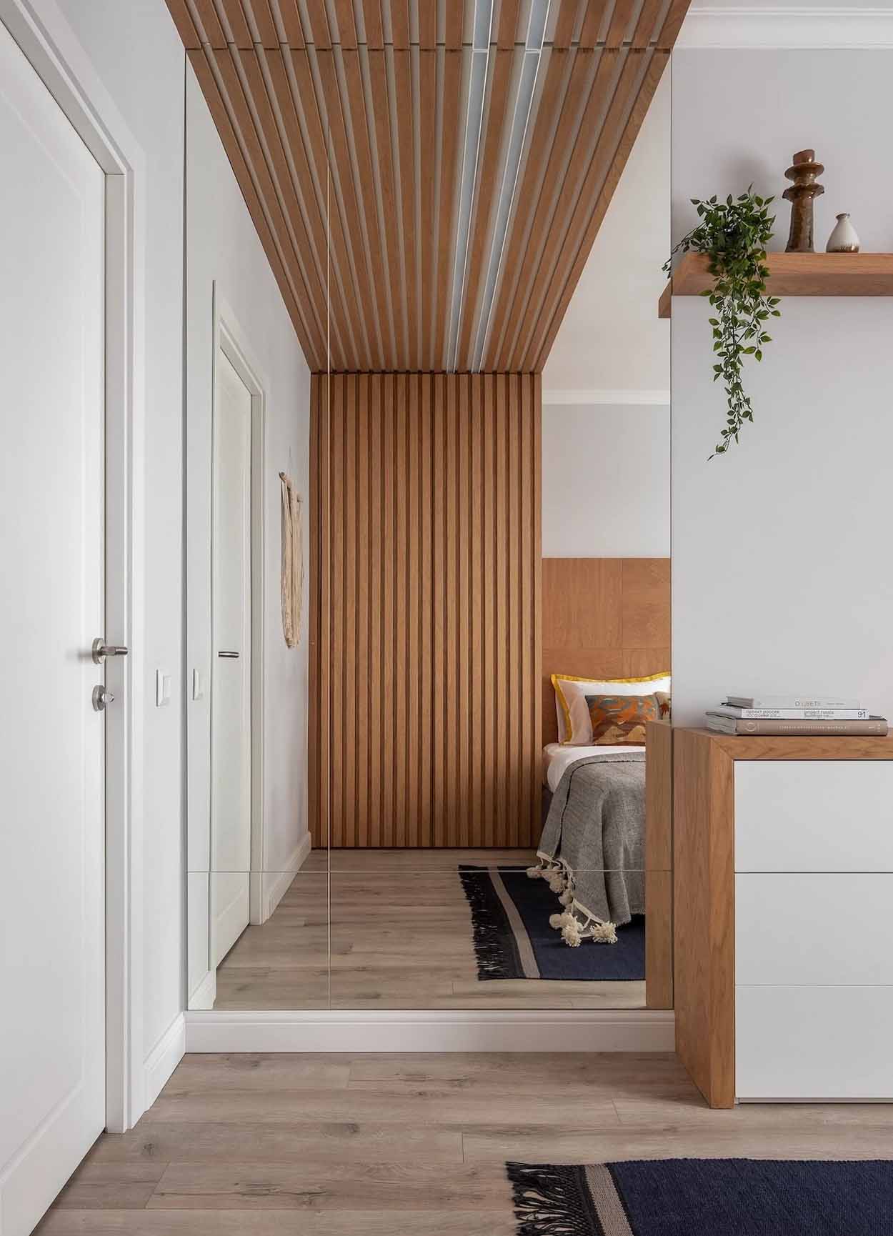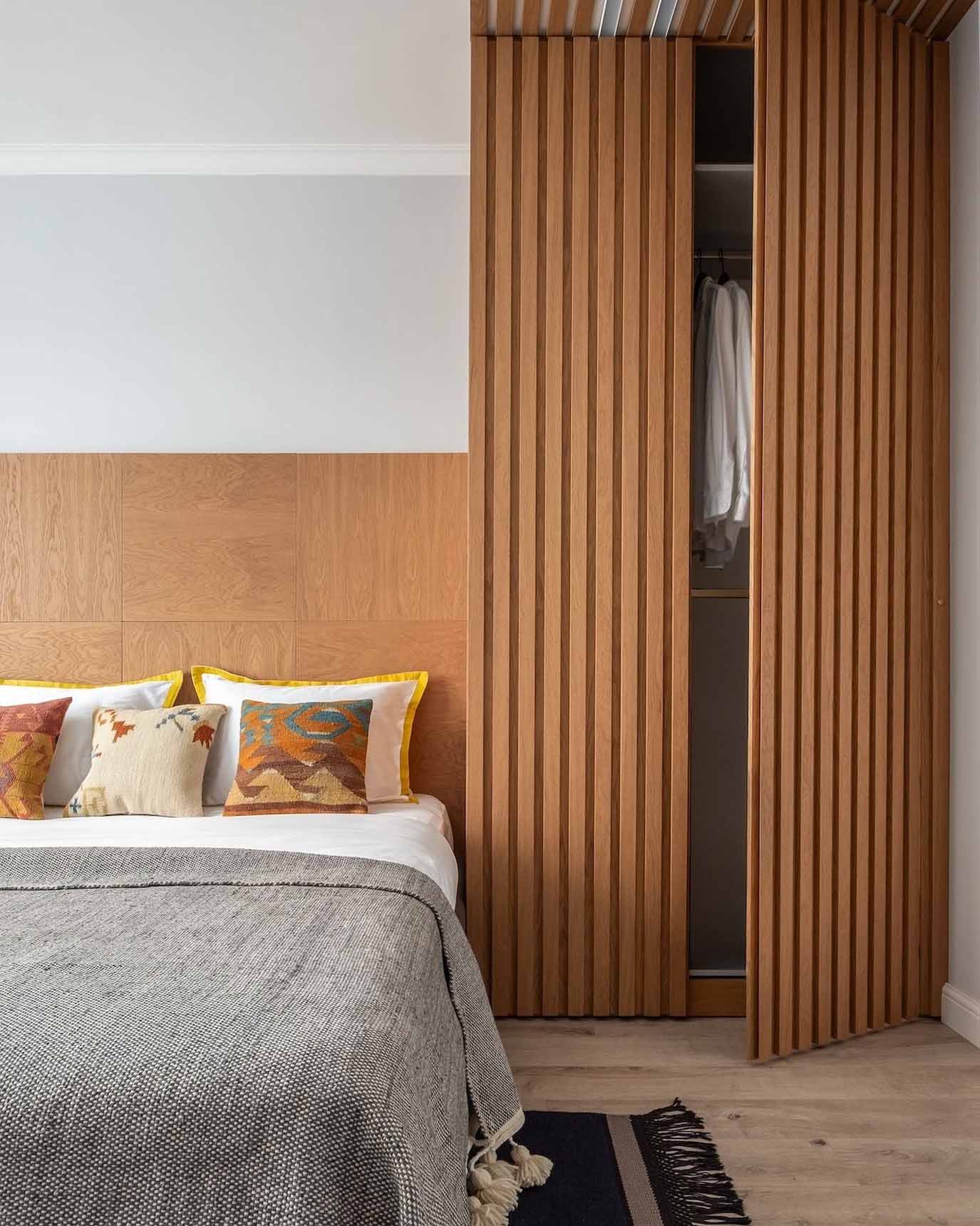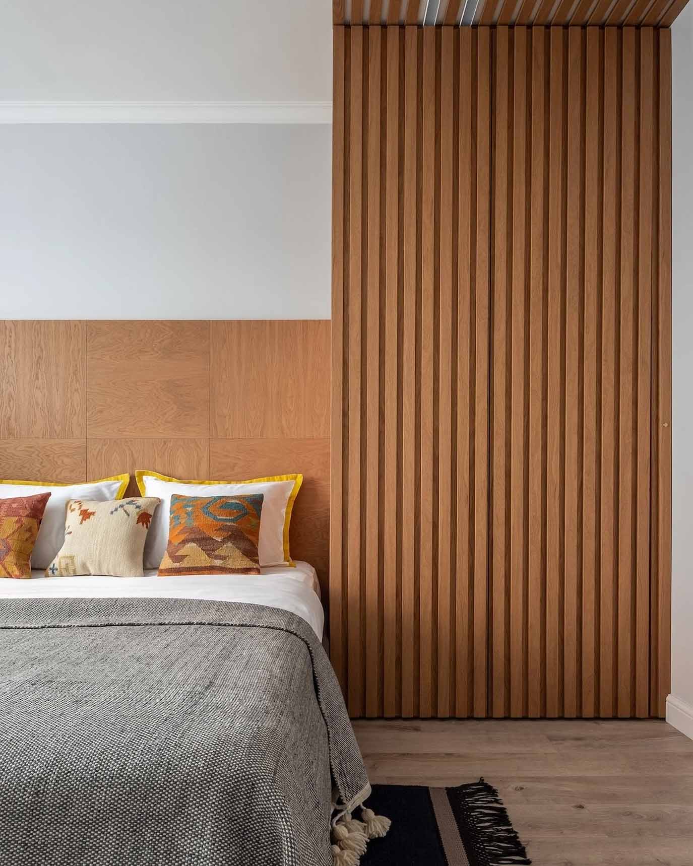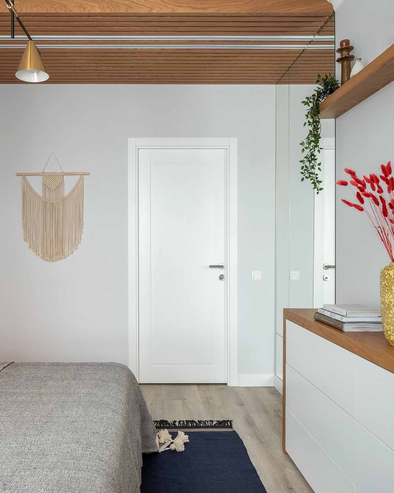 A hálóban a fa használata dominál. Az ágy fejtámláját egyedi fa panelsor alkotja, amely a fal alsó részén fut végig, a mennyezeten pedig fa lécezés jelöli ki a gardróbszekrény zónáját. Ez a vizuális keretezés nemcsak stílusos, de rendkívül otthonos is. A tárolást egy új, mennyezetig érő szekrény, egy komód és dekoratív könyvespolcok segítik. Az összképet a klasszikus szürke falfestés és a természetes textíliák teszik teljessé.