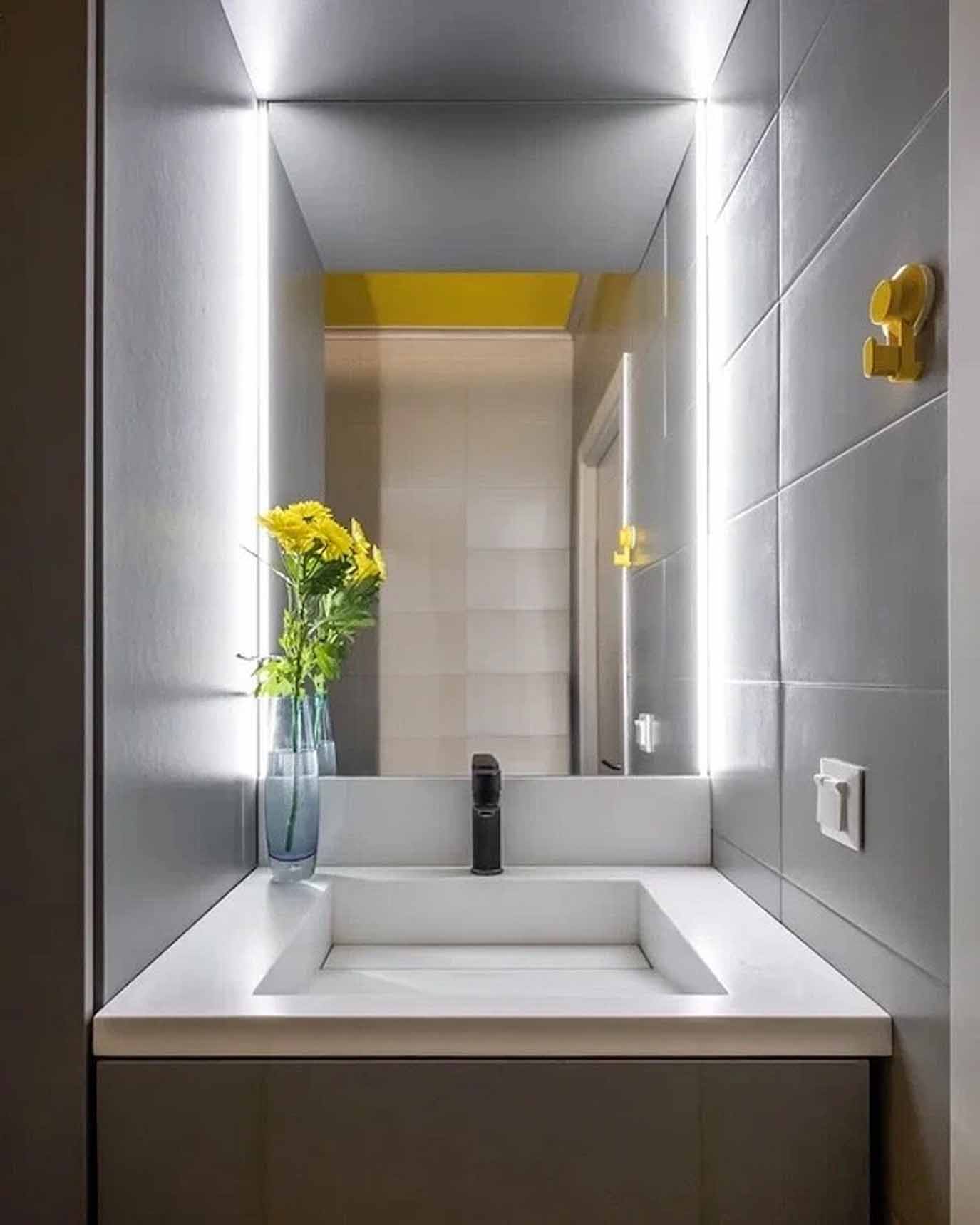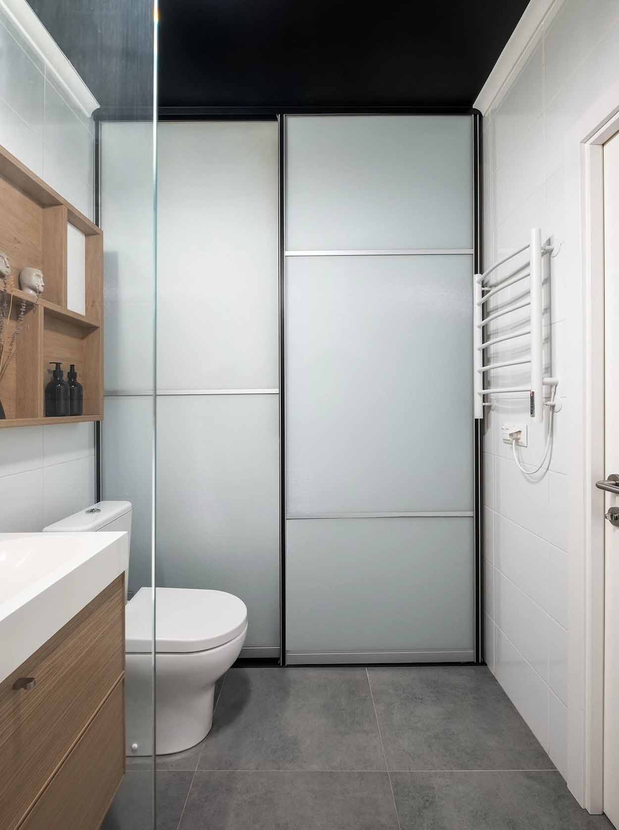 A vizesblokkokban megőrizték az alapvető burkolatokat, de látványos mennyezetfestéssel frissítették fel őket: a fürdőszoba fekete, míg a mosókonyhával kombinált WC élénksárga mennyezetet kapott. A fürdőben a mosdó alatti szekrény és egy tolóajtós tároló biztosít helyet a tisztálkodószereknek. A különálló mellékhelyiségben egy modernizált, mosógépet és mosdót is befogadó szekrényrendszert alakítottak ki, amely rendszerezetté és átláthatóvá teszi a háztartási eszközök tárolását.