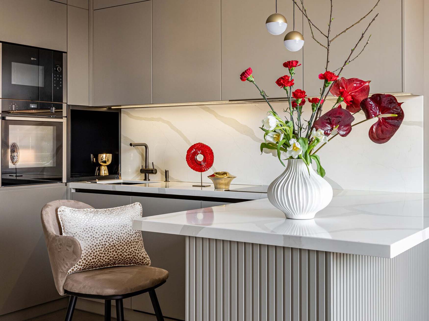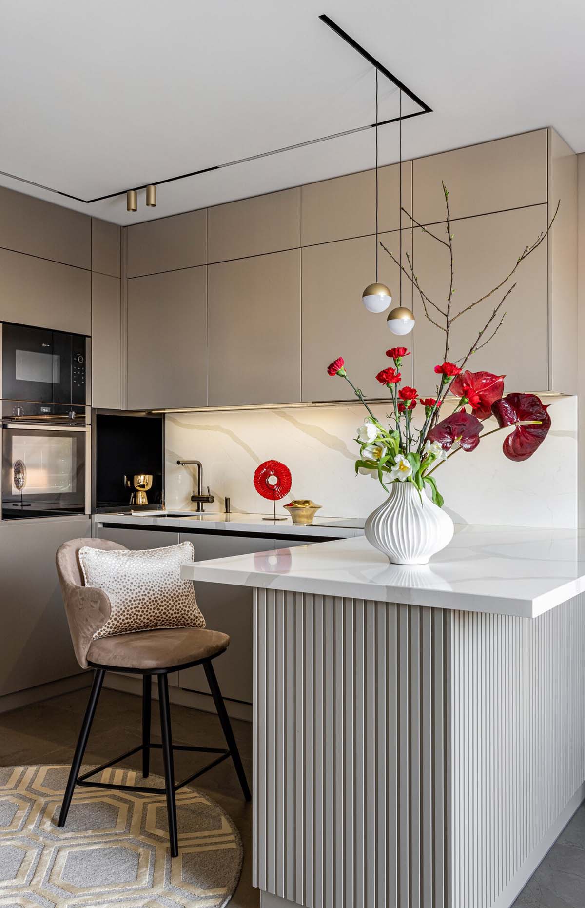 A konyhabútor egyedileg, asztalosmunkával készült, a tárolókapacitás maximalizálására törekedve. A padlótól mennyezetig érő, oszlopszerű elemek és a felső szekrénysor optimális térkihasználást biztosítanak. A nagyméretű félsziget nem csupán plusz munkafelületet és étkezőasztalt kínál, hanem a lakás közösségi életének centrumaként is szolgál.