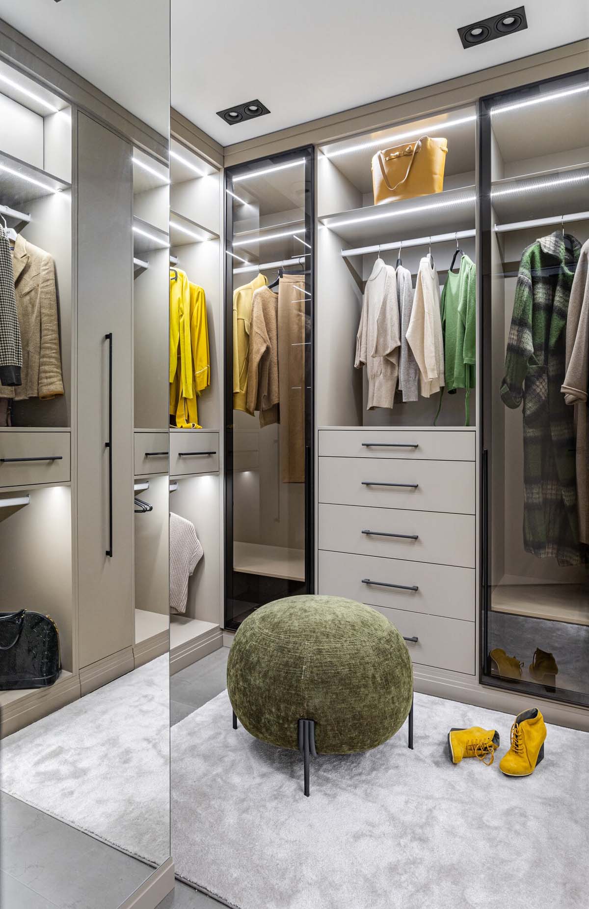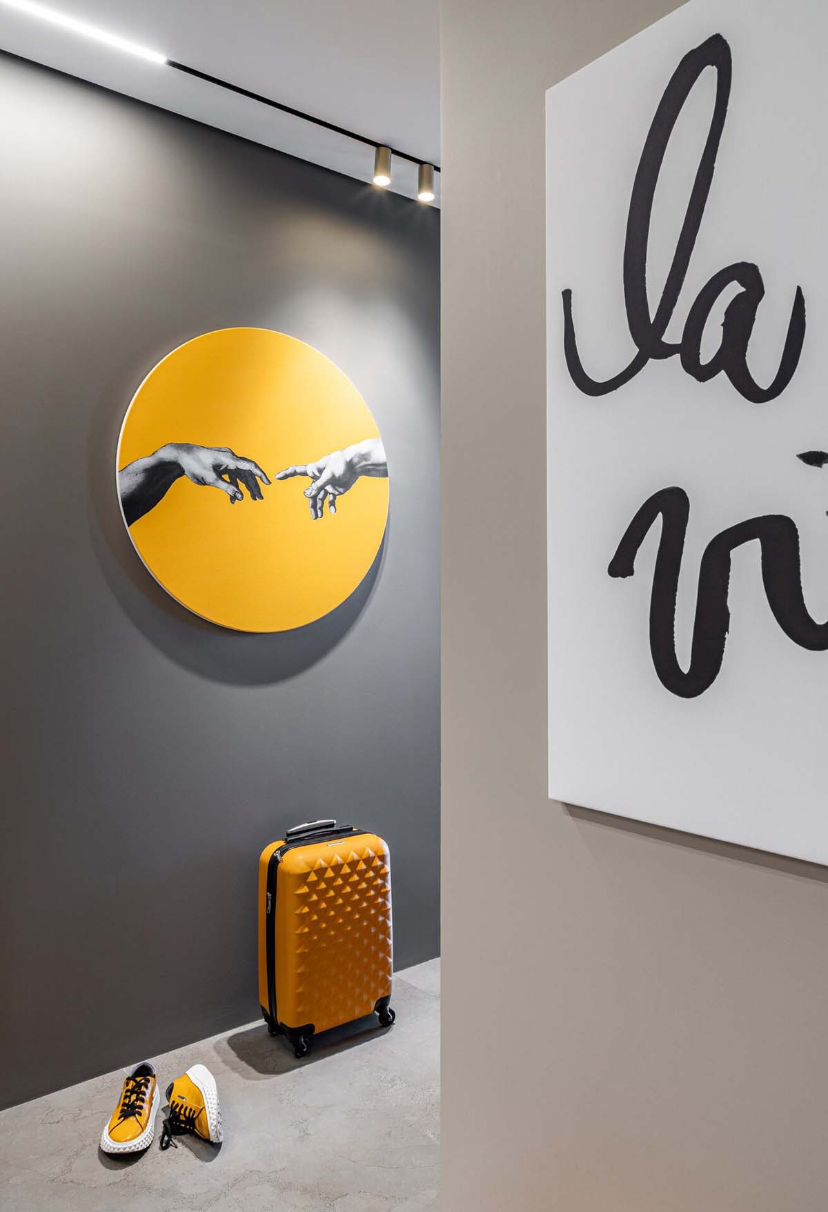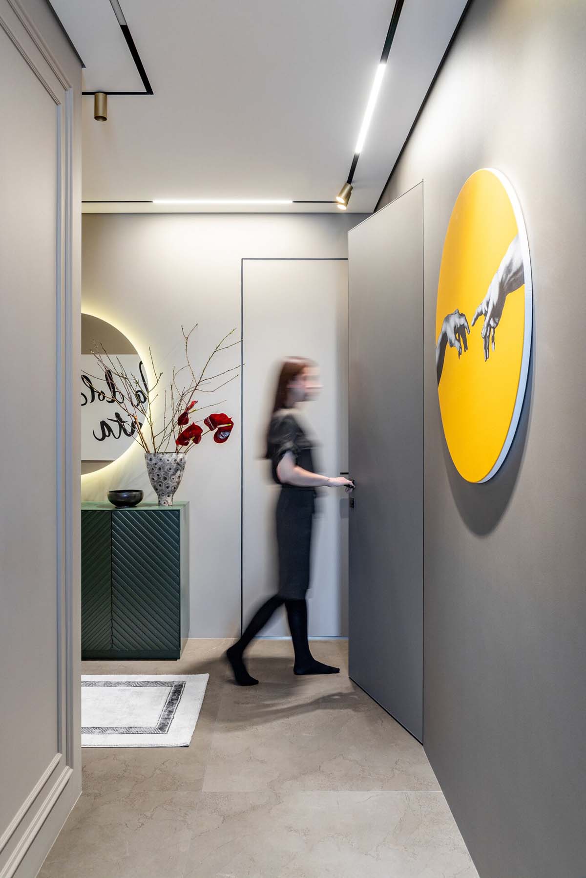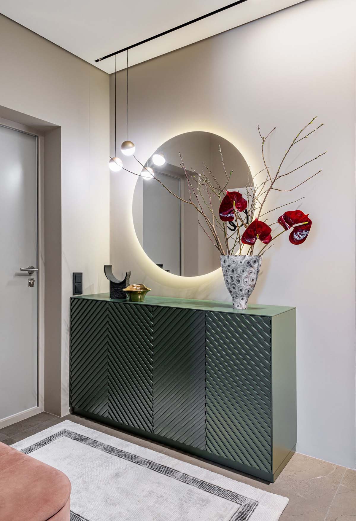 Az előszoba azonnal bevezet a lakás színvilágába és stílusába: világos, szürkés árnyalatú falak, mélyzöld komód, nőies, poros pink ülőke, modern vonalak és formák. A lakás egyik fénypontja a tágas, üvegajtós, jól átlátható gardróbszoba, ahol minden négyzetcentimétert a tárolás szolgálatába állítottak. A teljes berendezés egyedi asztalosmunka, amely a költségvetés jelentős részét tette ki.