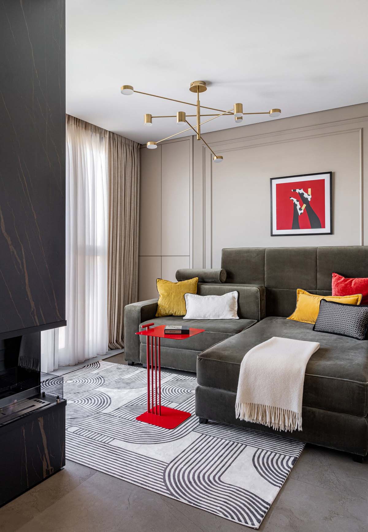 A legizgalmasabb tervezői kihívást a két helyiség összenyitása után a nappali közepére került tartóoszlop jelentette. Ezt a statikai elemet egy multifunkcionális térelemmé alakították, amely magában foglalja a biokandallót, a könyvespolcokat és a TV-t is. Ez a megoldás finoman zónázza is a teret, kijelölve a kanapé körüli pihenőrészt.