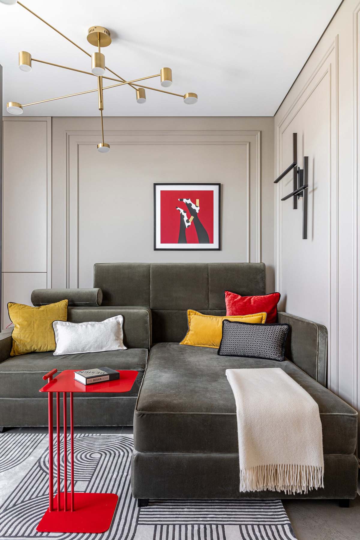 A falak a „greige” népszerű árnyalatát kapták – ez az elnevezés az angol „grey” (szürke) és „beige” (bézs) szavak ötvözete, és egy elegáns, semleges szürkés-bézs tónust jelöl. A bársony kárpitozású kanapé a kifakult olíva tompított zöldjében pompázik, a kézzel készített, élénk színű díszpárnák pedig játékosságot csempésznek az összhatásba.