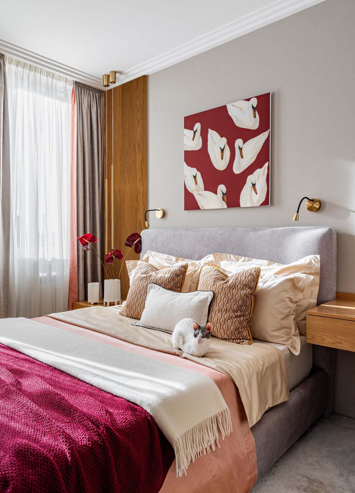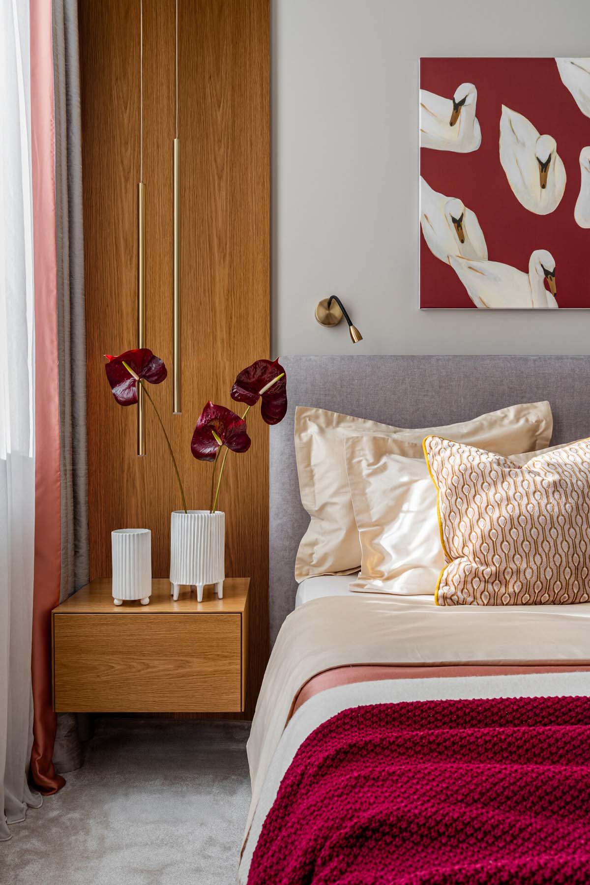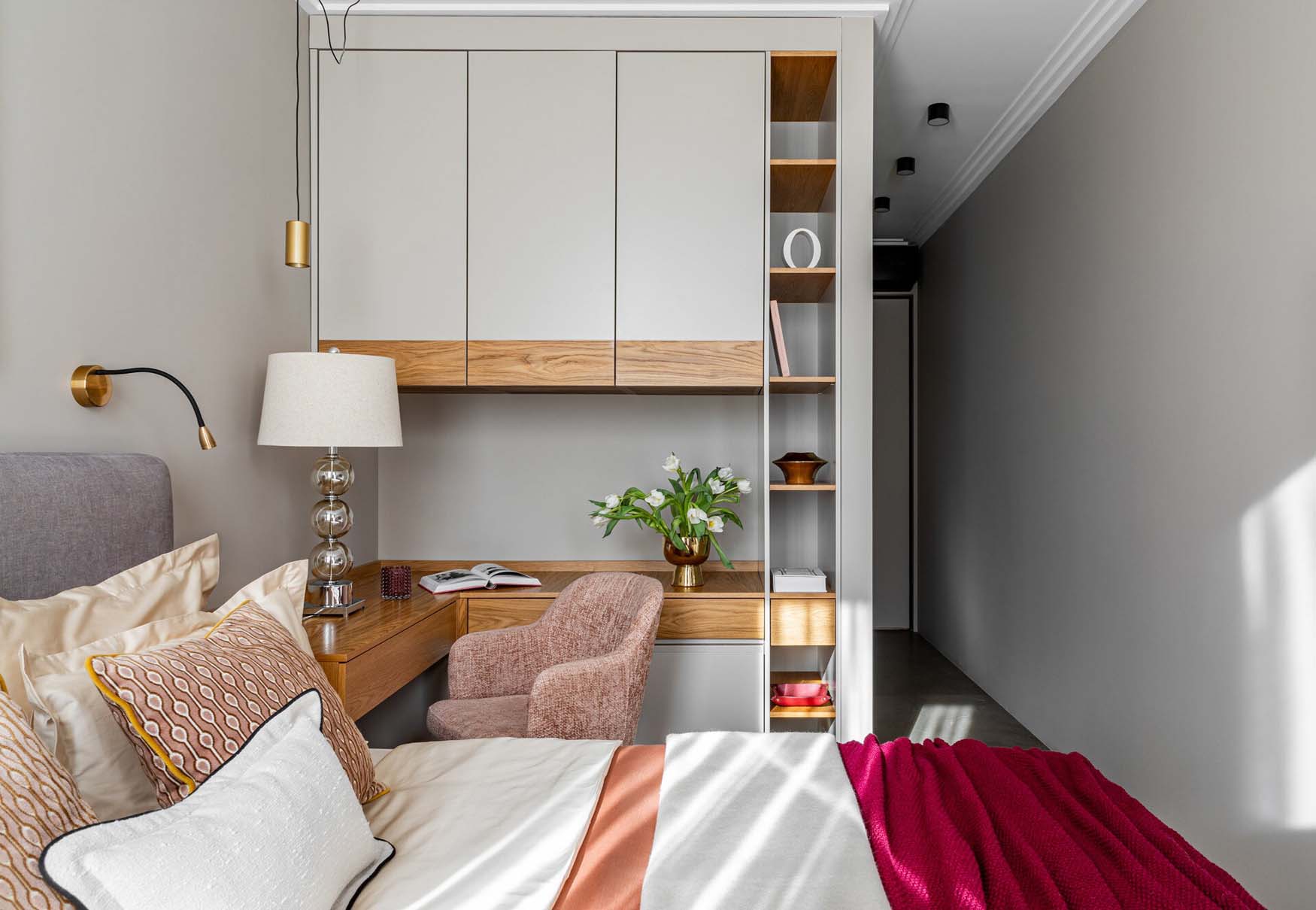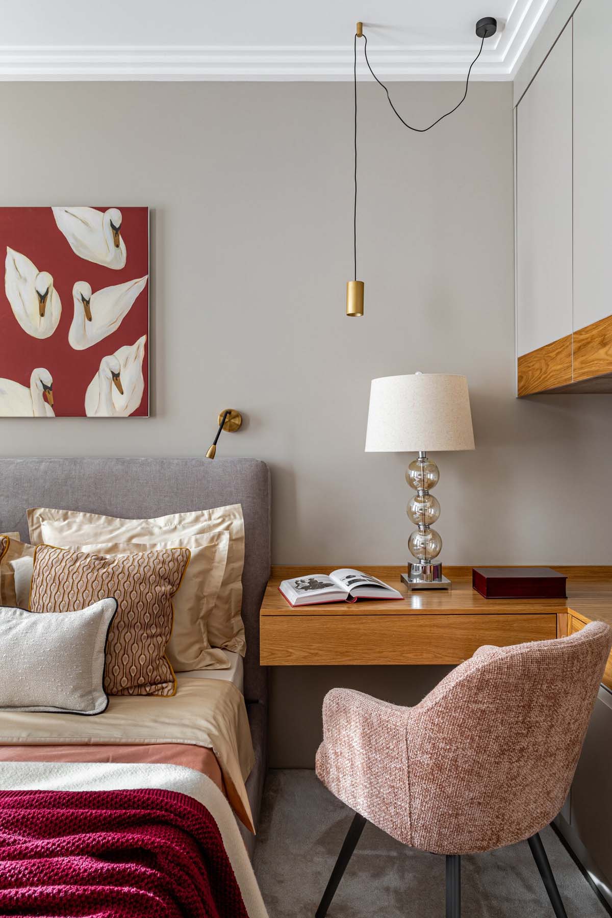 A hálószobában a puha, szövettel kárpitozott ágytámla és a rétegzett, finom textíliák otthonosságot sugároznak. A „greige” falak és a meleg tölgyfa furnér panelek harmonikus egységet alkotnak, amelyet az egyedi világítási megoldások – a falikarok és a sárgaréz függesztékek – tesznek még hangulatosabbá. A térkihasználás itt is példaértékű: a beépített szekrények egy kompakt dolgozó- vagy fésülködősarkot is magukban foglalnak.