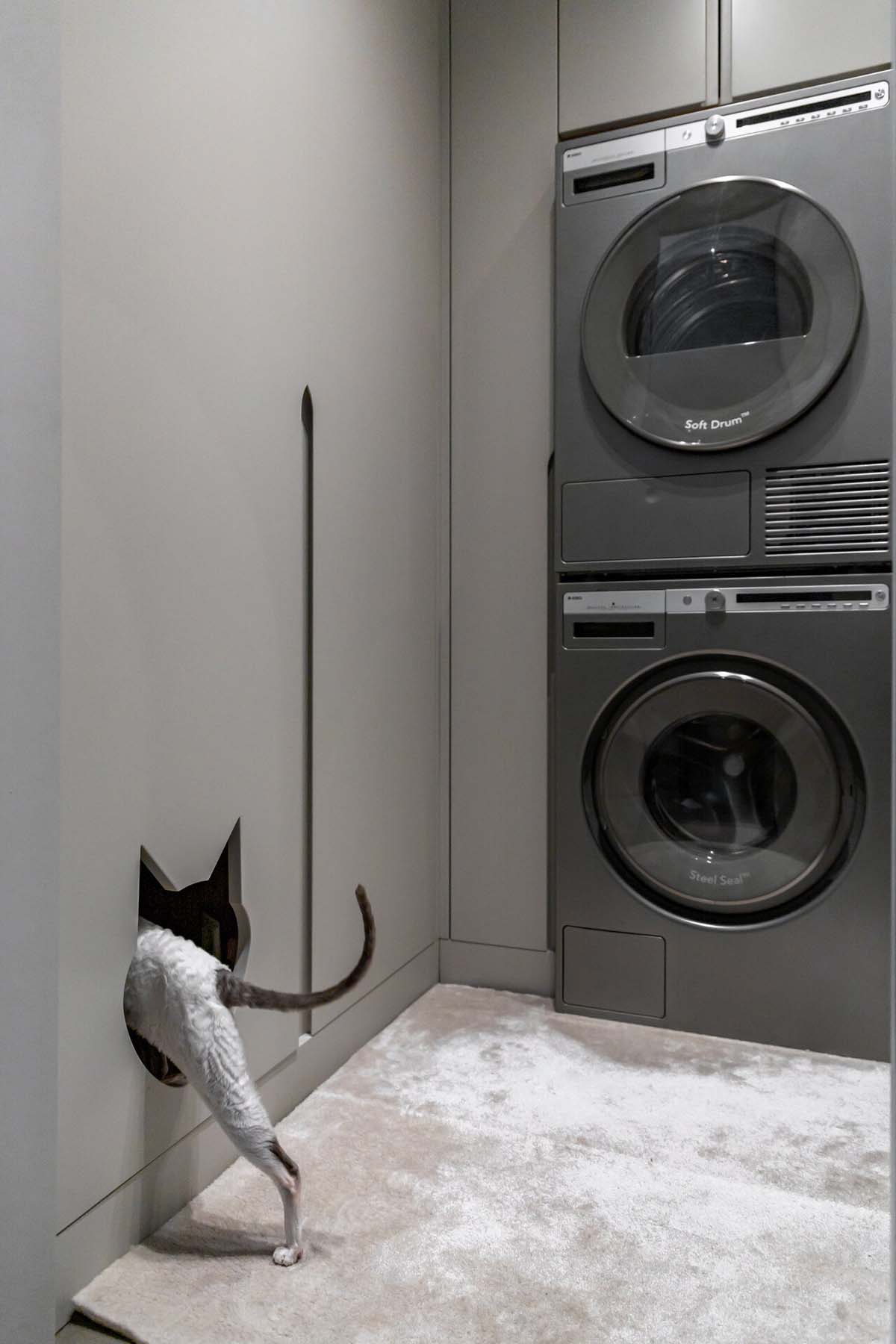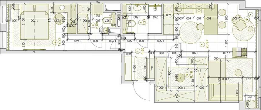 A lakás alaprajza, a hosszanti elrendezésű, keskeny forma gyakori, ugyanakkor a tervezők számára az egyik legnagyobb kihívást jelentő típus. Előnye azonban, hogy a lakás két homlokzatán is vannak ablakok, ami lehetővé teszi a kereszthuzatot, így a természetes átszellőztetés is hatékonyabb. A tulajdonos legfőbb kérései egy tágas gardróbszoba, egy különálló mosókonyha és egy konyhasziget voltak. A végső elrendezés így egy kompakt konyha-nappaliból, hálószobából, előszobából, mosókonyhából, gardróbból és fürdőszobából áll.