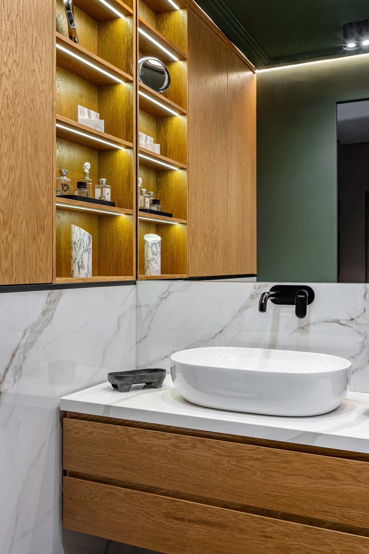 A lakás egy kreatív, a dizájn területén dolgozó fiatal hölgy otthona. Az enteriőr alaphangulatát a tompított zöld és szürke tónusok adják meg, amelyek olyan természetes árnyalatokat idéznek mint a a puha moha, a füstös eukaliptusz és az elegáns grafit. Ezek a nyugodt színek harmonikus hátteret biztosítanak, amelyen különösen hatásosan érvényesülnek a változatos textúrák és az élénk színfoltok.