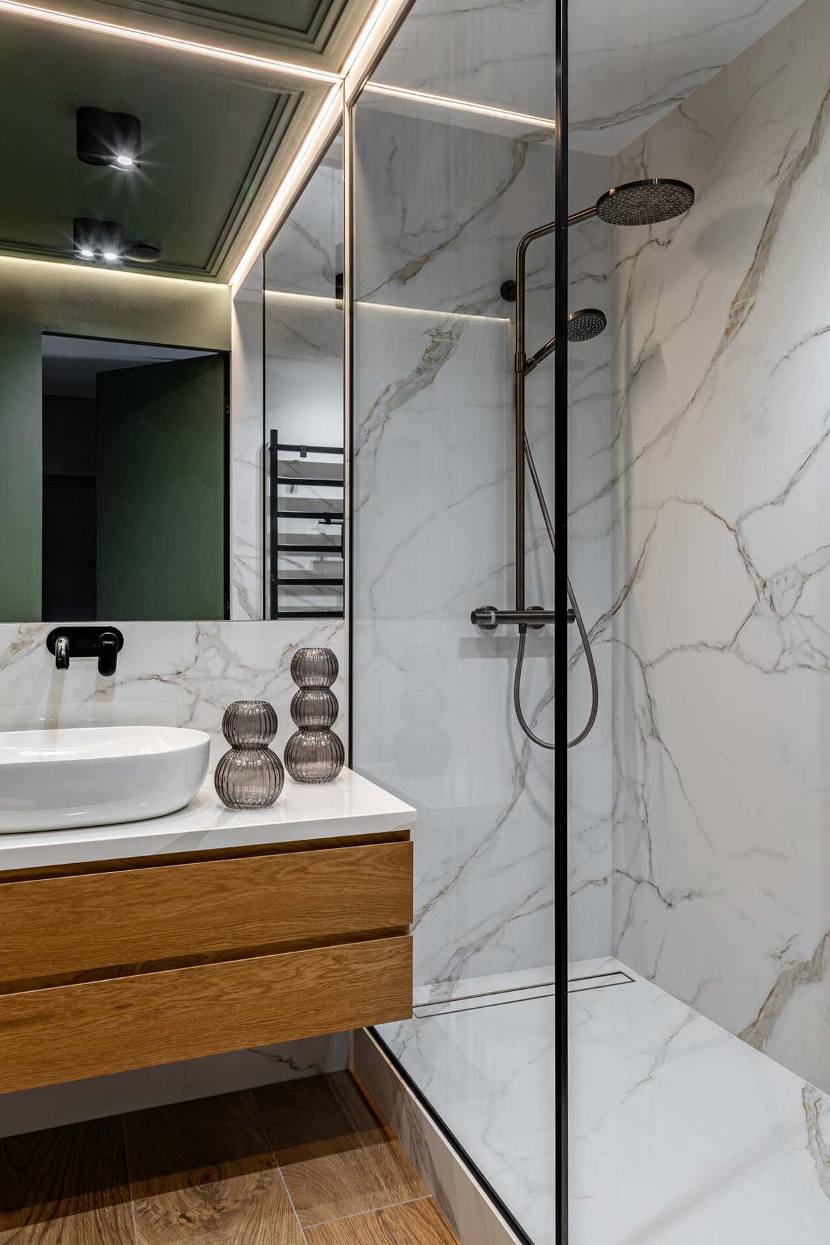 A fürdőszobában egy nagyméretű, épített zuhanykabin és számos rejtett tároló biztosítja a funkcionalitást. A kényelmes méretű mosdópult tágas rakodófelületet kínál a mindennapi készülődéshez. A gondosan megválasztott, modern burkolatok egységes és letisztult megjelenést kölcsönöznek a helyiségnek, kellemes atmoszférát teremtve ebben az intim térben.