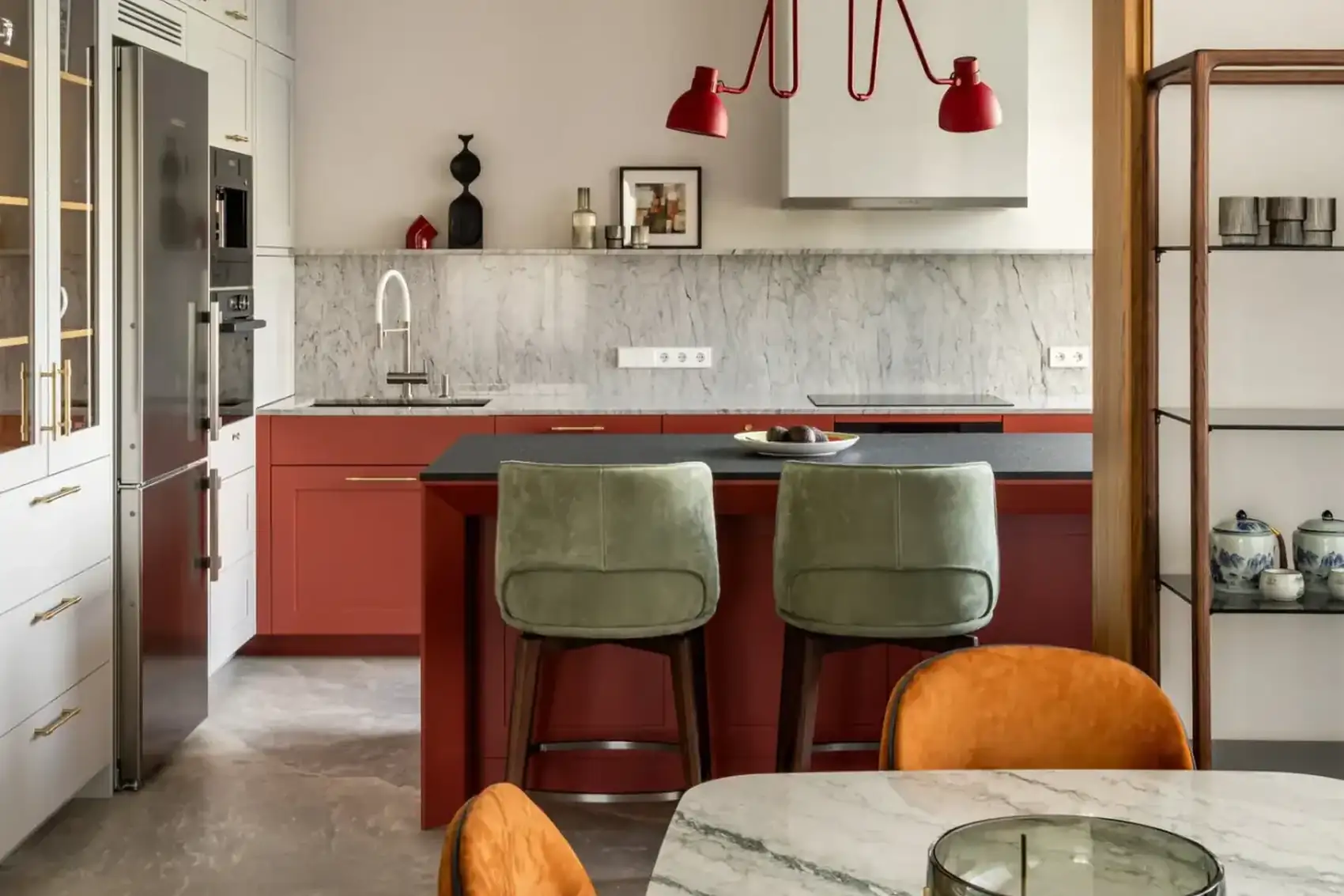 A konyha padlóburkolata egységes az előszobáéval, ám itt a tér igazi fókuszpontja a középen elhelyezett sziget. Különleges, téglavörös színe és fekete munkalapja valóságos kortárs műtárggyá emeli az elemet, miközben ideális teret nyújt a reggeli kávézáshoz, a főzéshez és a társasági élethez is. A sziget fölé függesztett játékos, hangsúlyos lámpa fénye lágyítja a dizájn szigorú vonalvezetését. A hideg szürkésfehér és fáradt terrakotta tónusokkal tervezett, egyedi konyhabútor esetében a felső szekrényeket elhagyták. A tárolást az alsó részeken, illetve a szomszédos fal mentén végigfutó, beépített szekrényekben oldották meg. Különleges belsőépítészeti finomság a márvány munkalap, amely elegánsan fut fel a hátfalra, majd egy keskeny peremként, polcként folytatódik a teljes munkafelület mentén.