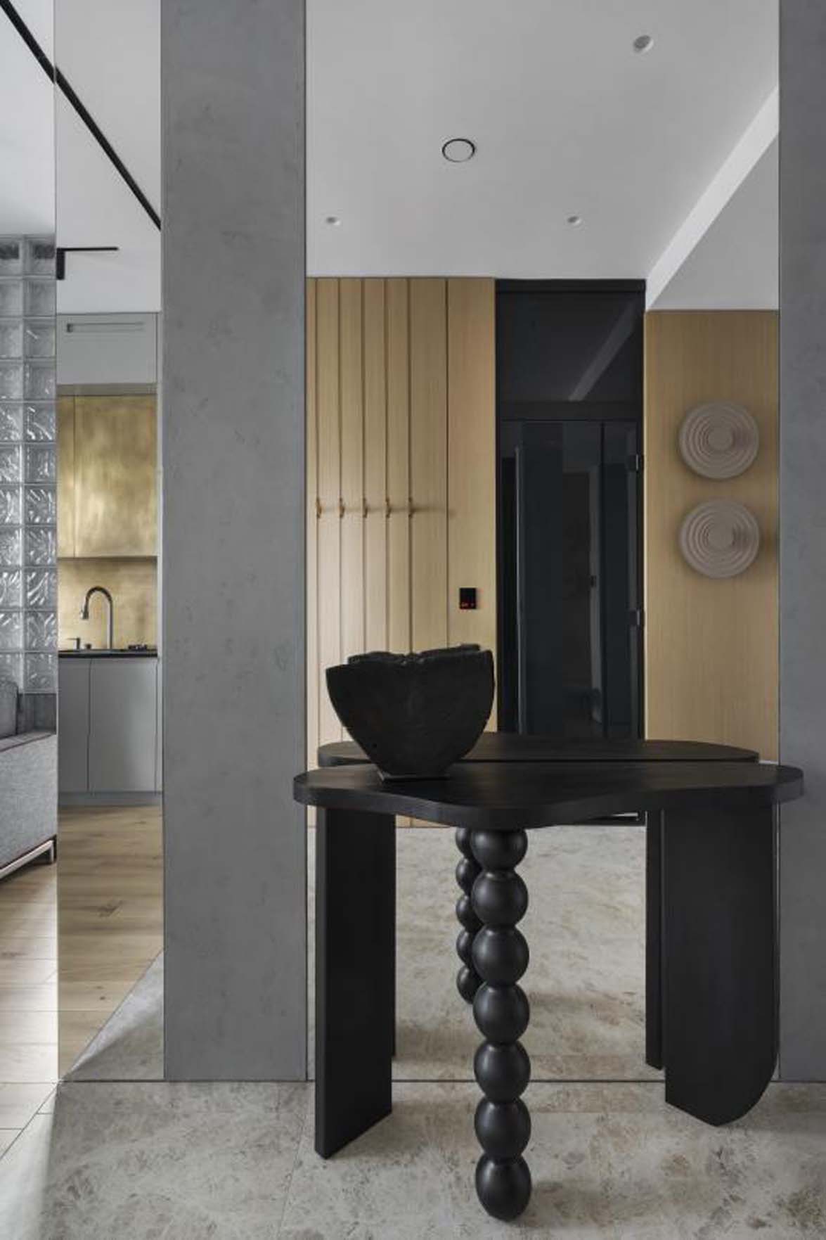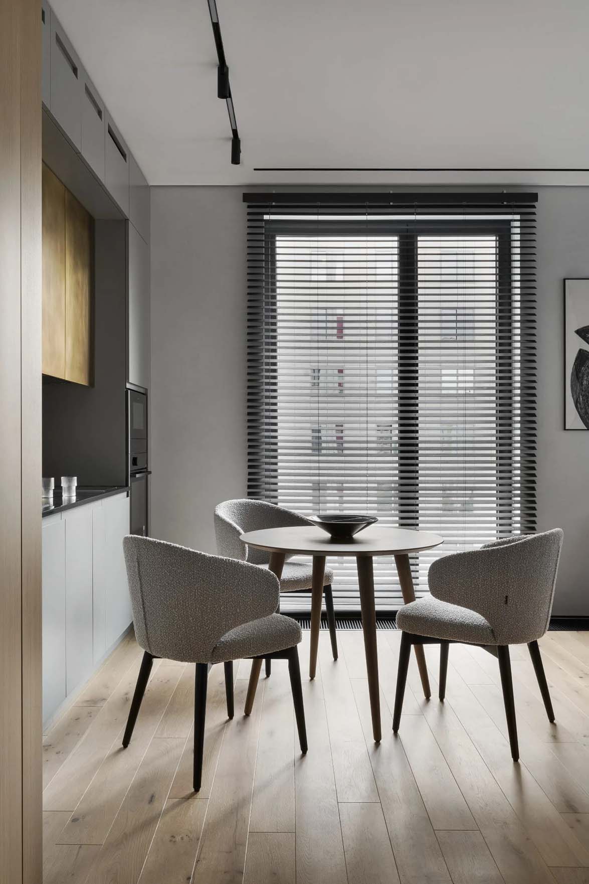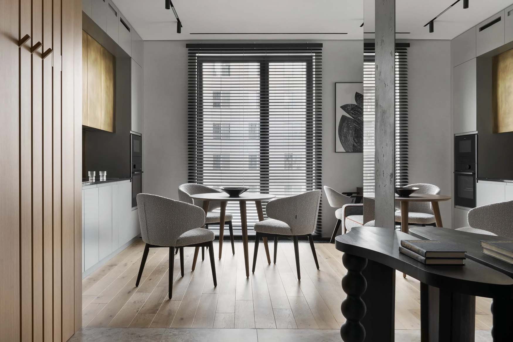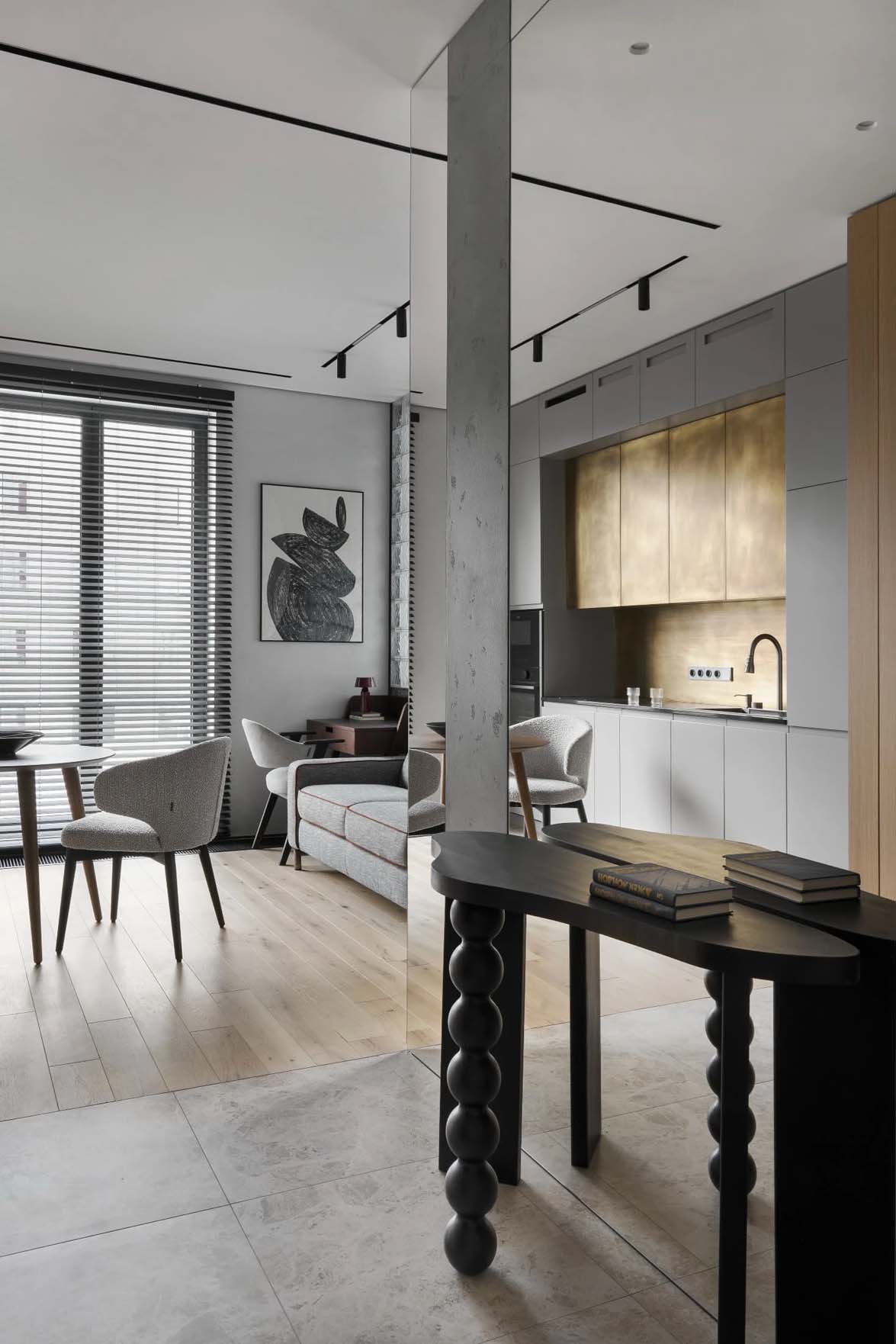 A legénylakásnak berendezett új ingatlant lakóparkban vásárolta a férfi. A merész megbízó nyitott volt a lakberendező kísérletező ötleteire és javaslataira. Az egyetlen szigorúbb kikötés az időtálló karakter megteremtése volt, amellyel az otthon hosszú éveken át aktuális maradhat. A tulajdonos már az első bemutatón rábólintott a letisztult koncepcióra, így a munka hamarosan kezdetét is vette.