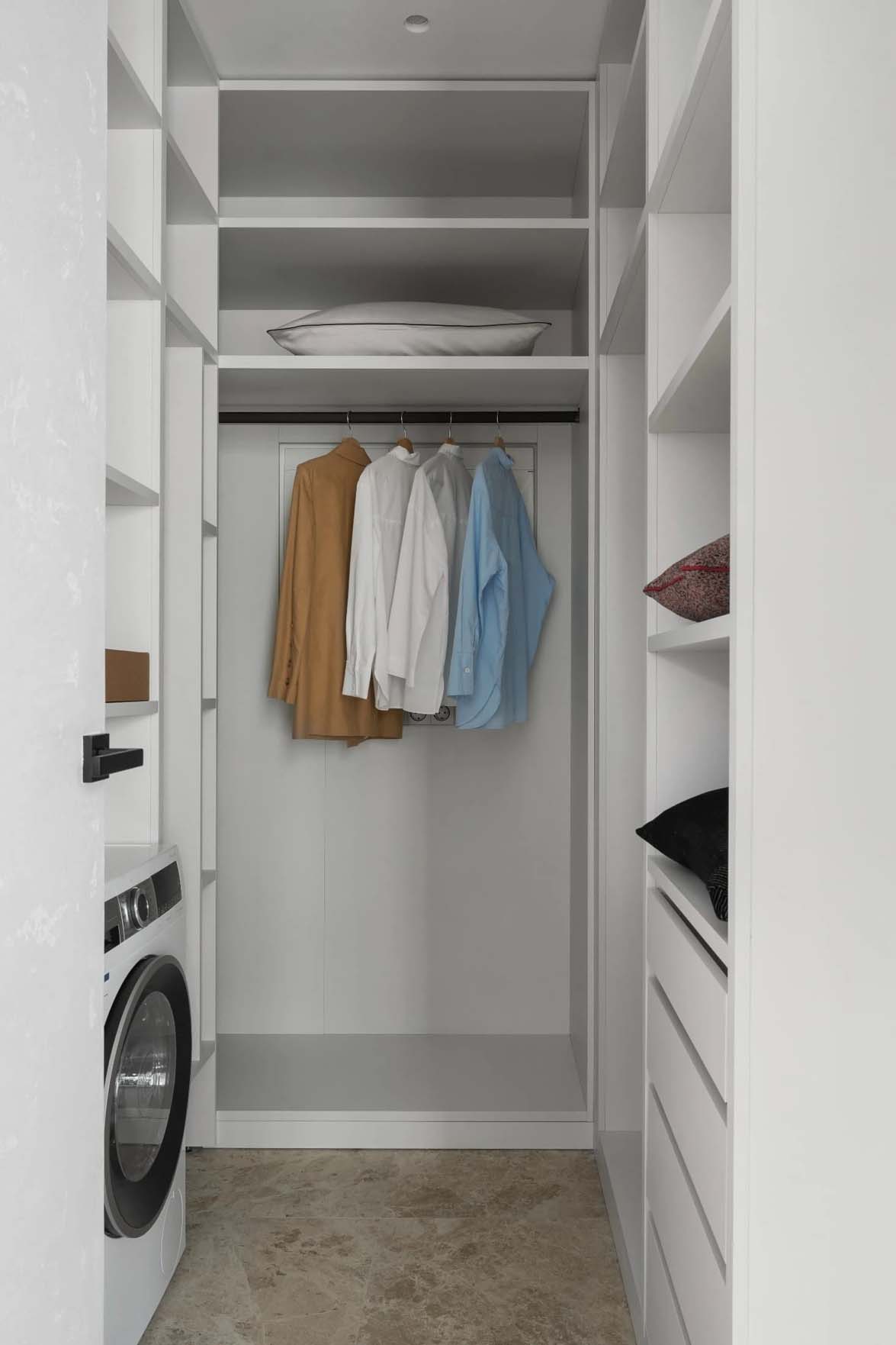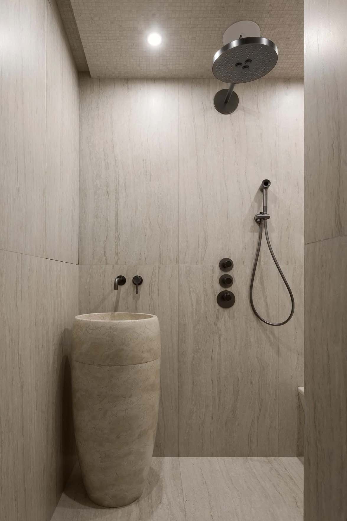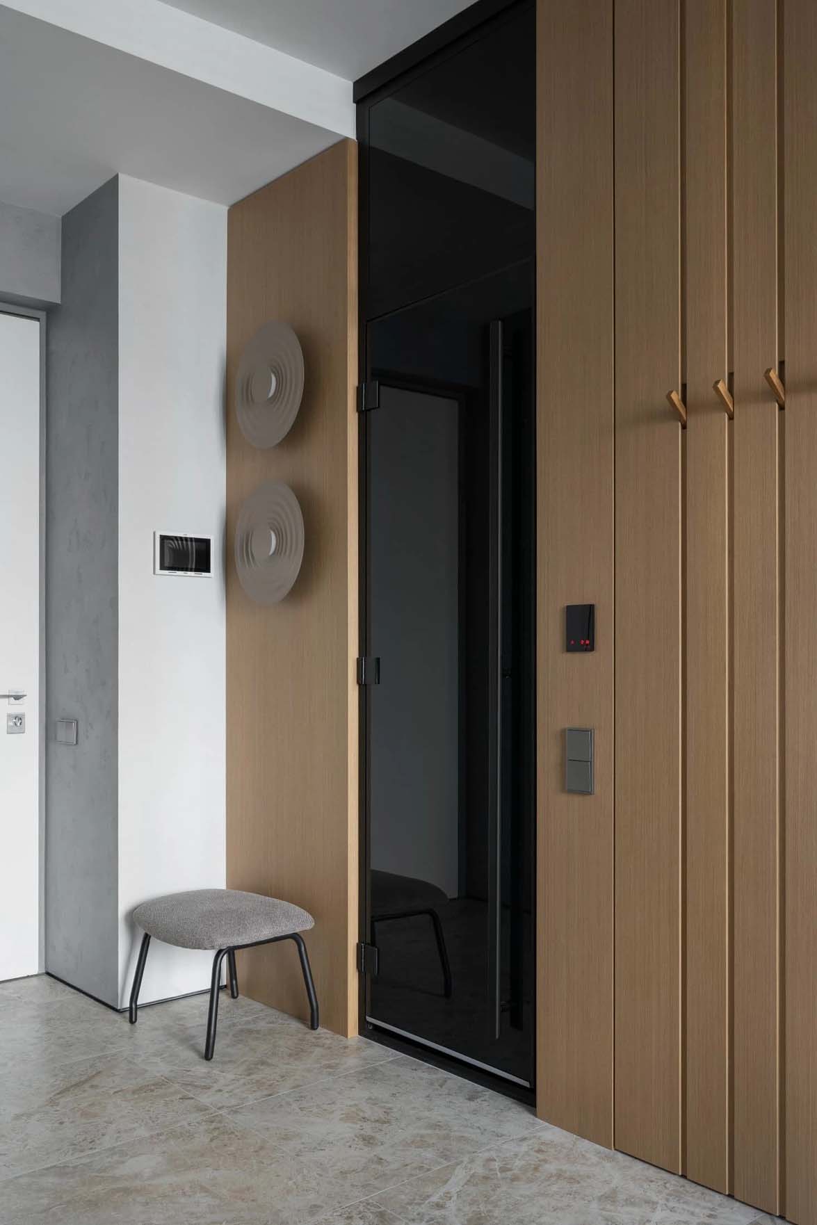 „A fal síkjába simuló ajtó egy tágas gardróbot és egy kompakt mosókonyhát rejt. A projekt igazi különlegessége a teljes értékű hammám, ami ritkaságszámba megy egy ekkora lakásban. A fekete üvegajtó a mennyezetig fut, amelynek funkcionális szerepe is van: segít eltakarni a födém szerkezeti adottságait, miközben megőrzi a design koncepció letisztultságát.”