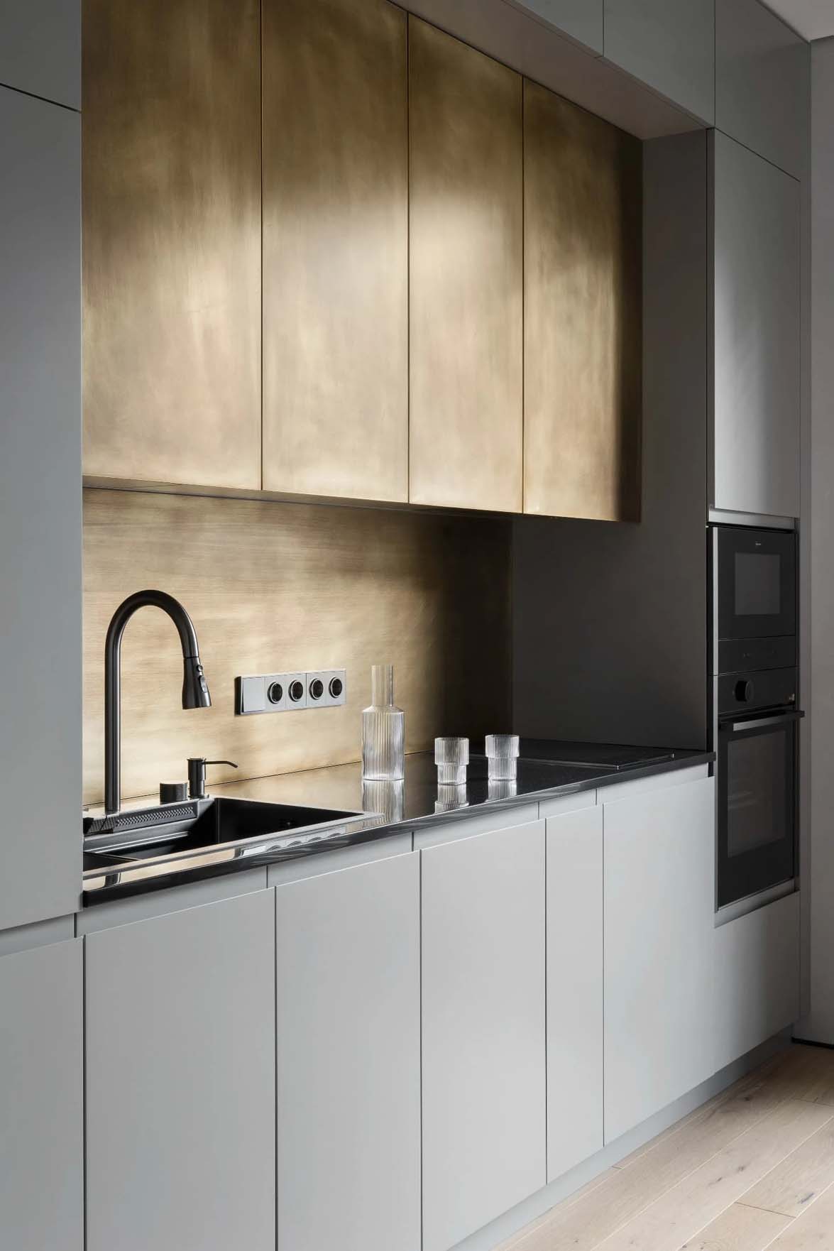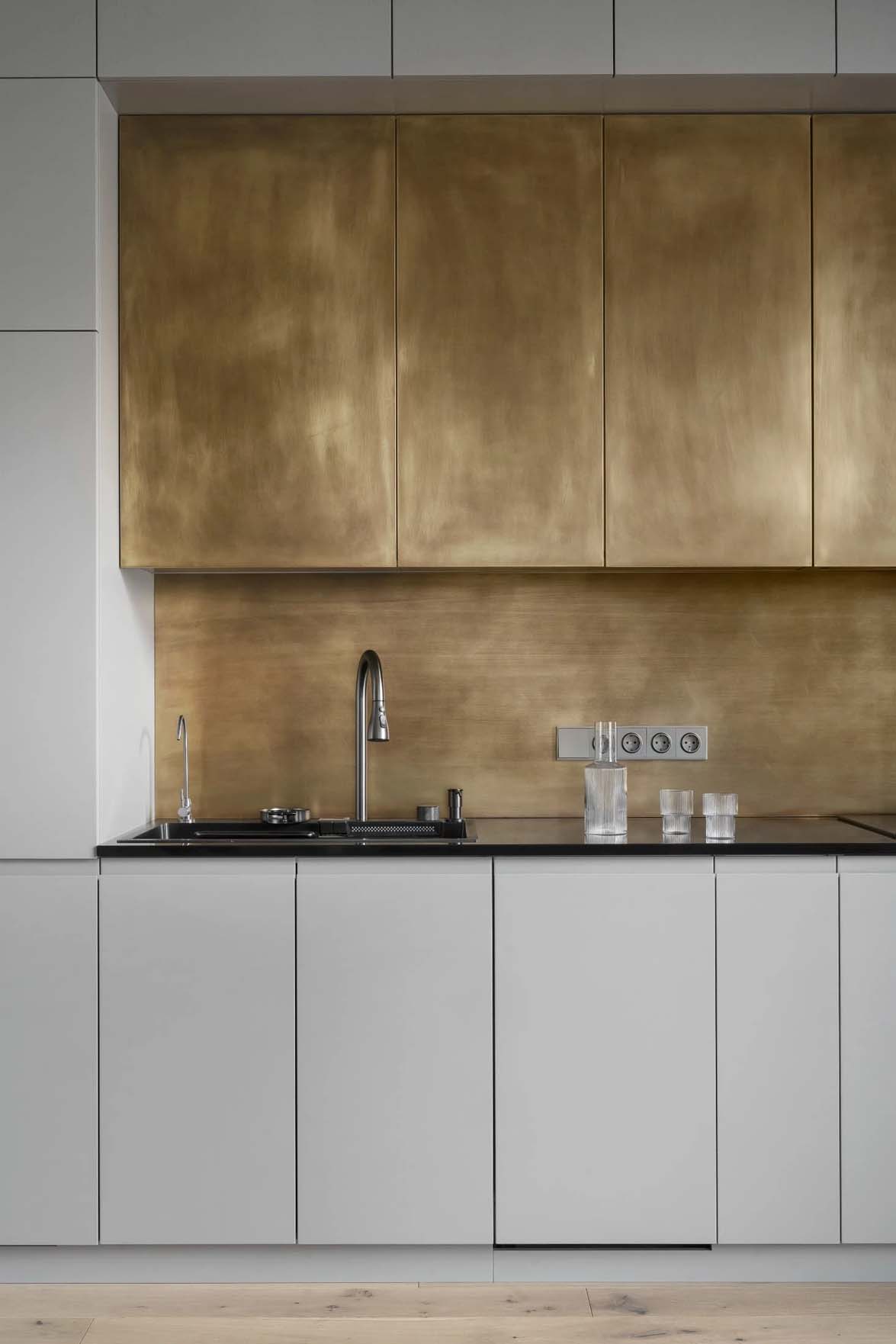 „A tulajdonos személyiségét talán a kísérletező szellemű konyha tükrözi a leginkább: a hátfalat és a felső szekrényfrontok egy részét a fém izgalmas textúrája teszi hangsúlyossá. A megvalósítás komoly fejtörést okozott: felmerült a fémes hatású dekorvakolat, majd a folyékony fém alkalmazása is. Végül a választás a patinázott sárgarézre esett, amely a tartósság érdekében védőréteget kapott. A semleges tónusú étkezőcsoport és a kényelmes kanapé finom ellenpontot képeznek ezzel a karakteres felülettel szemben.”